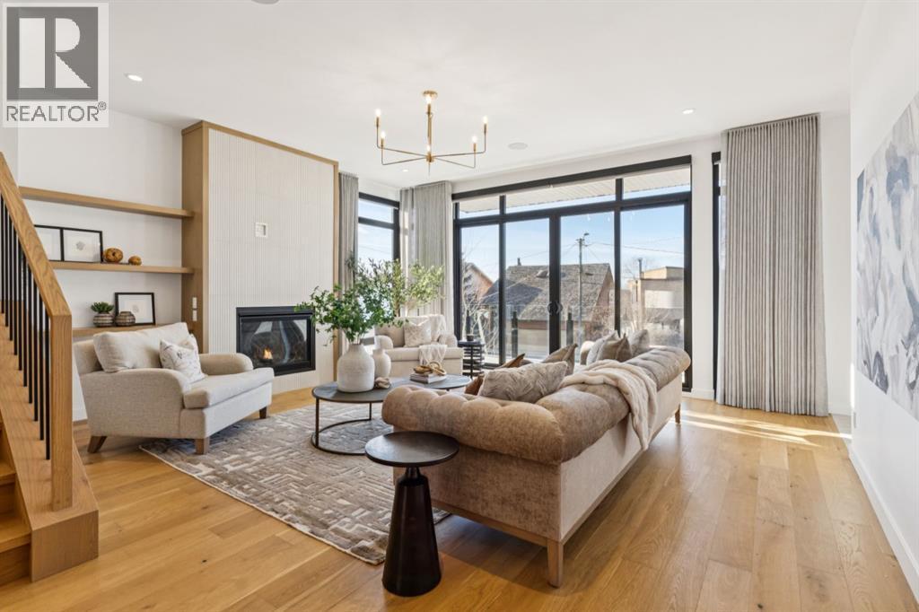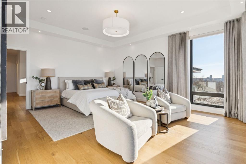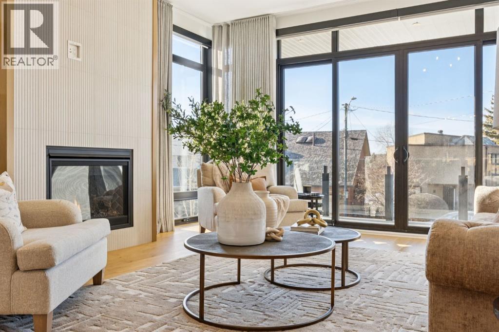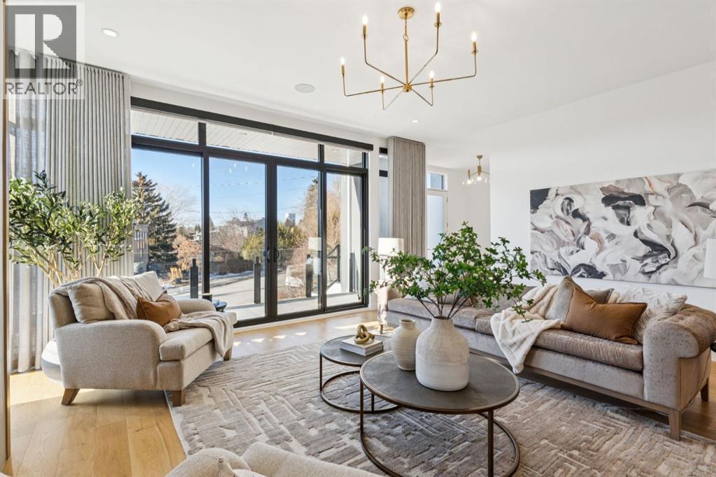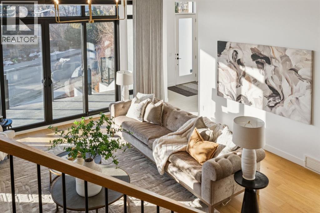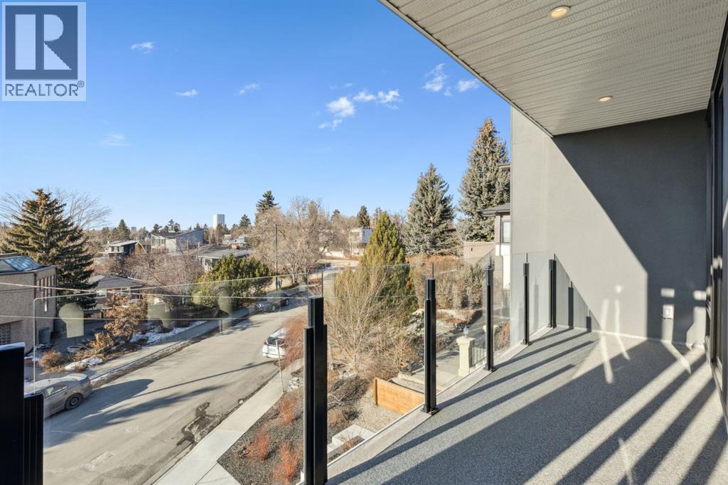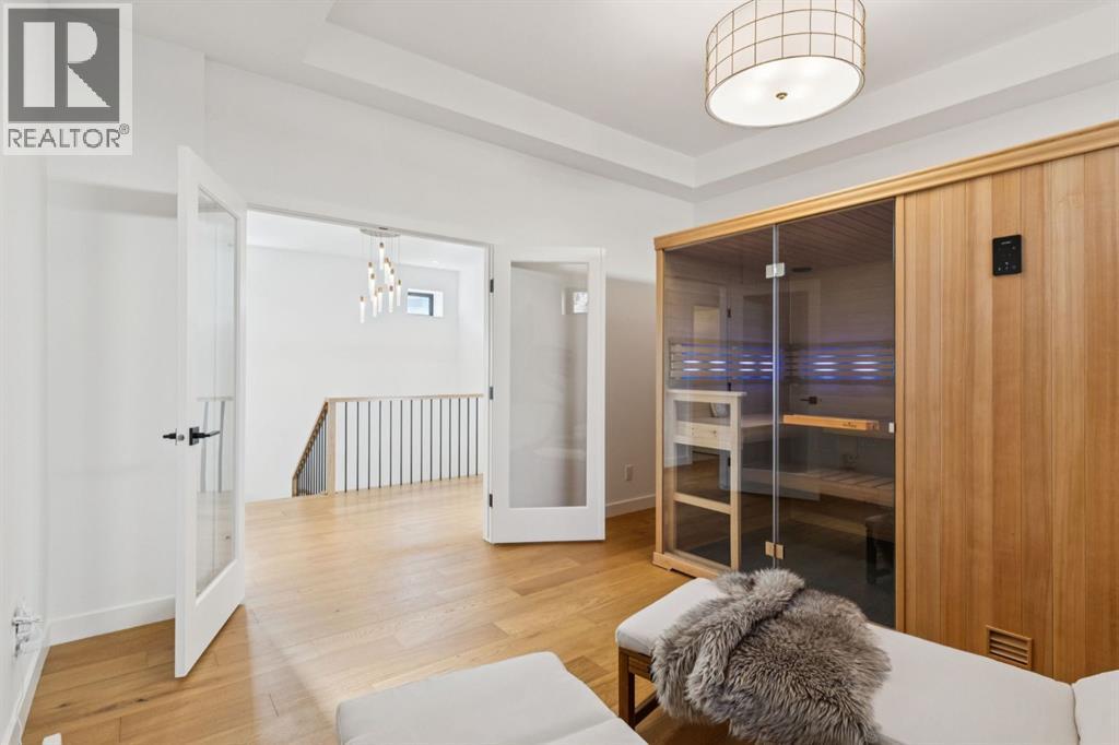 An extraordinary hillside sanctuary awaits in the exclusive inner-city community of Briar HiIl. Ideally located on a peaceful street, this fabulous home offers over 4,600 square feet of contemporary living space and sweeping views of the city skyline and the Rocky Mountains. Sunlight streams through floor-to-ceiling windows, filling the open main floor all day with natural light. A heated porcelain-tiled foyer, 10 ft. ceilings, and wide-plank white oak floors throughout provide warmth and sophistication. Relax by the modern gas fireplace on quiet winter evenings with a book or connect with friends and family on the deck.. The chef’s dream kitchen features a large quartz-topped island with cabinetry on both sides, ideal for meal prep and casual dining. Premium Italian-designed Fulgor Milano appliances—including a professional 6-burner gas stove, an integrated warming drawer, and a combi speed oven—make entertaining seamless. The butler’s pantry adds functionality with an additional counter space, storage, and a wine/beverage fridge for extra convenience. Host memorable dinners in the expansive dining room, with sliding doors to a private back patio and backyard, which is perfect for BBQ's and al fresco dining in warmer months. The private office, accessible from the kitchen and backyard, is filled with morning light and offers a tranquil, creative workspace. Upstairs, the serene primary suite impresses with a 10-foot tray ceiling and a second balcony with west-facing mountain views. A cozy seating area is perfect for morning coffee, watching the city wake, and enjoying the incredible, vibrant Calgary sunsets. The luxurious ensuite has a massive double steam shower with a bench, heated floors, oversized soaker tub, dual vanities, and a large walk-in closet. Begin and end your day with relaxation and rejuvenation in the wellness room, featuring an authentic Finnish sauna with a Bluetooth sound system. Two additional bedrooms with oversized windows, spectacular city vi ews, and walk-in closets provide comfort for family or guests. A convenient laundry room with sink and storage completes the upper level. The lower level includes a spacious rec room with a wet bar, a beverage fridge, and flex space for game tables or workouts. The entertainment area is ideal for movie nights or big game day parties. The fourth bedroom and full bath provide guests with privacy and ease. Two massive storage rooms and a large mudroom lead to the oversized 698 sq. ft. heated double garage, with even more storage or a spot for a workshop. Additional highlights include a Sonos audio system, Hunter Douglas electronic window coverings, Lutron integrative lighting, hydronic in-floor heating in the basement, and central air conditioning. Only 10 minutes from downtown, a 20-minute walk to shops and restaurants in Kensington, and steps from walking paths on the hillside. Experience luxury, comfort, and breathtaking surroundings—this is the quintessential urban lifestyle you’ve been waiting for! (id:6769)