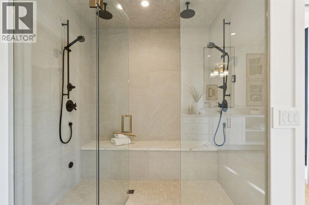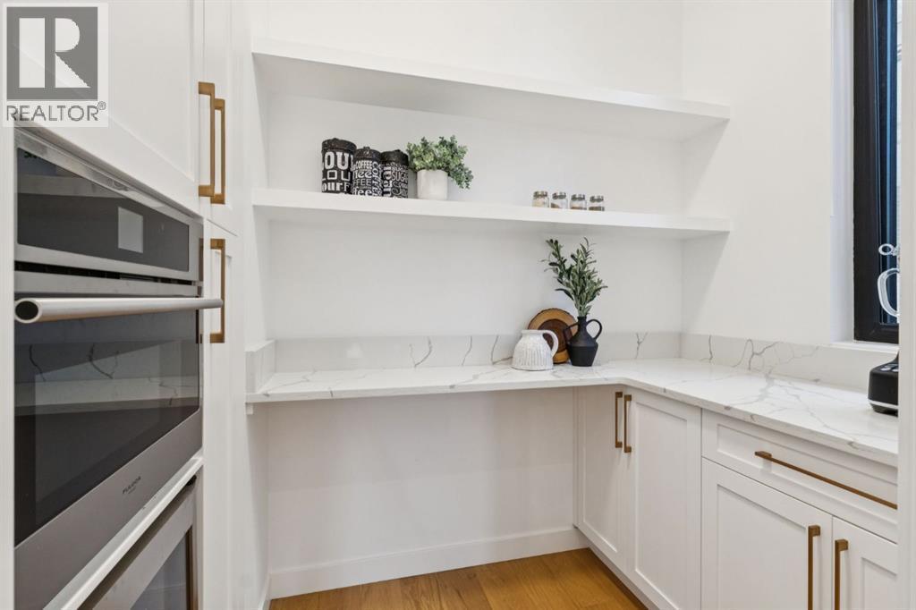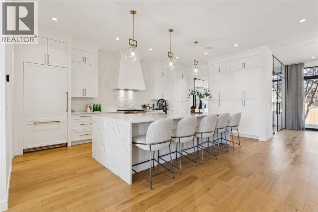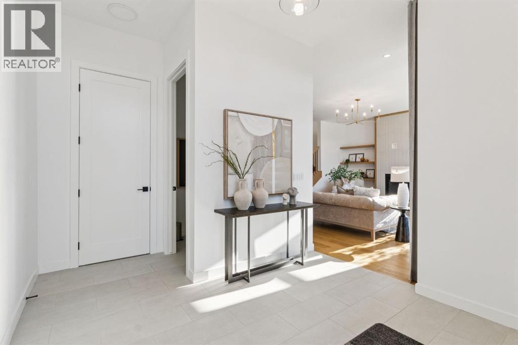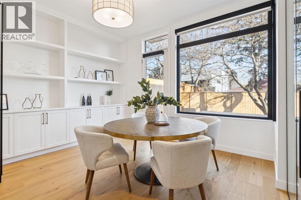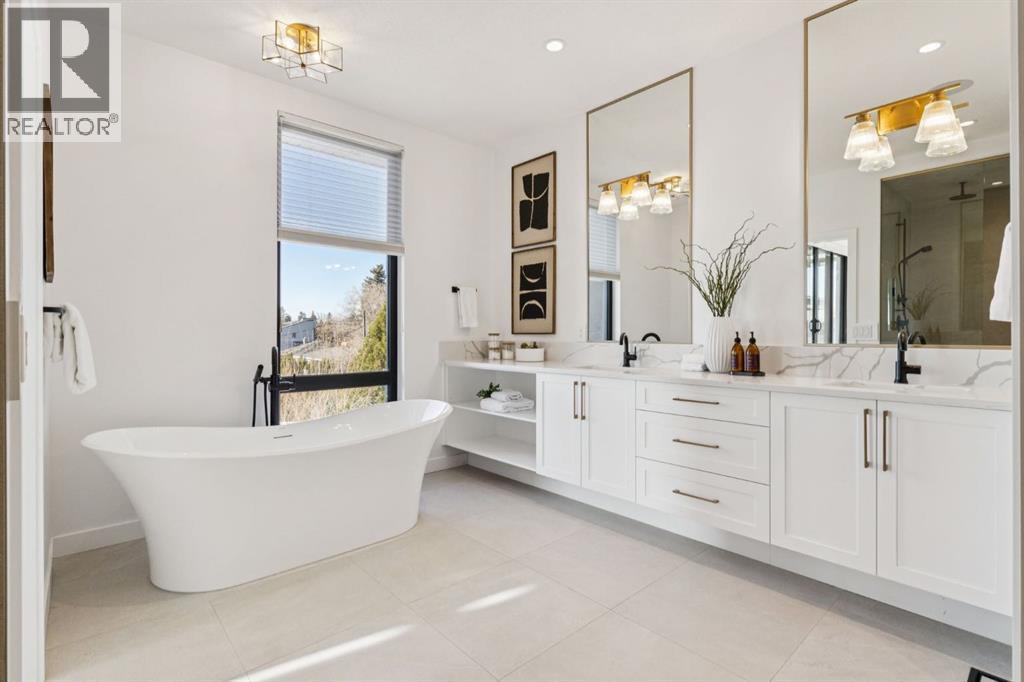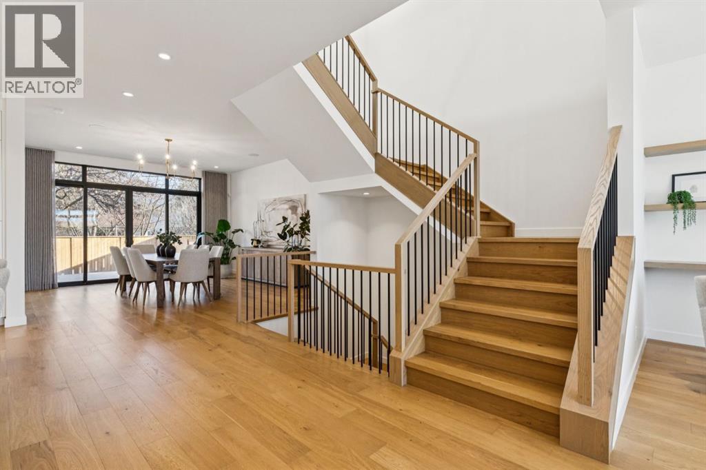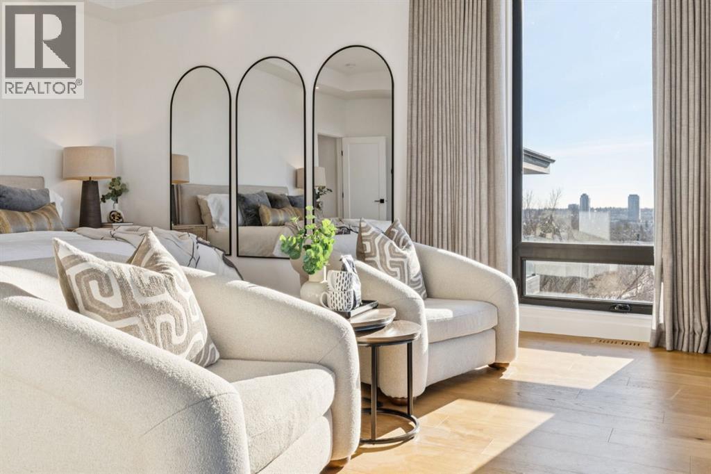 An extraordinary hillside sanctuary awaits in the exclusive inner-city community of Briar HiIl. Ideally located on a peaceful street, this fabulous home offers over 4,600 square feet of contemporary living space and sweeping views of the city skyline and the Rocky Mountains. Sunlight streams through floor-to-ceiling windows, filling the open main floor all day with natural light. A heated porcelain-tiled foyer, 10 ft. ceilings, and wide-plank white oak floors throughout provide warmth and sophistication. Relax by the modern gas fireplace on quiet winter evenings with a book or connect with friends and family on the deck.. The chef’s dream kitchen features a large quartz-topped island with cabinetry on both sides, ideal for meal prep and casual dining. Premium Italian-designed Fulgor Milano appliances—including a professional 6-burner gas stove, an integrated warming drawer, and a combi speed oven—make entertaining seamless. The butler’s pantry adds functionality with an additional counter space, storage, and a wine/beverage fridge for extra convenience. Host memorable dinners in the expansive dining room, with sliding doors to a private back patio and backyard, which is perfect for BBQ's and al fresco dining in warmer months. The private office, accessible from the kitchen and backyard, is filled with morning light and offers a tranquil, creative workspace. Upstairs, the serene primary suite impresses with a 10-foot tray ceiling and a second balcony with west-facing mountain views. A cozy seating area is perfect for morning coffee, watching the city wake, and enjoying the incredible, vibrant Calgary sunsets. The luxurious ensuite has a massive double steam shower with a bench, heated floors, oversized soaker tub, dual vanities, and a large walk-in closet. Begin and end your day with relaxation and rejuvenation in the wellness room, featuring an authentic Finnish sauna with a Bluetooth sound system. Two additional bedrooms with oversized windows, spectacular city vi ews, and walk-in closets provide comfort for family or guests. A convenient laundry room with sink and storage completes the upper level. The lower level includes a spacious rec room with a wet bar, a beverage fridge, and flex space for game tables or workouts. The entertainment area is ideal for movie nights or big game day parties. The fourth bedroom and full bath provide guests with privacy and ease. Two massive storage rooms and a large mudroom lead to the oversized 698 sq. ft. heated double garage, with even more storage or a spot for a workshop. Additional highlights include a Sonos audio system, Hunter Douglas electronic window coverings, Lutron integrative lighting, hydronic in-floor heating in the basement, and central air conditioning. Only 10 minutes from downtown, a 20-minute walk to shops and restaurants in Kensington, and steps from walking paths on the hillside. Experience luxury, comfort, and breathtaking surroundings—this is the quintessential urban lifestyle you’ve been waiting for! (id:6769)