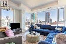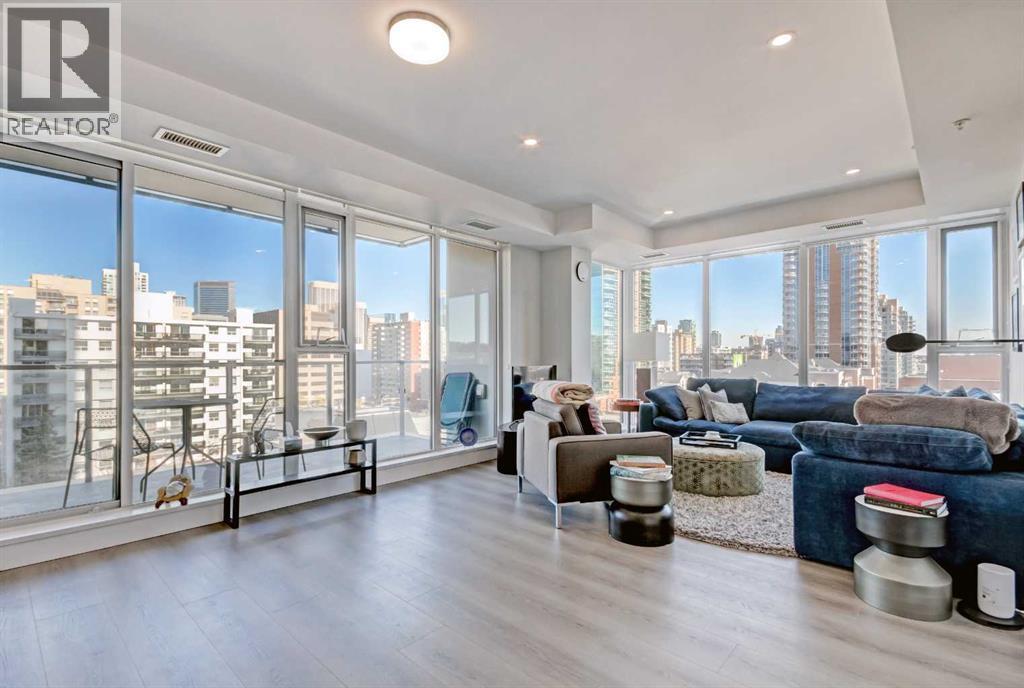 Welcome to unit 703 in The Royal! A lovely 2 bedroom 2 bathroom double balcony corner unit with stunning downtown views. The floor to ceiling windows flood the main living space with natural light and the north and east vistas are stunning. The bright kitchen is fully equipped with a large quartz island, high end appliances, plenty of cabinet and counter space with custom built in - all overlooking the main living and dining areas, perfect for entertaining. Large primary bedroom, with direct access to the second balcony, features a walk-in closet, an ensuite with a large glass door shower, double vanity and heated floors. The second bedroom is located on the opposite side of the unit, perfect for guests or home office. Other features include air conditioning, a gas line on the balcony for bbq, in-suite full size stacked laundry and additional 4 piece bathroom with soaker tub. Residents can enjoy the many amenities including a fitness center, steam room, sauna, squash court, 24-hour concierge/security, outdoor courtyard, and private dining area for larger get togethers. Located just off 17th avenue you will have quick access to great shopping, restaurants, groceries, coffee shops and pubs. Building is very pet friendly, with approval, and there are many parks and green spaces near by. This unit is complete with a secure heated underground parking space and a separate storage locker. An excellent well cared for urban home. (id:6769)