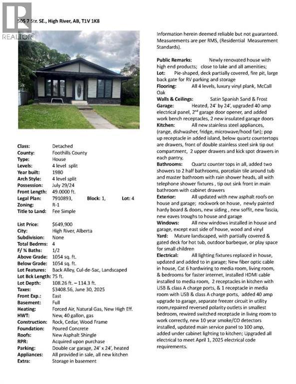 Click brochure link for more details. Newly renovated 4 bedroom 3 bathroom house with high end products; close to lake and central to 3 schools. The kitchen features all new stainless steel appliances, a pop-up receptacle in the island, quartz countertops with under cabinet lighting and a double stainless steel sink. Below the sink is a tip out compartment. Each of the 2 Pantries has 2 inside drawers and 2 lower drawers as well as kick-spot drawers. Outside offers a mature landscaped yard with a partially covered and gated deck for a hot tub, outdoor barbeque or play space. Throughout the home there is plenty of new electrical features including fiber optic cable (CAT-6) for high speed internet to the living room, media room and all the bedrooms. There are new outlets in the kitchen and media room with USB and Class A phone charging ports. This home features a new high efficiency furnace and a new 50 gal hot water tank. The 24'x24' heated garage is powered by a 40 amp panel with three additional workbench receptacles. (id:6769)