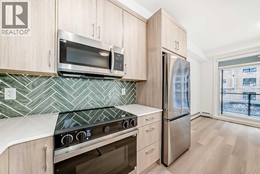 Welcome to the Curnoe 2 by Logel Homes—a well-designed unit featuring full-height cabinet fronts, quartz countertops, luxury vinyl plank flooring throughout, and tile in the bathroom. The upgraded kitchen includes a modern backsplash, a premium sink and faucet, and comes with stainless steel appliances. Enjoy year-round comfort with air conditioning, plus the convenience of an in-suite washer and dryer. Nine-foot ceilings and large windows provide plenty of natural light. This home includes a titled underground parking stall and is backed by the Alberta New Home Warranty. Located close to shopping, public transit, and major routes like Deerfoot and Stoney Trail, it offers easy access across the city. With affordable condominium fees, this is a great opportunity to own a well-appointed home in a convenient location. Quick Possession Available (id:6769)