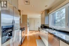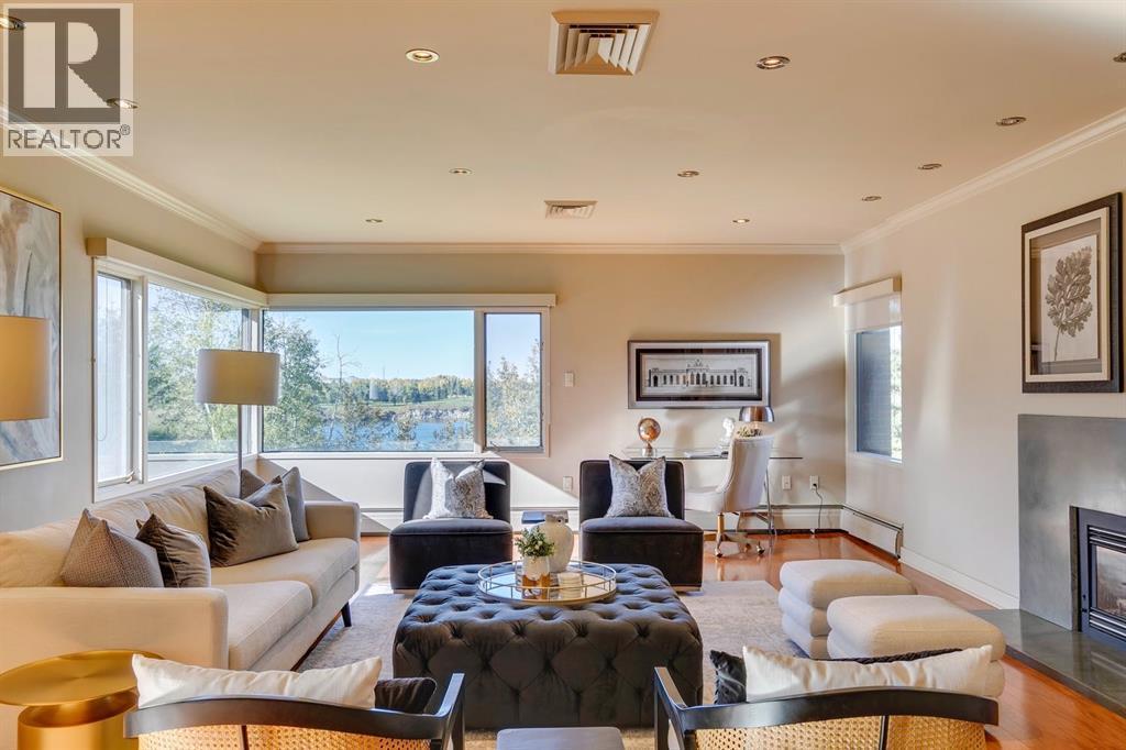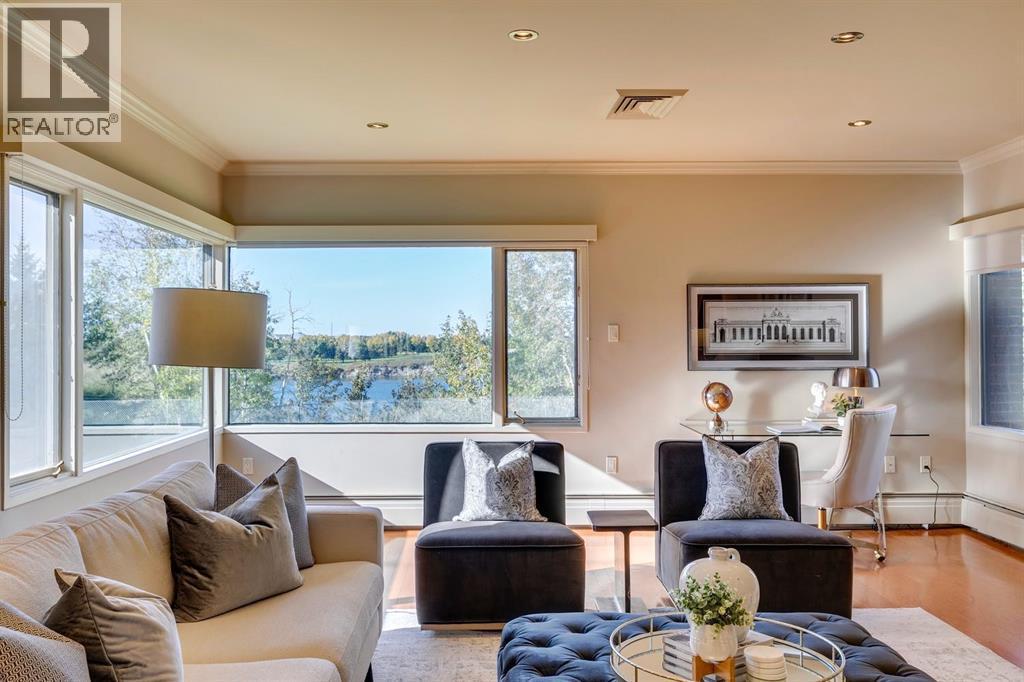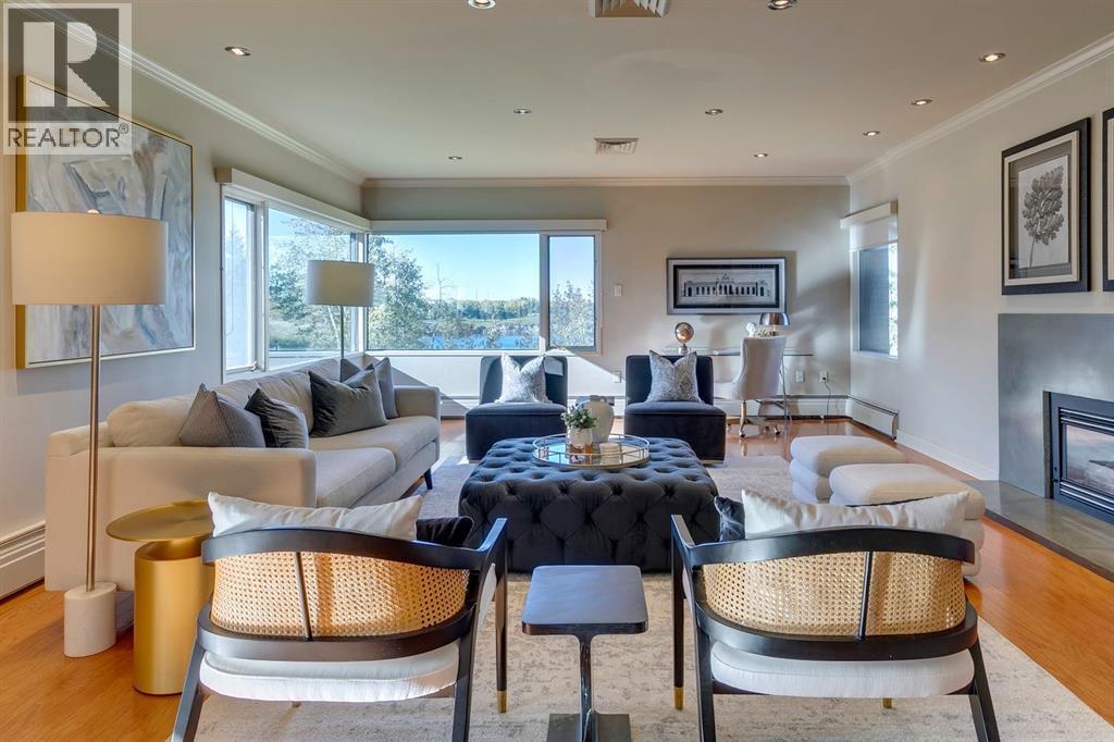 Experience Executive New York-style living in one of Calgary's most prestigious and intimate communities, Eagle Ridge. Your journey into luxury begins the moment you step into the elevator, which transports you directly to your private foyer, unveiling over 2,000 square feet of sophisticated living space. This exclusive residence immediately impresses with gleaming hardwood flooring that guides you through an expansive open floor plan, where every room captures breathtaking, panoramic views of the Glenmore Reservoir and the dynamic Calgary skyline. The heart of the home is the grand living area, anchored by a striking feature fireplace and bathed in natural light through walls of windows, seamlessly flowing into a secondary sitting space that opens onto a private balcony making it perfect for quiet mornings or evening relaxation. Entertaining is effortless in this thoughtfully designed home, which features a generous dining area ideal for hosting gatherings. The timeless, contemporary kitchen with high grade granite countertops, a tiled backsplash, premium stainless steel appliances, and abundant cabinetry. A bright breakfast nook offers a casual spot to enjoy your morning coffee while soaking in the views. The master bedroom is a true retreat, boasting an extended seating area below the window, a vast walk-in closet, and a classic en-suite bathroom complete with a walk-in shower and extensive storage. A spacious second bedroom and a full family bathroom with a relaxing jacuzzi tub ensure comfort for family or guests. Practicality meets luxury with a substantial laundry room offering ample counter space and cabinetry, solving storage needs with elegance. This unit further distinguishes itself with two dedicated parking stalls and the largest storage unit within this intimate 10-residence building. Residents also enjoy access to a guest suite in this exceptionally managed property. Ideally positioned just steps from Rockyview Hospital, this home offers unparalleled c onvenience for medical professionals, while nature enthusiasts will appreciate immediate access to Heritage Park and the Glenmore Reservoir pathways. With excellent shopping and dining at Glenmore Landing nearby and easy access to 14th Street, Glenmore Trail, and Heritage Drive, the entire city is within effortless reach. (id:6769)