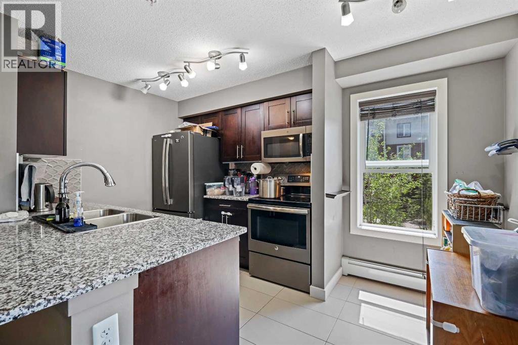 Welcome to a rare offering in the heart of Legacy – a beautiful condo that perfectly blends style, space, and convenience. Situated on the second floor of a well-maintained, sought-after complex, this expansive, almost 970 sq ft South West corner unit showcases one of the largest floor plans available. Inside, you'll be greeted by an abundance of natural light streaming through oversized windows, accentuating the open-concept layout and creating a warm, welcoming atmosphere. The generous living and dining areas offer seamless flow, ideal for both entertaining and everyday living. The unit is beautifully upgraded with premium floor tiles and plush carpet. The chef-inspired kitchen is both stylish and practical, featuring rich wood cabinetry, granite countertops, designer backsplash, smudge-resistant slate finish appliances that stays flawlessly clean—no fingerprints, no streaks, and a functional breakfast bar. Whether hosting guests or enjoying a quiet morning coffee, this kitchen meets every need with ease. Two well-appointed bedrooms provide comfortable retreats, including a spacious primary suite complete with a walk-through closet and private 3-piece ensuite with a sleek shower stall. A second bedroom is located on the opposite side of the unit for added privacy, along with a full 4-piece main bathroom. Additional features include in-suite laundry, one titled underground heated parking stall, and a second surface stall conveniently located just steps from the entrance. Enjoy the benefits of a quiet, well-managed complex with ample visitor parking and easy access to nearby pathways, schools, shopping, public transportation, and major roadways. This bright, move-in ready condo offers exceptional value and lifestyle in one of Calgary’s most desirable communities. (id:6769)