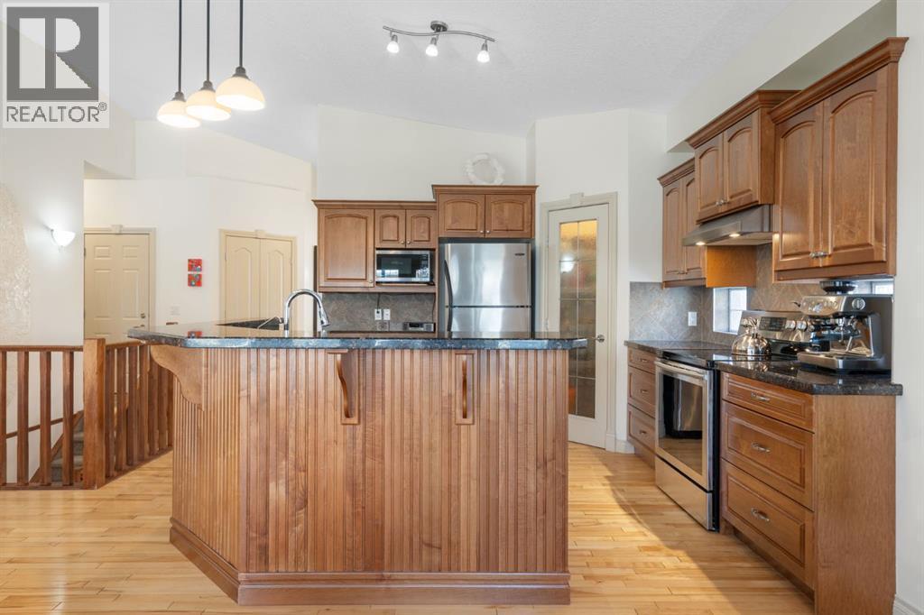 Welcome to this immaculately maintained 3 bedroom, 2.5 bathroom walkout bungalow villa, tucked into an exceptionally well-managed and peaceful condominium community in Okotoks’ desirable Air Ranch.Designed for comfort and ease, the main floor offers everything you need for day to day living, including a spacious primary bedroom, 1.5 bathrooms, laundry, and an open concept kitchen and living area. Vaulted ceilings, original hardwood floors, and granite countertops create a sense of warmth and openness that feels both timeless and inviting. A natural gas fireplace anchors the living space, making it equally suited for quiet evenings or entertaining.The fully developed walkout lower level expands your living space beautifully, with two additional bedrooms, a full bathroom, and an exceptionally large recreation room, all enhanced by in floor heating, a feature you’ll truly appreciate year round.Privacy here is outstanding. Enjoy quiet and friendly neighbours, and easy access to the scenic walking paths surrounding the ponds throughout the Air Ranch community and beyond. Outdoor living is equally thoughtful: a west facing front porch welcomes afternoon sun, while the east facing upper deck is perfect for morning coffee. The lower patio, also east facing, features a natural gas BBQ hookup and ample space for outdoor dining and relaxation.This home is in excellent condition and truly move-in ready, with thoughtful upgrades including a new hot water tank (December 2024) and a recently serviced furnace (December 2025) that received a strong bill of health. (id:6769)