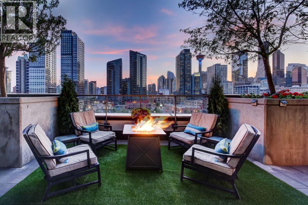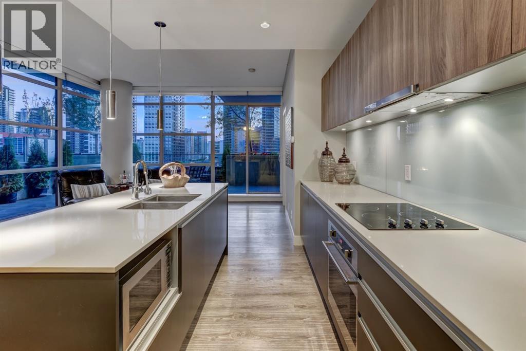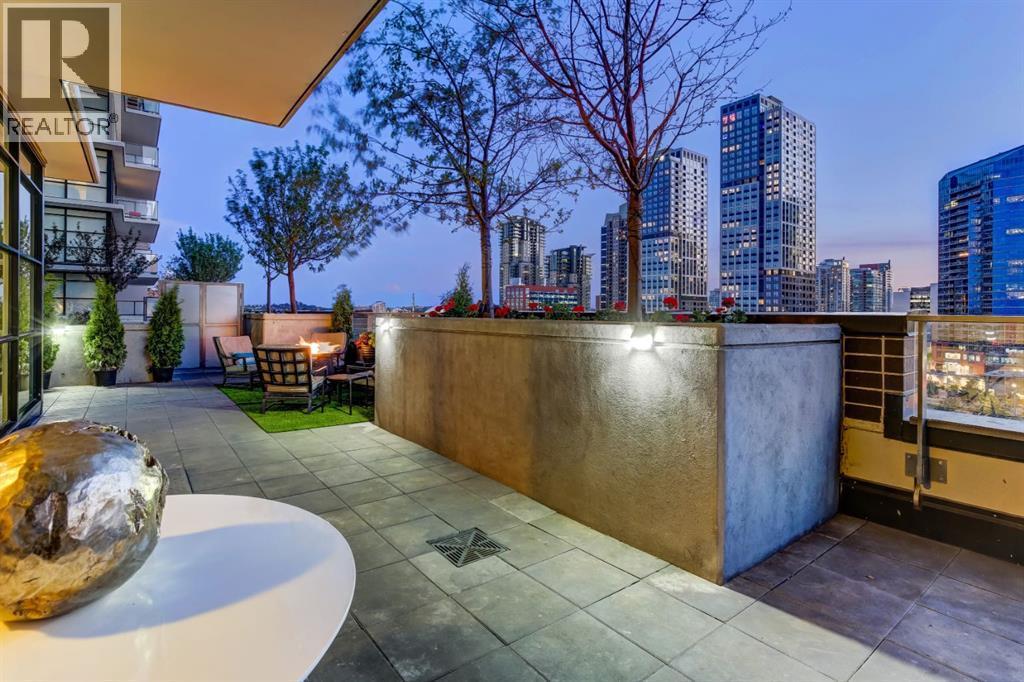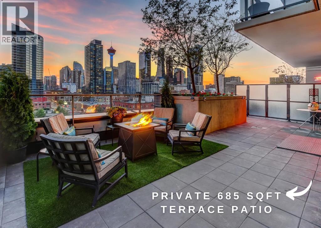 Love downtown living but craving outdoor space? This stunning SW corner terrace unit offers the best of both worlds - a rare, wrap-around 685 sqft terrace with breathtaking views of the city skyline. Located on the 7th floor, this bright and spacious corner layout features 10’ ceilings and expansive floor-to-ceiling windows that flood this unit with natural light and truly bring the outdoors in. The sleek modern kitchen is thoughtfully designed with built-in appliances, quartz countertops, and a convenient microwave shelf to keep your counters clear and functional. The primary bedroom includes upgraded custom closet built-ins to maximize storage, along with a 4-piece ensuite for added comfort. A true bonus: titled indoor tandem parking, rarely found in the building, ideally situated on the 4th level right next to the elevator doors (and only 3 floors down the stairs), with natural light streaming into the parkade through shaded windows. Perfect for the urban professional, you’re just steps from the Saddledome, downtown, C-Train, river pathways, shops, restaurants, and all amenities. Residents of The Guardian enjoy premium amenities including concierge service, a fully equipped fitness centre (directly below unit), social lounge, workshop, visitor parking, and a beautifully landscaped garden terrace with BBQs. With stairs conveniently nearby, you’ll never have to wait long for an elevator. Don’t miss this rare opportunity to enjoy downtown living with exceptional outdoor space! (id:6769)