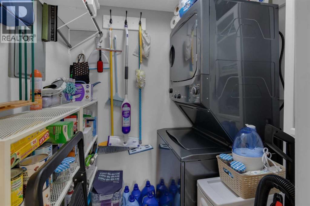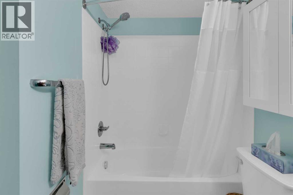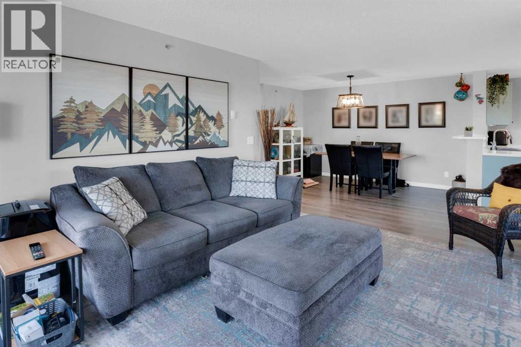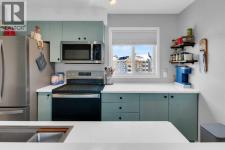 Welcome to MacKenzie Pointe, a well-maintained condo complex ideally located in the heart of Airdrie. This updated top-floor corner, 2-bedroom, 1-bathroom unit offers exceptional privacy with no neighbours above and only one shared wall. Enjoy a walkable lifestyle just steps from shopping, restaurants, health services, and the pathways and activities of Nose Creek Park. Inside, the bright corner layout creates an open, welcoming feel. The kitchen features contemporary coloured cabinetry and stainless steel appliances (2022), including a convection oven with air-fryer function, dishwasher, microwave with hood fan, and a refrigerator with bottom-drawer freezer. A farmhouse sink with pull-down faucet adds both style and everyday practicality. Recent updates include a new washer and dryer (2025), updated switch plates, upgraded lighting, and ceiling fans in both bedrooms. Foil-lined sunshades in the kitchen and living room improve year-round comfort, while mirrored closet doors enhance light and storage. The bathroom features a professionally refinished bathtub that's easier to clean. Step outside to a large two-sided balcony, perfect for relaxing or enjoying evening sunsets. The unit includes titled, heated underground parking located near the elevator, complete with a lockable storage area. Condo fees conveniently cover electricity, heat, water, sewer, and waste removal. A rare combination of location, privacy, and thoughtful updates within MacKenzie Pointe — this is condo living done right. (id:6769)