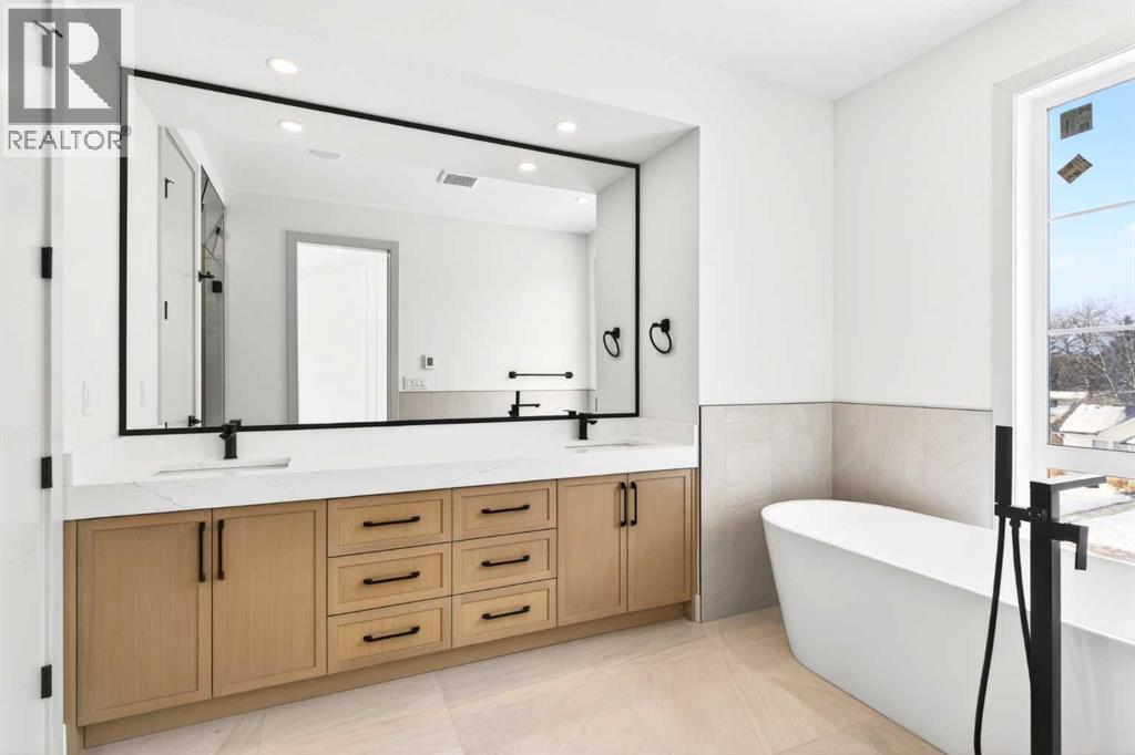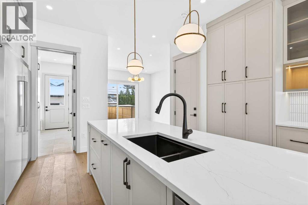 Glenbrook’s Finest! Step into a bright and inviting open-concept main floor where function meets elevated design. At the front of the home, a beautiful formal dining area sets the stage for stylish gatherings and elegant dinner parties. Just beyond, the chef-inspired kitchen boasts a massive waterfall quartz island, double-wide fridge, Bosch cooktop, wall oven, and dishwasher. Adjacent to the island, a thoughtful prep and storage area includes a built-in bar fridge and extended cabinets with convenient pull-out drawers—keeping everything organized and within easy reach for seamless entertaining. Warm neutral tones, built-in ceiling speakers, and timeless finishes create the perfect backdrop for both daily living and hosting with ease. At the rear of the home, a cozy fireplace lounge flows effortlessly onto a sprawling east-facing deck—ideal for enjoying quiet sunny summer mornings or relaxed evenings. Just off the kitchen, a spacious mudroom offers even more custom cabinetry to store your family’s essentials. Upstairs, a versatile loft area offers the perfect spot for a home office or reading nook. The massive primary retreat features heated floors in the spa-inspired ensuite, and a deep soaker tub. Two additional generously sized bedrooms and a stylish four-piece bath complete the upper level. Downstairs, the home offers even more flexibility with a bright and spacious legal basement suite (pending final City of Calgary approval). Featuring two private bedrooms and a large open living area, this level is ideal for extended family, guests, or future rental income. This home isn’t just beautifully finished—it’s a thoughtful investment in style, space, and long-term potential. (id:6769)