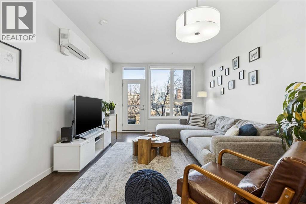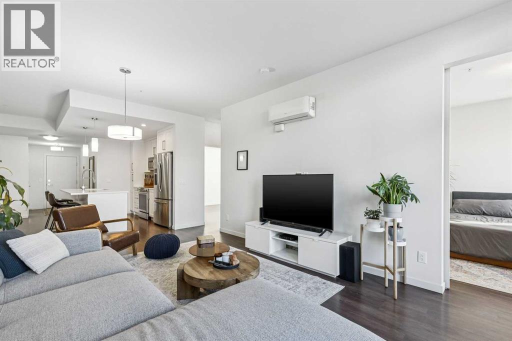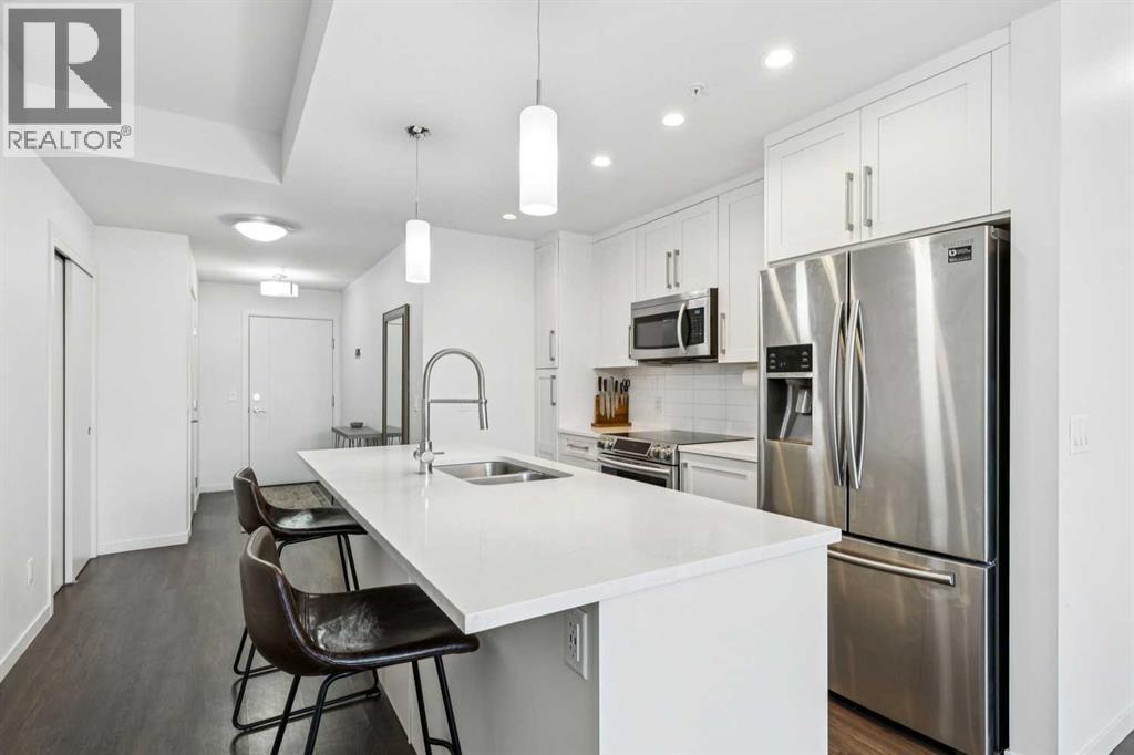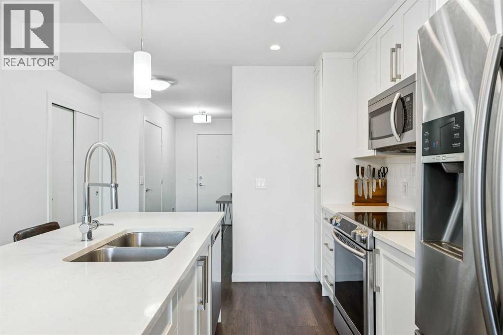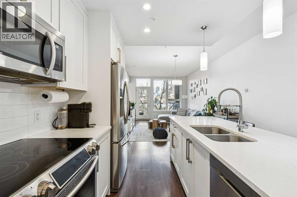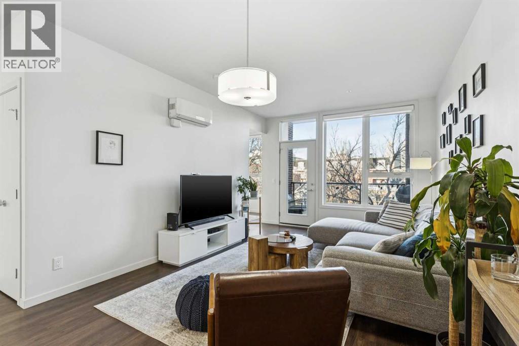Welcome to this exceptional 2 bedroom, 2 bathroom corner unit in the sought-after Tela Building, ideally located on arguably Mission’s best street 22nd Avenue SW. Just steps from the area’s top inner-city amenities, this street-facing condo is tucked on a quiet, tree-lined block and offers the perfect blend of privacy, light, and location. Situated in the northwest corner of the third floor, this bright and airy home features 9-foot ceilings, central air-conditioning, a thoughtfully designed 870 sq ft floorplan, and two titled underground parking stalls plus a storage locker. Large windows throughout flood the space with natural light, while downtown views can be enjoyed from both the primary bedroom and the private balcony. The open-concept kitchen is designed for both everyday living and entertaining, complete with a central island with quartz countertops, stainless steel appliances, and seamless flow into the dining and living areas. Step outside to the balcony overlooking mature trees, with sightlines north to downtown and west toward 4th Street, and a gas line for BBQ. The spacious primary bedroom offers a peaceful retreat, overlooking a beautiful mature tree that creates a canopy of greenery in the spring. The attached ensuite features double quartz vanities, tile flooring, and a large walk-in shower. The second bedroom is generously sized with west-facing windows for warm afternoon light and is conveniently located near the full second bathroom ideal for guests. Additional highlights include pet-friendly living, secure underground parking with side by side stalls, secure bike storage and unbeatable access to Mission’s vibrant shops, restaurants, grocery stores, banks, transit, and professional services along 4th Street. Enjoy walking or cycling the Elbow River pathways, located less than five minutes from your door. This is a fantastic opportunity to enjoy quiet, inner-city living in one of Calgary’s most desirable neighbourhoods. (id:6769)