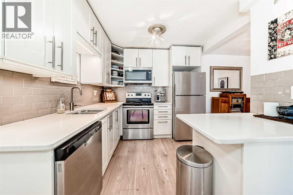 Welcome to this fabulously updated 2 bed/1 bath unit in the heart of the Beltline, just a skip the beautiful Lougheed House, and an easy walk to 17th Ave! Situated in a mature neighbourhood & well managed building, you'll appreciate the bright & airy space with newer luxury vinyl plank throughout. The kitchen features ample storage in the contemporary cabinetry, quartz counters and newer appliances, and loads of room for a good size table in the dining room. The large living area features a gorgeous gas fireplace with smooth facade, and wide slider doors to the huge balcony, flooding the room with light, and ideal for entertaining friends & family. The generous primary bedroom has plenty of room for a king size bed and a private door to access the balcony. The second bedroom is also good sized and features double French doors bring in loads of light. The updated 4 pc bath, with updated vanity & marble counter and in unit laundry/storage complete the tour. The roof top community patio is perfect for relaxing on warm summer evenings. Or enjoy a well deserved sauna in the building after a cold winter walk. The building is ideally situated in a residential area, with parks & playgrounds nearby, and is an easy walk to 17th Ave with fantastic restaurants, shops & grocery. Book your showing today! (id:6769)