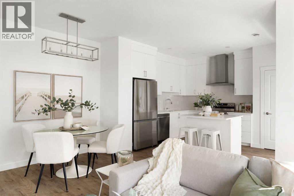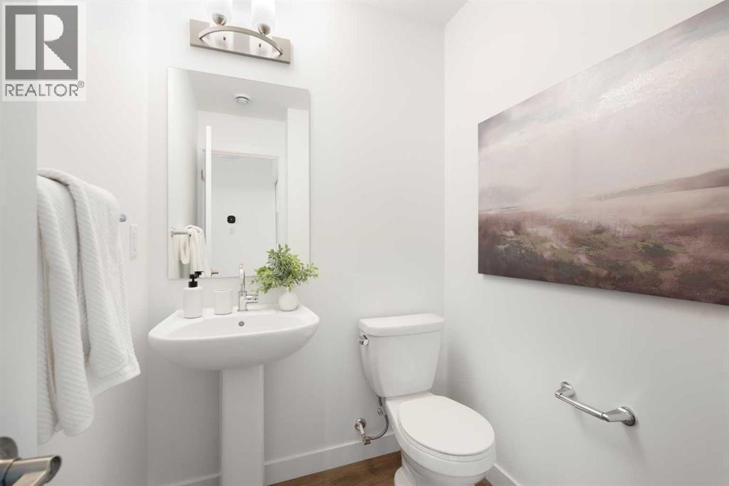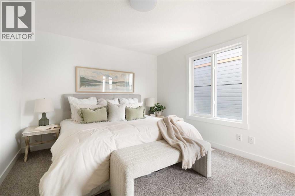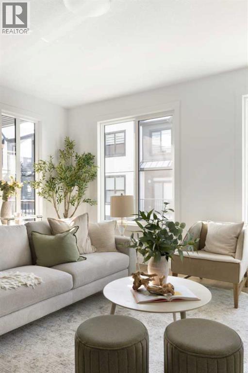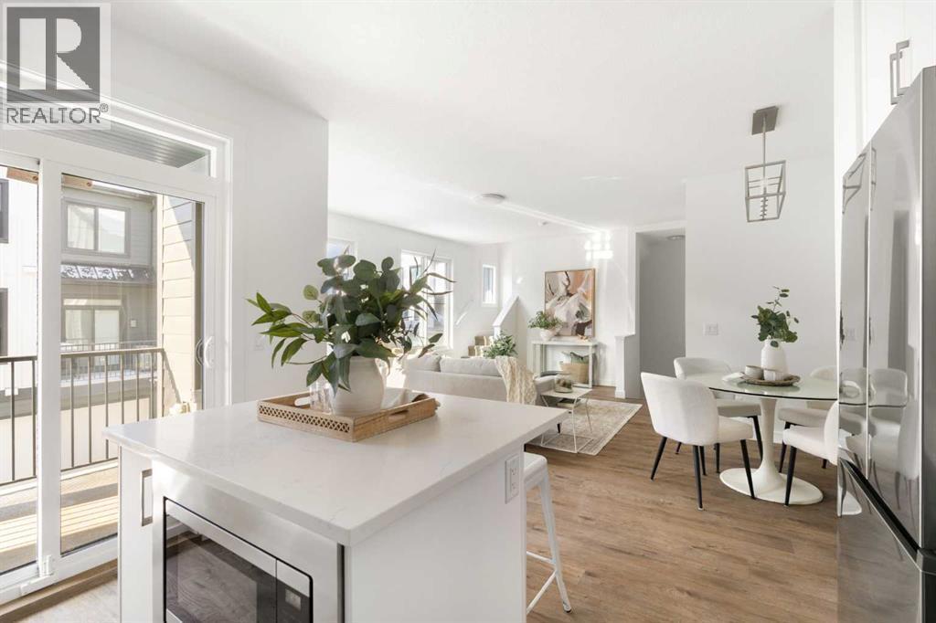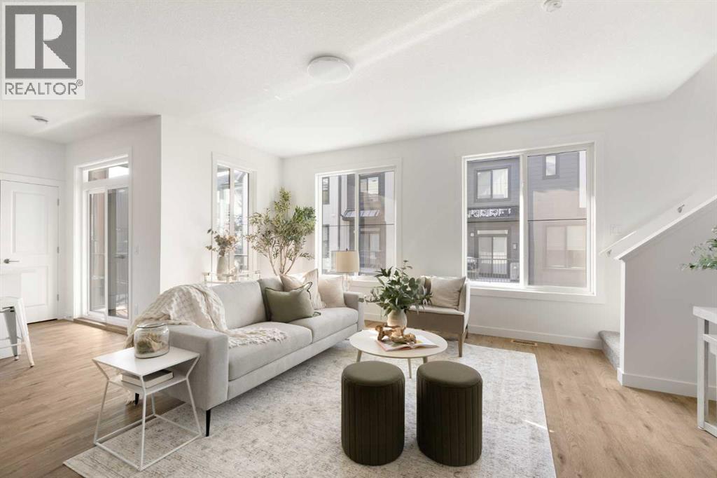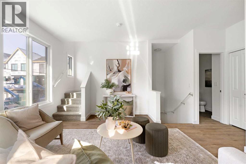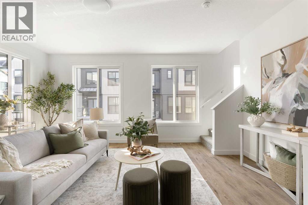 The beautifully finished ‘Armstrong’ by Brookfield Residential is now available in the sought-after community of Rockland Park. This brand-new townhome is thoughtfully designed and extensively upgraded, offering 3 bedrooms, 2.5 bathrooms, and a private double attached garage. The open-concept main floor showcases a timeless white kitchen featuring full-height cabinetry, quartz countertops, and a central island with seating, along with a premium stainless-steel appliance package including a chimney hood fan, built-in microwave and upgraded range. The kitchen flows seamlessly into the dining and living areas, creating an ideal space for both everyday living and entertaining. A wall of west-facing windows fills the main living area with abundant natural light throughout the day. The main level is complete with a west-facing balcony which is perfect for capturing sun through the warmer months and includes a BBQ gas line. On the upper level, the spacious ~11' x 12' primary bedroom offers a walk-in closet, private ensuite with walk-in tiled shower, and its own private balcony. Two additional bedrooms, a full bathroom, and a conveniently located laundry area complete the upper level. The lower level features a double attached garage, providing secure parking and ample storage year-round. Additional upgrades throughout create a beautiful and inviting living space that you'll be proud to live and entertain in. Completing the home is a rough-in for central A/C - making future installation a breeze. If you’re searching for a brand-new townhome in Calgary, this is an exceptional opportunity. The home includes a full builder warranty plus Alberta New Home Warranty, all within the vibrant and growing community of Rockland Park. (id:6769)