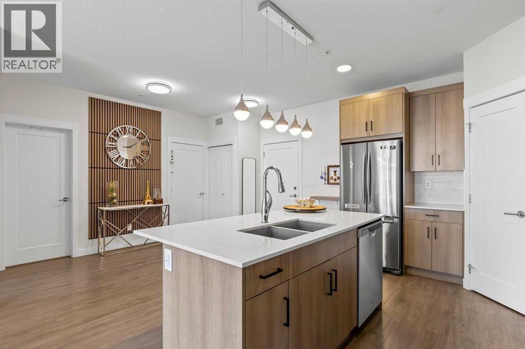 Welcome to your stylish oasis in the heart of Cranston – where modern living meets everyday convenience! This beautifully upgraded unit offers the feel of new construction without the price tag, and it’s just a 5-minute walk to scenic Cranston Ridge with quick access to the Bow River valley. Step inside to a spacious entryway that flows into a bright, open-concept living area. The heart of the home is a stunning kitchen featuring over $15,000 in upgrades – including sleek quartz countertops, modern stainless steel appliances, pendant lighting, and a HUGE island with seating for four. Durable vinyl flooring adds both beauty and function throughout the main space. Enjoy the privacy of a smart split-bedroom layout, with the primary suite boasting a large walk-in closet, dual sinks, upgraded shower, and extra cabinet storage. Big windows fill the space with natural light, and the living room opens directly to a large balcony – perfect for relaxing or entertaining. It also includes a titled parking stall just steps from the entrance. Ideally located near shopping, dining, and nightlife in the Seton commercial district. You're minutes from the Seton YMCA, South Health Campus, and six golf courses within a 10-minute radius. Whether you're an outdoor adventurer or a city dweller, this location truly offers it all! (id:6769)