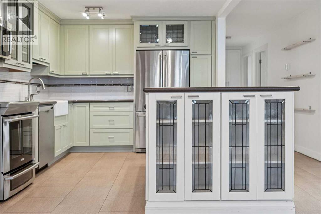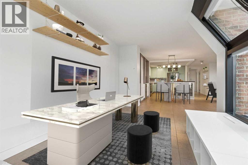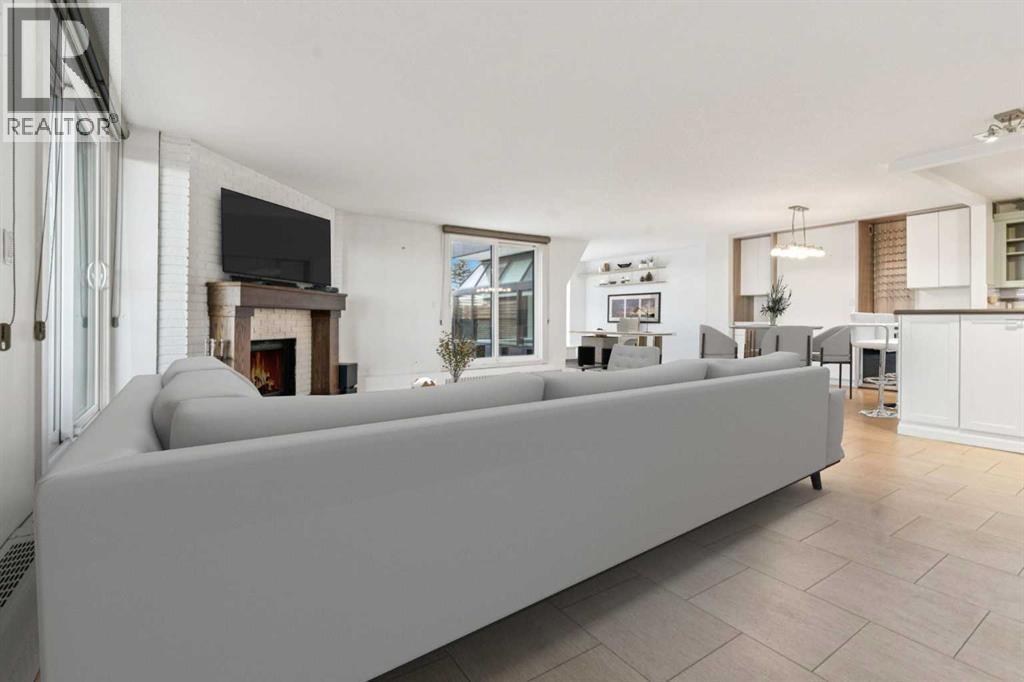 Welcome to an extraordinary top-floor retreat where refined indoor living meets unmatched outdoor space. Situated in a quiet concrete building, this impressive 1,500+ sq. ft. 2 bedroom, 2 bathroom home is finished to an exceptional standard throughout. The heart of the home is a custom Martha Stewart Living island kitchen, complete with stone countertops and premium Electrolux and Bosch appliances. It is very rare to find a custom kitchen of this size and quality! Beautiful appointed from top to bottom. It then flows seamlessly into a bright, open great room anchored by a cozy wood-burning fireplace. The space is very spacious with room for an additional library or seating area. Updated bathrooms, luxury vinyl tile and ceramic flooring, custom built-ins, double closets, and a large in-suite laundry room with abundant storage elevate everyday living. All of this as well as a very spacious office or studio space, solarium style with built-in, bench seating and a wall of windows. Mostly newer windows with custom blinds allow natural light to pour in from every angle. Step outside through two smooth-slide patio doors to a truly rare offering: a 700 sq. ft. penthouse-style wraparound rooftop patio. Designed for privacy and enjoyment, this outdoor oasis features a raised 24’ x 24’ deck with new wood feature walls. There is more unique spaces for dining, lounging or gardening! This patio is ideal for entertaining, BBQs, outdoor workouts, or simply relaxing while taking in sweeping southern sky views. Enjoy an easy-care executive lifestyle with two heated indoor parking stalls, a well-equipped fitness facility with sauna. Perfectly positioned on a peaceful, tree-lined street in the heart of revitalized Windsor Park, just steps to LRT, transit, Chinook Centre, shops, and restaurants. A short bike ride to Stanley Park, the Reservoir, and Elbow River pathways, and only 10 minutes to downtown. Condo fees include heat, water, and sewer. Immaculate, move-in ready, and truly o ne of a kind—this is elevated inner-city living at its finest. (id:6769)