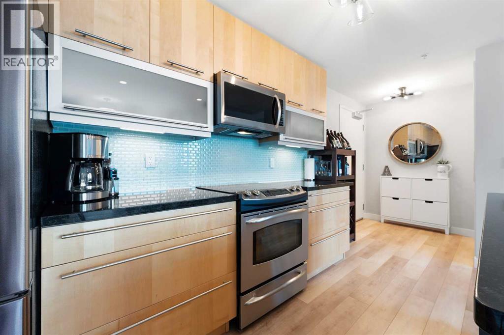 Experience vibrant inner-city living in this beautifully renovated 1 bedroom, 1 bathroom residence in Union Square, perfectly situated in Calgary’s sought-after Beltline. Offering a seamless blend of modern comfort and urban convenience, this west-facing unit showcases stunning park views and an unbeatable location backing directly onto Haultain Park—one of the few downtown residences to offer immediate access to green space and tennis courts. Recently refreshed with thoughtful upgrades throughout, the home features upgraded flooring, fresh contemporary paint, and stylish new lighting fixtures that create a bright and inviting atmosphere. The well-appointed kitchen is both functional and elegant, complete with sleek granite countertops, a spacious island, upgraded faucets, and a brand-new dishwasher—ideal for everyday living or entertaining guests. The open-concept layout flows effortlessly into the living area, where large windows fill the space with natural light and frame serene views of the park beyond. Designed with today’s lifestyle in mind, this unit includes a custom built-in workspace, perfect for working from home or staying organized. The bedroom offers comfort and practicality with upgraded closet doors and ample storage, while the bathroom has been enhanced with new faucets and updated fixtures, providing a clean, modern feel. Enjoy the convenience of in-suite laundry, adding ease to your daily routine. Step outside to your private balcony, finished with durable composite deck tiles, creating a welcoming outdoor retreat to relax and enjoy the west-facing exposure and peaceful surroundings. This exceptional offering also includes one titled underground parking stall and an assigned storage locker, ensuring secure parking and additional space for your belongings. Union Square is known for its contemporary design and unbeatable location above First Street Market, placing some of Calgary’s best dining, coffee shops, boutiques, and pubs right at your doorste p. Located on vibrant 1st Street SW, you’ll enjoy the energy of city living while still having direct access to green space just steps away. Whether you’re a professional, investor, or first-time buyer, this move-in-ready home delivers the perfect balance of style, comfort, and location in one of Calgary’s most dynamic communities. Don’t miss your opportunity to live in a beautifully updated unit with park-side living in the heart of the Beltline. (id:6769)