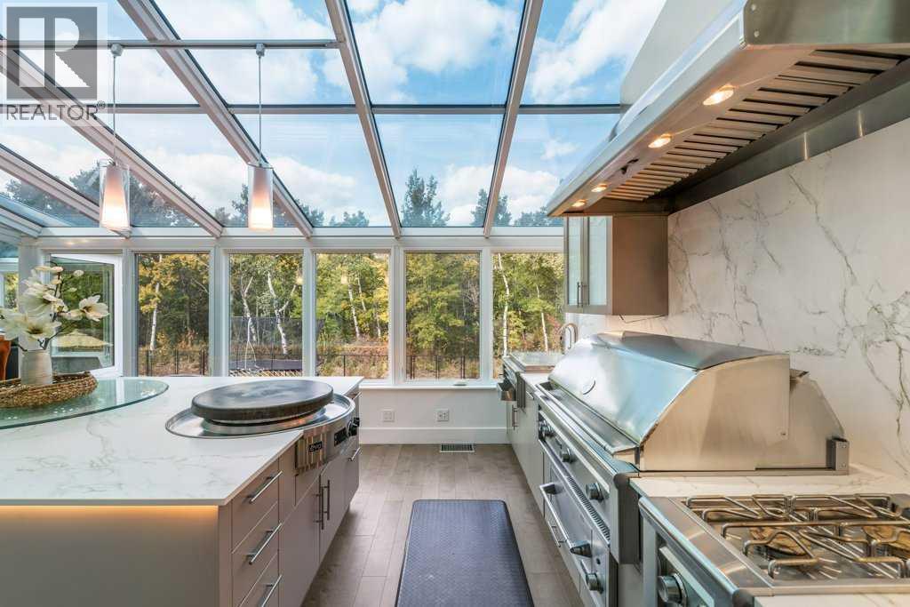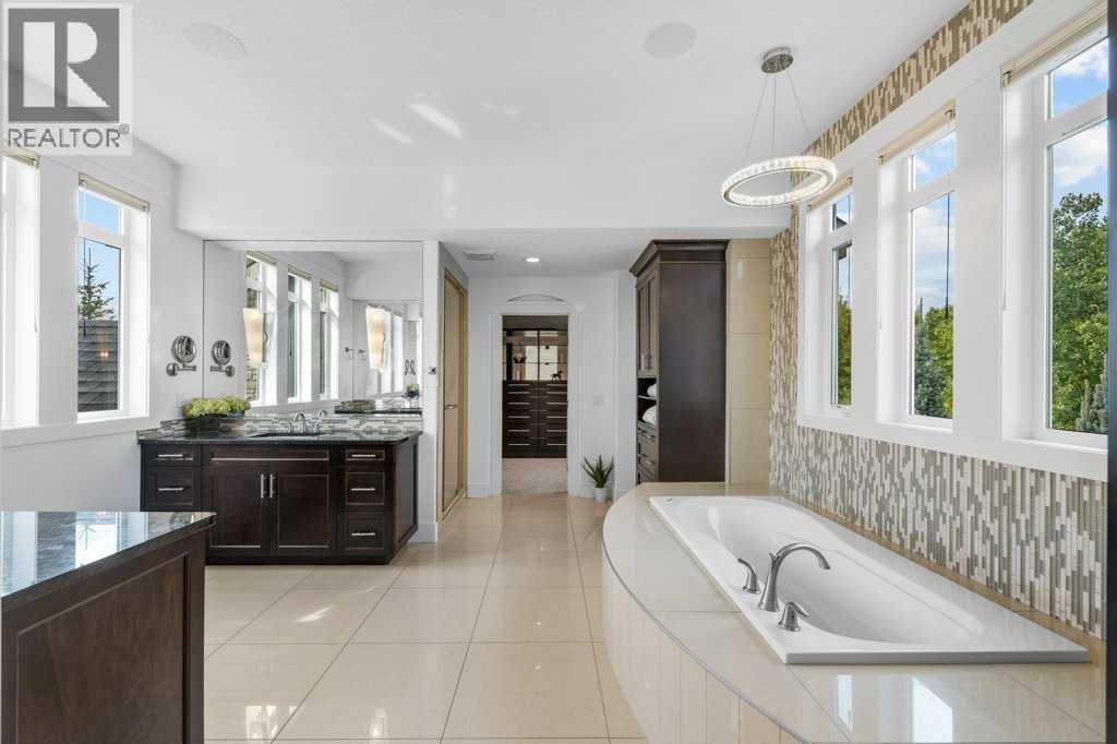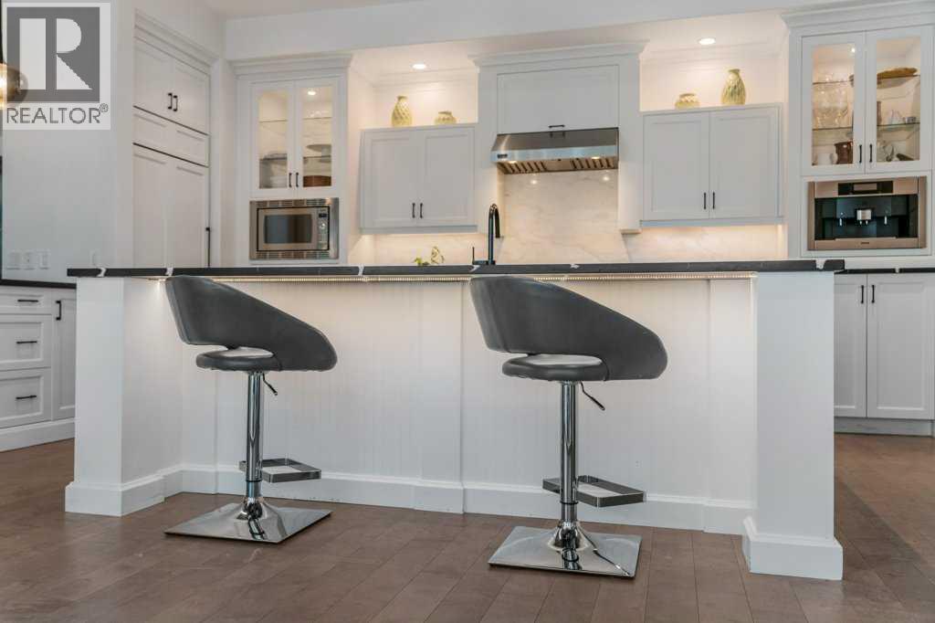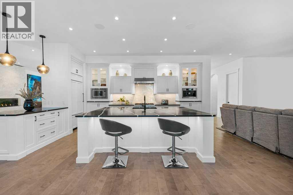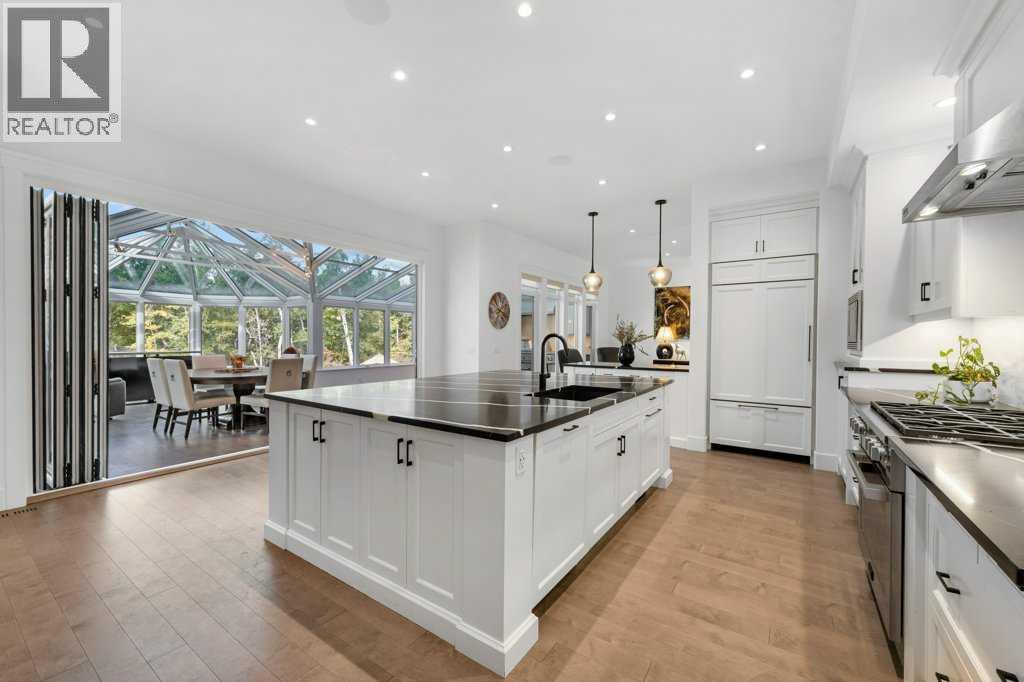 *Welcome to this extraordinary, fully renovated estate home in the prestigious community of Heritage Pointe, offering exclusive lake access and surrounded by natural forest beauty! Situated on a prime lot & backing onto a treed forest, the home has undergone a major renovation. It now features the addition of a spectacular 800 sq. ft. "entertainer's dream" 4 season sunroom (with new foundation and its own furnace/plumbing/air conditioning) - a true showpiece created for both relaxation and entertaining! Outfitted with premium appliances, the chef's kitchen serves large gatherings; a spacious dining room is adjacent, plus a living area for relaxation, where dual large-screen TV's seamlessly rise from the hardwood floors - at the touch of a button! The main home's central kitchen is renovated with new quartz counters/island, new appliances, marble backsplash, plus a newly reconfigured lighted pantry. With a living / dining room that has a new floor-to-ceiling feature "linear" fireplace, perfect ambience is createde. A stylish great room, also adjacent to the kitchen, provides built-in cabinetry with lighted accents. All new hardwood floors adorn the main level, new lighting, all solid interior doors, new carpets. A main floor office, half bath and mudroom complete the main level. The upper level currently features 4 bedrooms (could be bonus room with 3 bedrooms). The master suite showcases vaulted ceilings, a private sitting area overlooking the forest, spa-like 5 pc ensuite w/air jet tub, steam shower & large walk-in closet, heated floors! The professionally finished lower level features a 4th bedroom, bath, media area, games room w/expansive wine bar, fitness room w/cork flooring & 2nd laundry. Direct Connect networking throughout. Dual central air conditioners, gas generator and extensive solar system - serves entire home! The 4 car garages (two double garages) are separated by a breezeway. The rear yard showcases an 8 person "waterfall" mineral h ot tub with an adjacent fire pit gathering area - grounds with underground sprinklers systems. Whether hosting a gathering or hosting a quiet evening, the indoor/outdoor ambience and forested views create a resort-like view year-round! Experience the best of lake living, privacy, and modern sophistication, in one of Alberta's most sought-after communities. (id:6769)