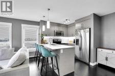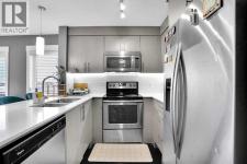 Welcome to this stunning top floor corner unit, offering exceptional privacy, designer finishes, and two titled parking stalls; Flooded with natural light from expansive windows on two sides, this home features an open and airy layout that seamlessly connects the living and dining areas. Step out onto the private balcony to enjoy beautiful views perfect for summer BBQs or unwinding at the end of the day. The chef inspired kitchen is a true showpiece, showcasing ceiling height cabinetry, quartz countertops with an undermount sink, a modern breakfast bar, classic white subway tile backsplash, stainless steel appliances. Designed with today’s lifestyle in mind, the floor plan includes a spacious primary suite with a walk through mirrored closet and a private ensuite. A second bedroom with its own full bathroom offers ideal separation for guests or roommates. A built-in desk creates the perfect work from home nook, and the convenience of in suite laundry enhances everyday living. Located within walking distance to schools, parks, shopping, and essential amenities, this home delivers outstanding value in a highly desirable location. Book your private showing with your favorite Realtor today! (id:6769)