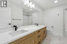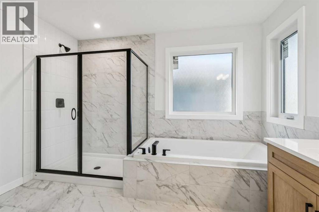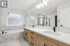 Welcome to The Sutton by NuVista Homes, located at 144 Hotchkiss Common SE in the growing community of Hotchkiss. This well-appointed 2,554 sq ft home offers 4 bedrooms and 2.5 bathrooms with thoughtful upgrades throughout. The main floor features 9’ ceiling heights, luxury vinyl plank flooring, a flex room, and a bright open-concept great room with a natural gas fireplace finished with tile to the ceiling. The kitchen includes quality cabinetry with taller upper cabinets, quartz countertops, a walk-through pantry, and excellent flow for everyday living and entertaining. Upstairs, the spacious primary bedroom features a five-piece ensuite and walk-in closet, complemented by three additional bedrooms, a full bathroom, a central bonus room, and a laundry room with built-in shelving. A side entrance, 9’ foundation, two extra feet of garage width, and basement rough-ins provide excellent future development potential. Photos are representative. (id:6769)