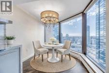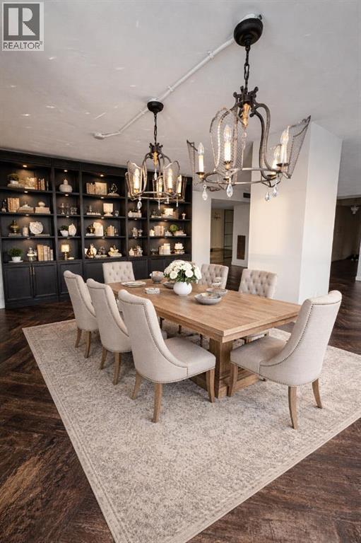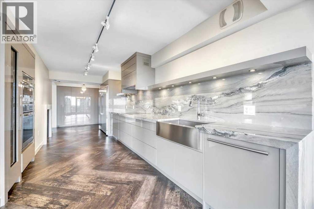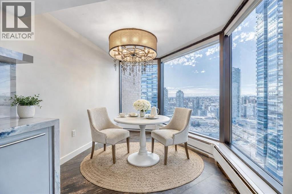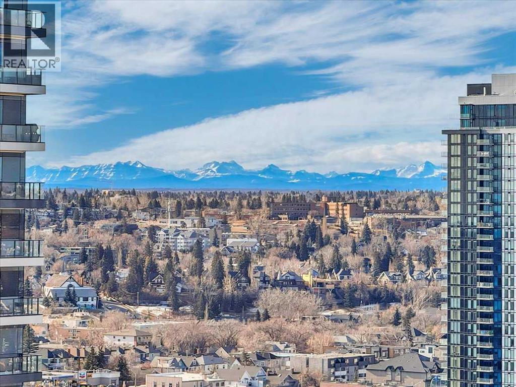 Welcome to a rare inner-city opportunity that simply does not come around often.Perched on the 24th floor of Westmount Place, this just over 2,400 square foot residence delivers a level of space, privacy, and sophistication rarely found in downtown Calgary. Floor-to-ceiling windows showcase unobstructed views of the Bow River, city skyline, and the Rocky Mountains, creating a breathtaking backdrop day and night.From the moment you enter, the quality is unmistakable. A total professional renovation has transformed this home into a refined, open-concept masterpiece. The welcoming foyer with custom built-ins sets the tone, while the living and dining areas are bathed in natural light and designed to entertain with ease while still offering comfort and privacy.The kitchen is nothing short of exceptional. High-end quartzite countertops, undermount sink, abundant cabinetry, premium stainless steel appliances, and a dedicated eating area make it as functional as it is beautiful. Whether hosting or enjoying a quiet morning coffee, this space delivers.The spacious primary suite is a true retreat, easily accommodating full-sized furnishings while offering stunning views. The luxurious five-piece ensuite features dual sinks, a custom glass shower, a deep soaker tub, and a large walk-in closet with built-in organizers.The glass-enclosed den is a standout feature, offering a refined and highly functional space ideal for today’s professional. Framed in glass and finished with privacy drapes, it delivers natural light while maintaining separation from the main living area. Thoughtfully designed with a walk-in closet, a dedicated office nook, and access to a private three-piece bathroom, this versatile room functions beautifully as a home office, guest retreat, or flexible living space—without compromising style or comfort.Luxury vinyl plank flooring flows throughout. In-suite laundry with high-end washer and dryer, a powder room, central air conditioning, and additiona l storage complete the home.Two side-by-side secured underground parking stalls on the P1 level add everyday convenience.Residents of Westmount Place enjoy a 24-hour concierge, newly renovated lobby, fitness facilities, racquetball and squash courts, dedicated change rooms, Luxer parcel storage, and a proactive board supported by an exceptionally healthy reserve fund.Ideally located on the quiet residential side of downtown, steps from the Bow River pathway system, the free ride LRT zone, grocery stores, restaurants, and cultural destinations.This is downtown luxury without compromise.Homes of this caliber are rarely offered.Now is the time to experience what Westmount Place has to offer.Ready to see it in person? This view is waiting. (id:6769)