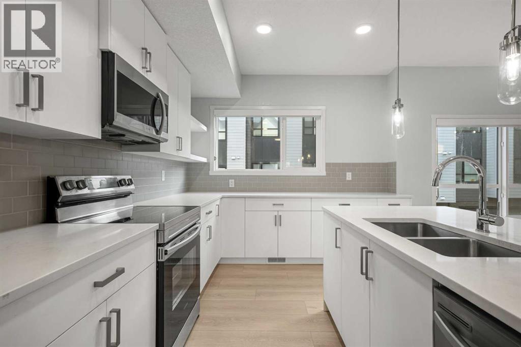 Welcome to Seton Serenity, an exceptional residence in one of Calgary’s most coveted communities, masterfully crafted by the award-winning CedarGlen Living. Offering nearly 1,748.55 sqft of refined living space, this exquisite 3-bedroom, 2.5-bathroom home blends timeless sophistication with modern comfort. Soaring 9' ceilings, expansive windows, and luxury vinyl plank flooring set the stage for an airy, light-filled interior. The north-facing balcony frames captivating views of the tranquil wet pond, creating a seamless connection between indoor comfort and outdoor serenity. The chef-inspired kitchen is nothing short of spectacular, featuring chic white cabinetry, gleaming quartz countertops, a designer subway tile backsplash, premium stainless-steel appliances, and an expansive island with seating—perfect for both intimate dinners and lavish entertaining. Flowing effortlessly into the dining area and spacious living room, the open layout invites gatherings with an air of refinement. The upper level is crowned by the sumptuous primary suite, a private retreat with a large walk-in closet and a spa-like 4-piece ensuite adorned with dual vanities, quartz counters, and an oversized glass-enclosed shower. Two additional bedrooms provide versatile space for children and guests, accompanied by a beautifully appointed 4-piece bath and the convenience of upper-level laundry. The lower level features a large space that can accommodate a home office or gym, while the attached double side-by-side garage offers security and ease. Just steps away, indulge in world-class amenities including the largest YMCA in North America, the renowned South Health Campus, boutique shopping, gourmet dining, and vibrant cafés. This is more than a home—it is a statement of luxury, comfort, and lifestyle in the heart of Seton. (id:6769)