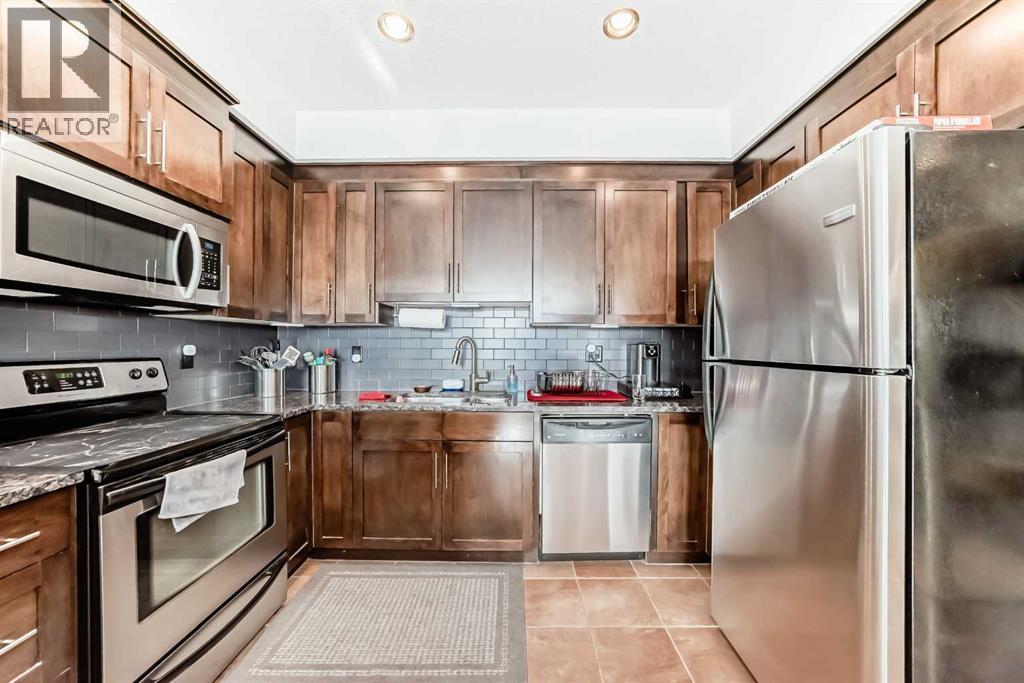Welcome to Unit 206 at 1005B Westmount Drive, a beautifully maintained second-floor condo in The Savana at Strathmore Lake Estates, offering the perfect blend of comfort, convenience, and lakeside living.This well-designed 764 sq ft, 1-bedroom, 1-bathroom unit features a bright open-concept layout with generous natural light throughout. The kitchen is finished with granite countertops, rich shaker-style cabinetry, stainless steel appliances, and a breakfast bar, making it both functional and stylish. The cozy living area is anchored by a corner gas fireplace with tile surround, creating a warm and inviting space to relax.The spacious primary suite includes a walk-in closet and ensuite. Enjoy the convenience of in-suite stacked laundry.Step outside to your private balcony with a gas BBQ hookup, perfect for evening grilling. The unit also includes a titled surface parking stall.Located steps from Strathmore Lake, walking paths, parks, shopping, and everyday amenities, this home offers an easy, low-maintenance lifestyle in one of Strathmore’s most desirable condo communities. (id:6769)