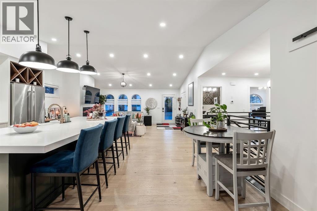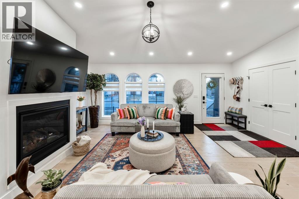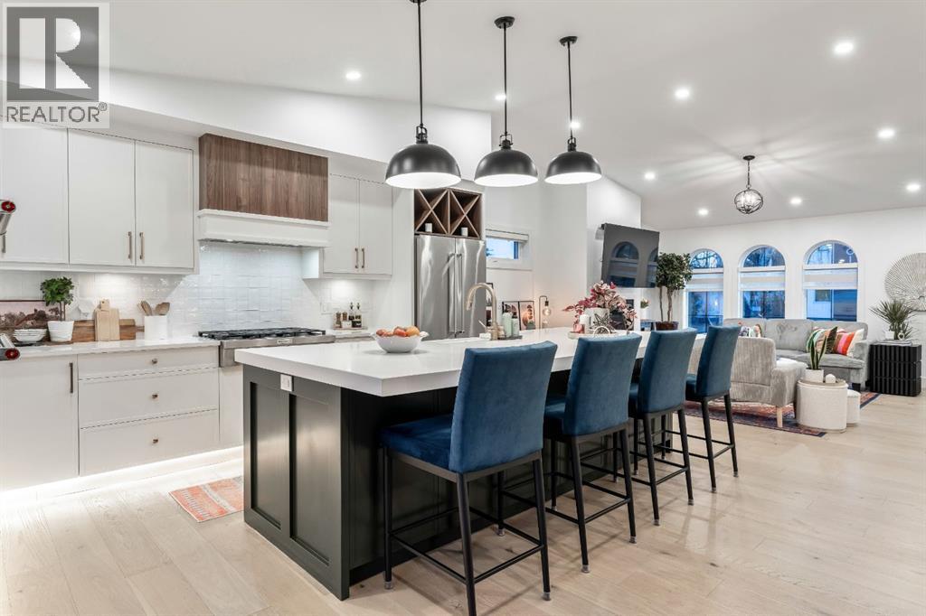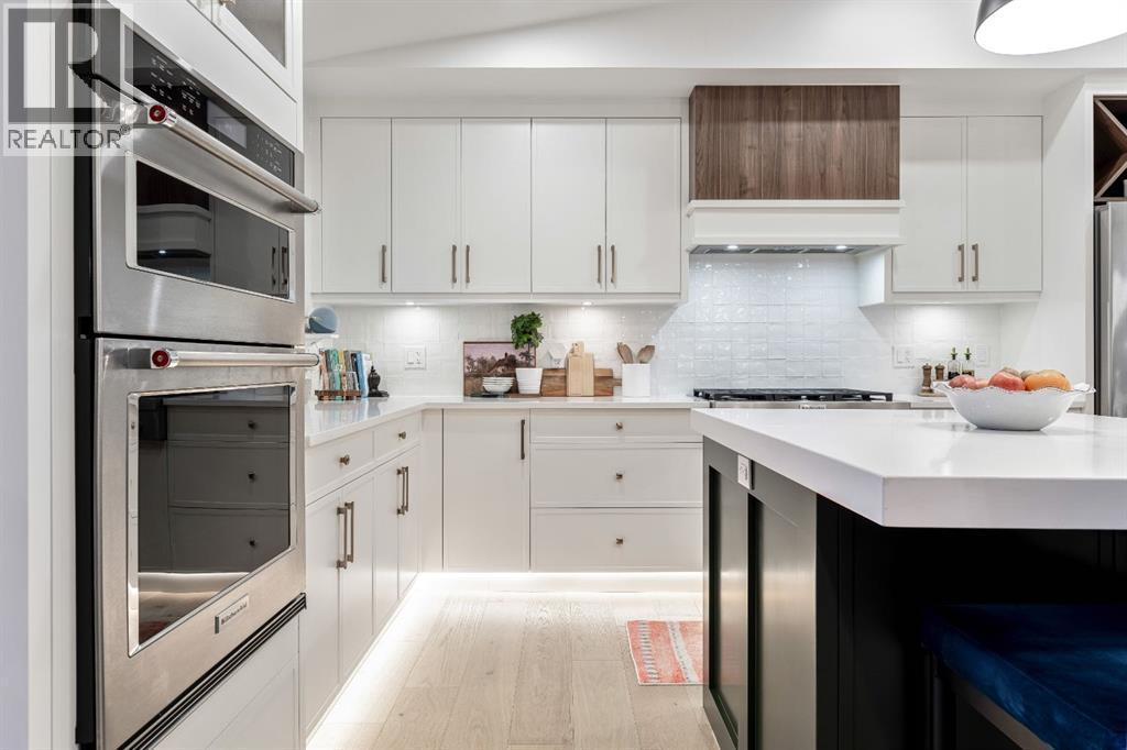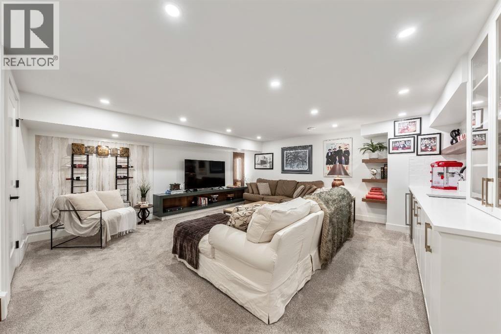 Welcome to this exceptional, fully renovated bungalow in the highly sought-after community of Wildwood—an outstanding opportunity for buyers looking for a truly move-in-ready home with timeless style and modern comfort. This property showcases a refined blend of contemporary finishes and classic architectural details, creating warmth and character rarely found in newer construction. Mature willow trees and professionally designed landscaping frame the approach, while new springline windows and premium Hardie board siding enhance the home’s striking exterior as you step through the charming brick archway onto the inviting front porch.Inside, the home has been thoughtfully reimagined with both front and rear additions, resulting in an expansive and functional layout. Vaulted ceilings, upgraded lighting, and beautiful white oak flooring highlight the bright, open-concept main level. Elegant arched windows flood the living space with natural light, drawing attention to the cozy gas fireplace that anchors the room. The kitchen is a true centrepiece, featuring a substantial quartz island, farmhouse sink, designer pendant lighting, custom hood fan, and a full KitchenAid stainless steel appliance package. Crisp white cabinetry and backsplash selections create a clean, sophisticated aesthetic ideal for both everyday living and entertaining. The adjoining dining area opens seamlessly to the rear deck through sliding glass doors, offering effortless indoor-outdoor flow. A sliding barn door reveals a beautifully designed mudroom complete with herringbone tile flooring, custom built-ins, a feature shiplap wall with bench and hooks, and floor-to-ceiling cabinetry surrounding the rough-in for a washer & dryer.Down the hall, the spacious primary suite offers a peaceful retreat with vaulted ceilings, a feature accent wall, and a custom walk-in closet with extensive built-ins. The spa-inspired ensuite includes dual sinks, a freestanding soaker tub, a rainfall shower with bench, hea ted floors, and floating vanities—luxurious details that elevate everyday living. The second primary bedroom also features its own walk-in closet and private ensuite, making it ideal for guests or multigenerational living, while the stylish powder room completes the main level.Fully developed basement offers a comfortable lounge atmosphere with plush carpeting, a recreation area with wet bar, two additional bedrooms with walk-in closets, a fourth bathroom, and an additional well-appointed laundry space. Extensive upgrades include new subfloors, trusses, furnace, air conditioning, plumbing, electrical, and more—providing peace of mind for years to come. A double detached garage is located off the rear alley, and utilities have been relocated underground for added functionality and curb appeal.Situated near parks, schools, and the many amenities along Bow Trail—with downtown Calgary just minutes away—this beautifully renovated bungalow offers the perfect balance of location, lifestyle, and luxury. (id:6769)