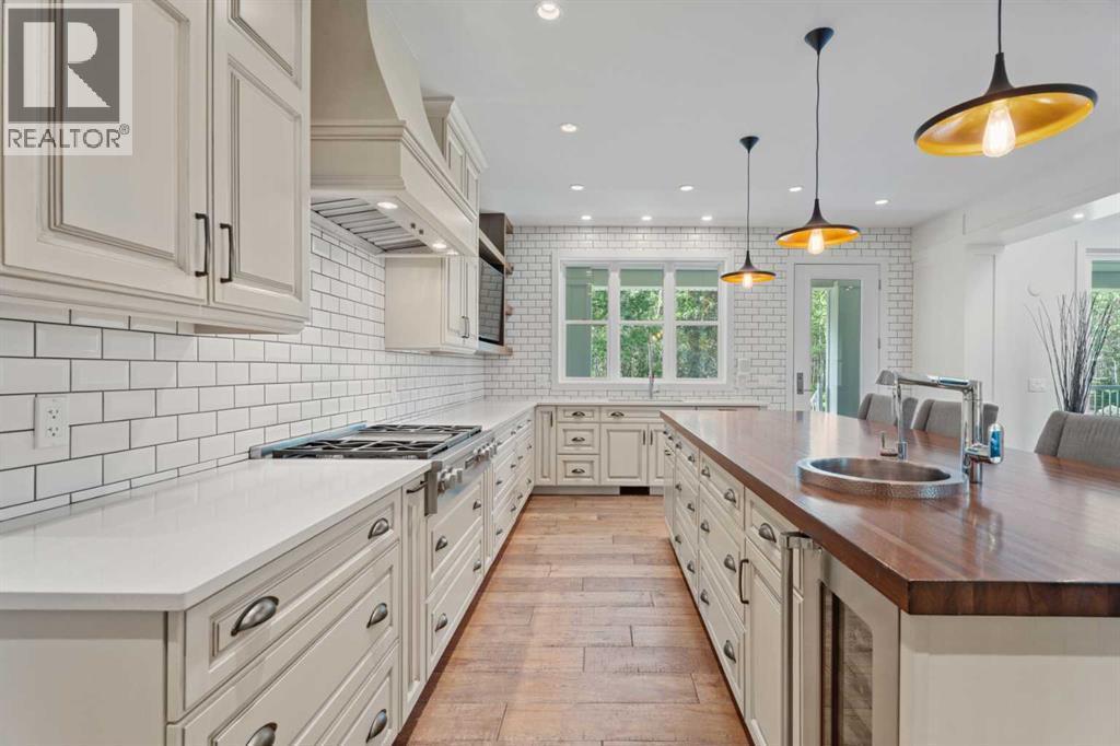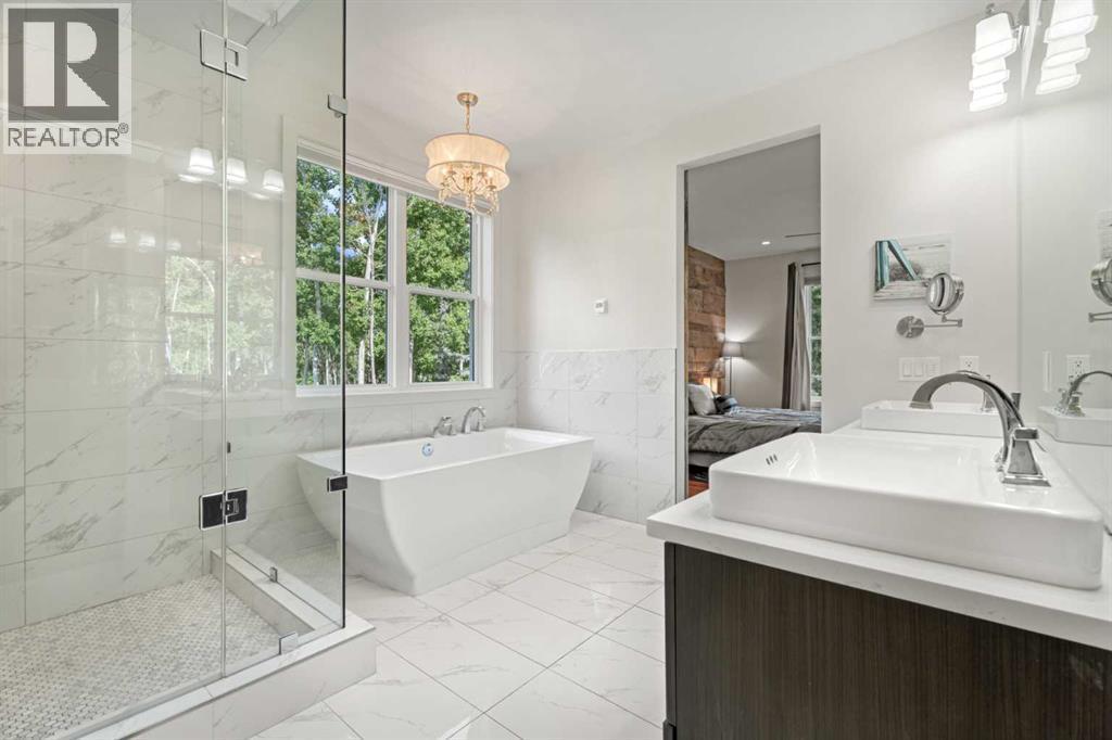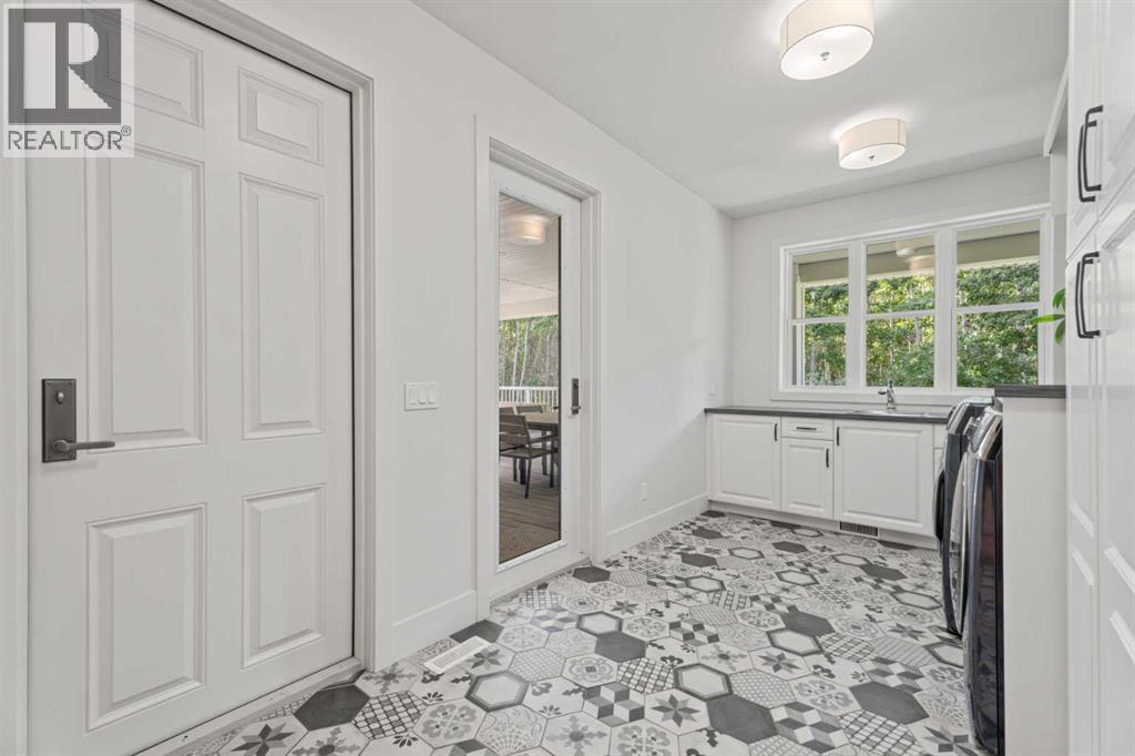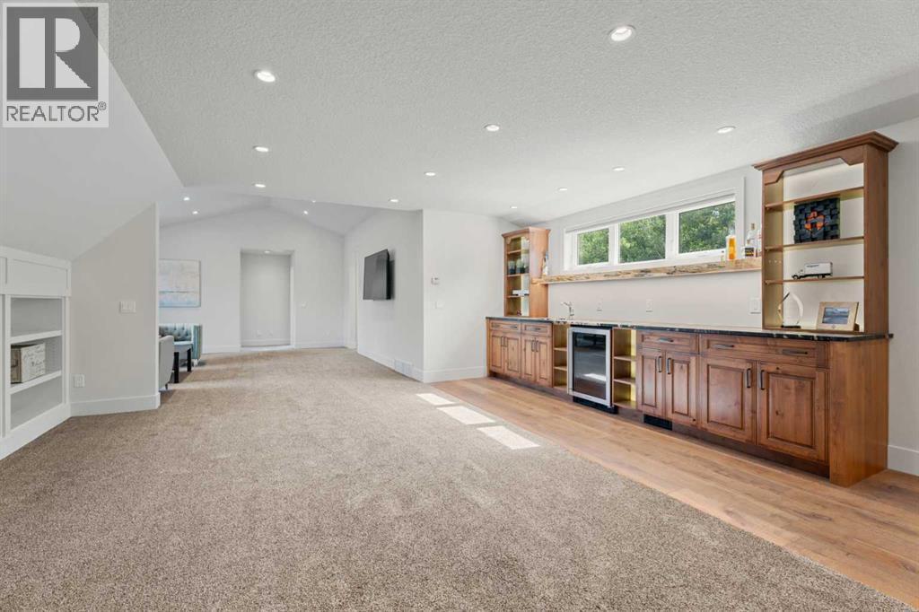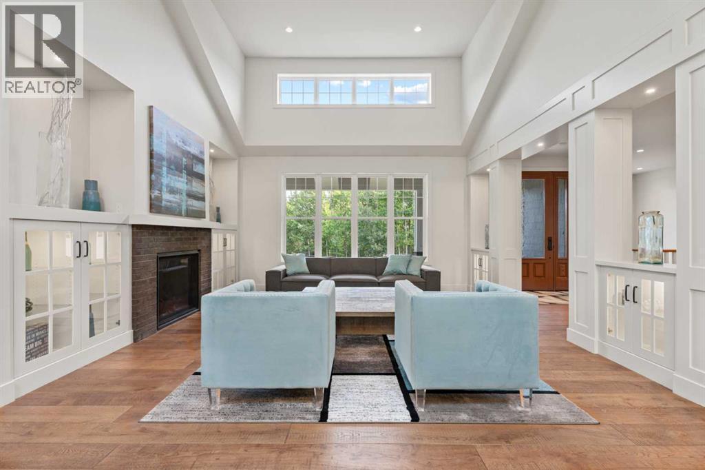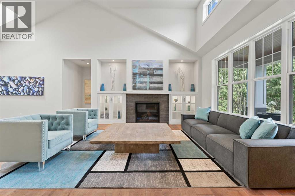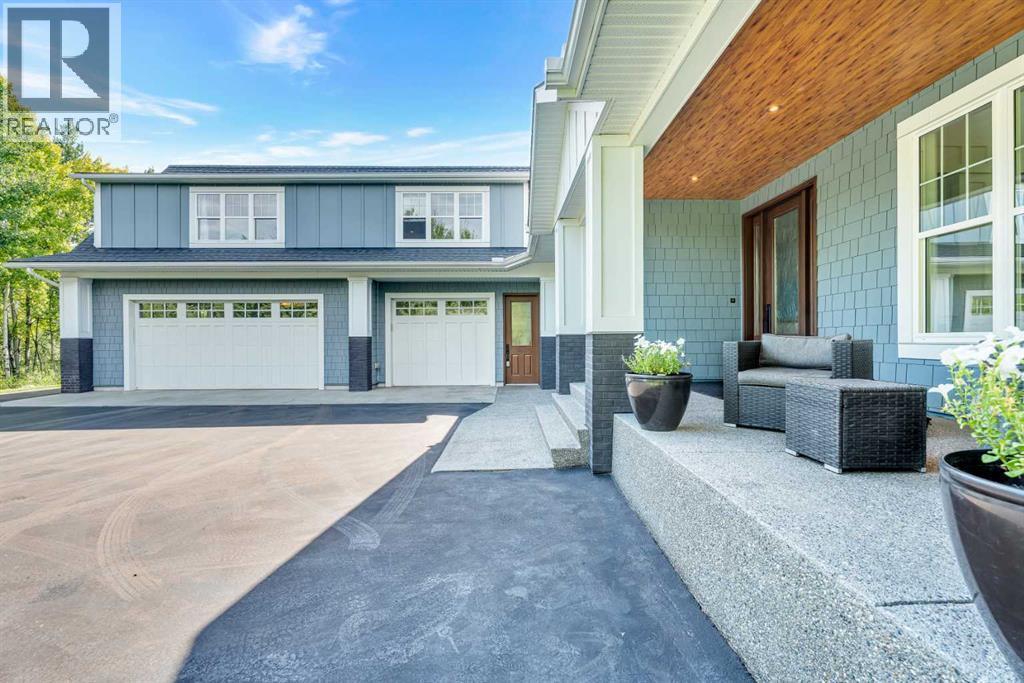 Car enthusiasts!! Set on 5.14 acres of stunning treed and open landscape, just minutes from Calgary and Okotoks, this exceptional custom-built modern farmhouse offers a rare balance of architectural refinement, privacy, and natural beauty. Designed for those who appreciate craftsmanship and quiet luxury, the home presents as a private estate—serene, elegant, and timeless. A paved, curved driveway leads to a gated entrance, introducing a picturesque setting of green space and mature trees. Inside, 17-foot vaulted ceilings and expansive windows fill the main living spaces with natural light, creating an immediate sense of openness and calm. The living room is anchored by a refined gas fireplace and custom built-ins, offering a warm and inviting atmosphere for both everyday living and intimate gatherings.At the heart of the home, a chef-inspired kitchen blends beauty and function, featuring premium Miele appliances, a substantial island with hammered stainless vegetable sink, and a concealed walk-in pantry. The adjoining dining area, enhanced by skylights, flows seamlessly onto a wrap-around deck through French doors—perfect for alfresco dining and peaceful moments overlooking the stunning views.The main-floor primary retreat is a sanctuary of comfort, with vaulted ceilings, a barn wood feature wall, and a spa-inspired ensuite complete with in-floor heating, freestanding soaking tub, walk-in glass shower, and a custom-fitted walk-in closet. A dedicated office, laundry room, and mudroom complete the main level with thoughtful functionality. Upstairs, above the garage, is a versatile bonus room with built-in bar and games area provides an inviting space for relaxation or entertaining, while two additional bedrooms with window seats share a beautifully appointed bathroom. The fully developed lower level offers a billiards area, full bar, spacious recreation room, and two more bedrooms—ideal for hosting guests.The HEATED 5-CAR GARAGE has 3 garage doors has dog wash and a work bench. With an RV hook-up, and private walking paths throughout the fully fenced property, this estate delivers elevated acreage living just moments from some of Heritage Pointe, Carmoney and Cottonwood Golf Courses plus city convenience. Contact your favourite realtor today to arrange a private showing. (id:6769)