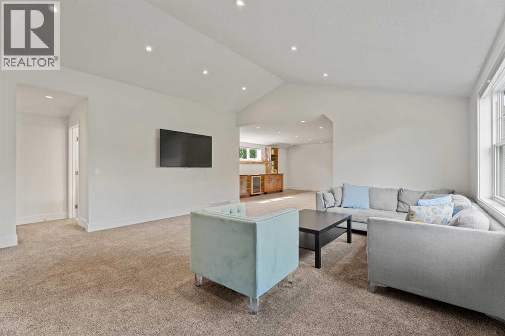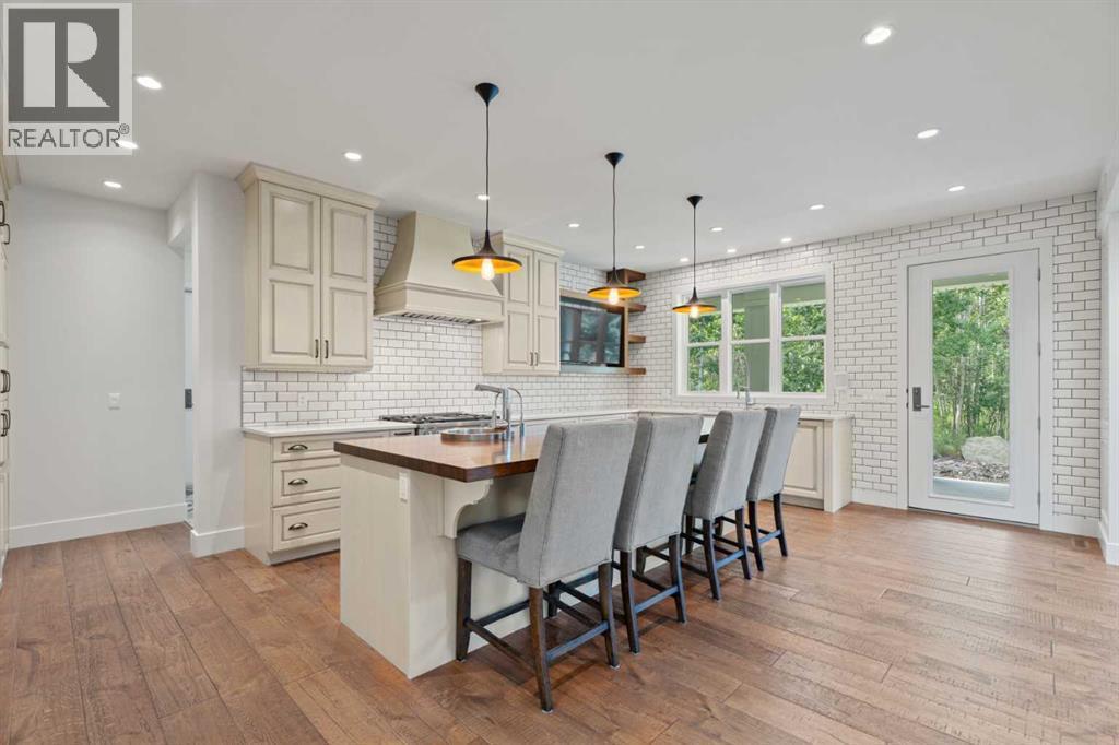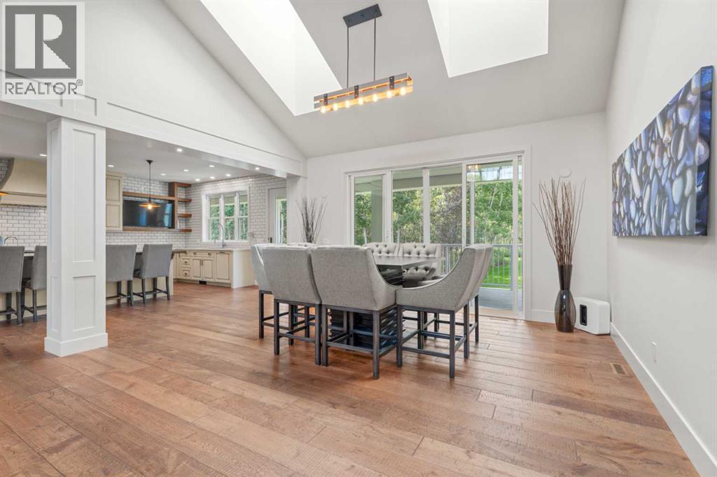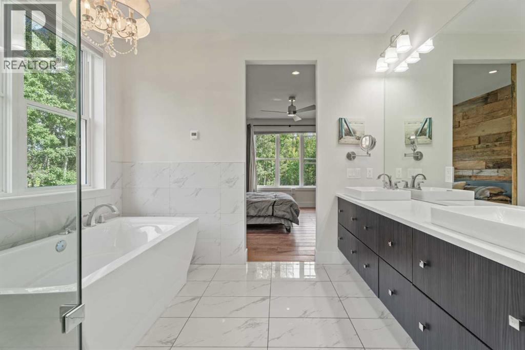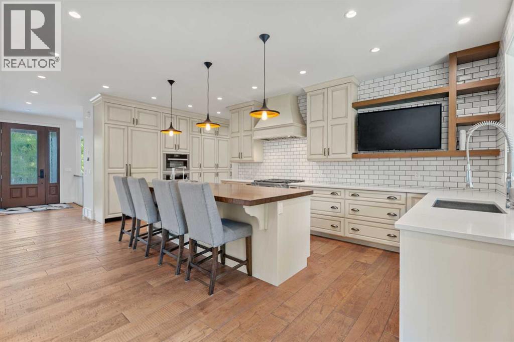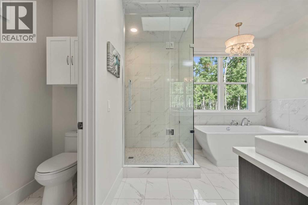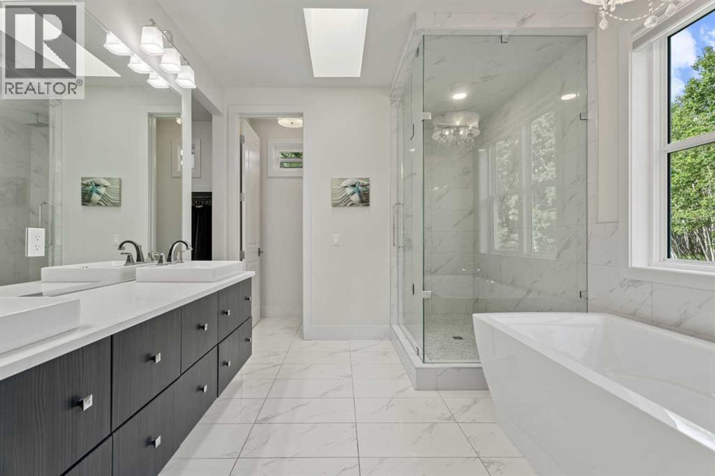 Car enthusiasts!! Set on 5.14 acres of stunning treed and open landscape, just minutes from Calgary and Okotoks, this exceptional custom-built modern farmhouse offers a rare balance of architectural refinement, privacy, and natural beauty. Designed for those who appreciate craftsmanship and quiet luxury, the home presents as a private estate—serene, elegant, and timeless. A paved, curved driveway leads to a gated entrance, introducing a picturesque setting of green space and mature trees. Inside, 17-foot vaulted ceilings and expansive windows fill the main living spaces with natural light, creating an immediate sense of openness and calm. The living room is anchored by a refined gas fireplace and custom built-ins, offering a warm and inviting atmosphere for both everyday living and intimate gatherings.At the heart of the home, a chef-inspired kitchen blends beauty and function, featuring premium Miele appliances, a substantial island with hammered stainless vegetable sink, and a concealed walk-in pantry. The adjoining dining area, enhanced by skylights, flows seamlessly onto a wrap-around deck through French doors—perfect for alfresco dining and peaceful moments overlooking the stunning views.The main-floor primary retreat is a sanctuary of comfort, with vaulted ceilings, a barn wood feature wall, and a spa-inspired ensuite complete with in-floor heating, freestanding soaking tub, walk-in glass shower, and a custom-fitted walk-in closet. A dedicated office, laundry room, and mudroom complete the main level with thoughtful functionality. Upstairs, above the garage, is a versatile bonus room with built-in bar and games area provides an inviting space for relaxation or entertaining, while two additional bedrooms with window seats share a beautifully appointed bathroom. The fully developed lower level offers a billiards area, full bar, spacious recreation room, and two more bedrooms—ideal for hosting guests.The HEATED 5-CAR GARAGE has 3 garage doors has dog wash and a work bench. With an RV hook-up, and private walking paths throughout the fully fenced property, this estate delivers elevated acreage living just moments from some of Heritage Pointe, Carmoney and Cottonwood Golf Courses plus city convenience. Contact your favourite realtor today to arrange a private showing. (id:6769)