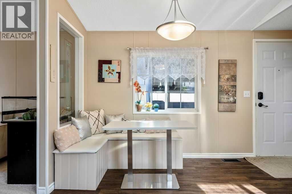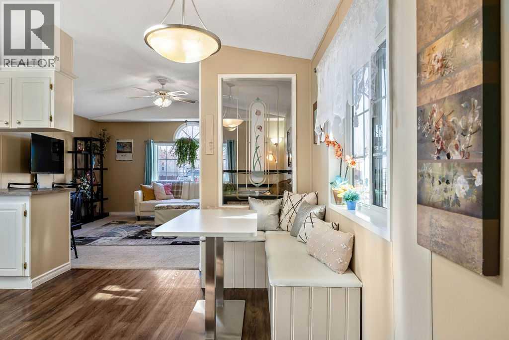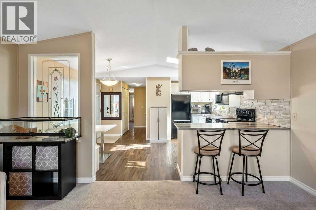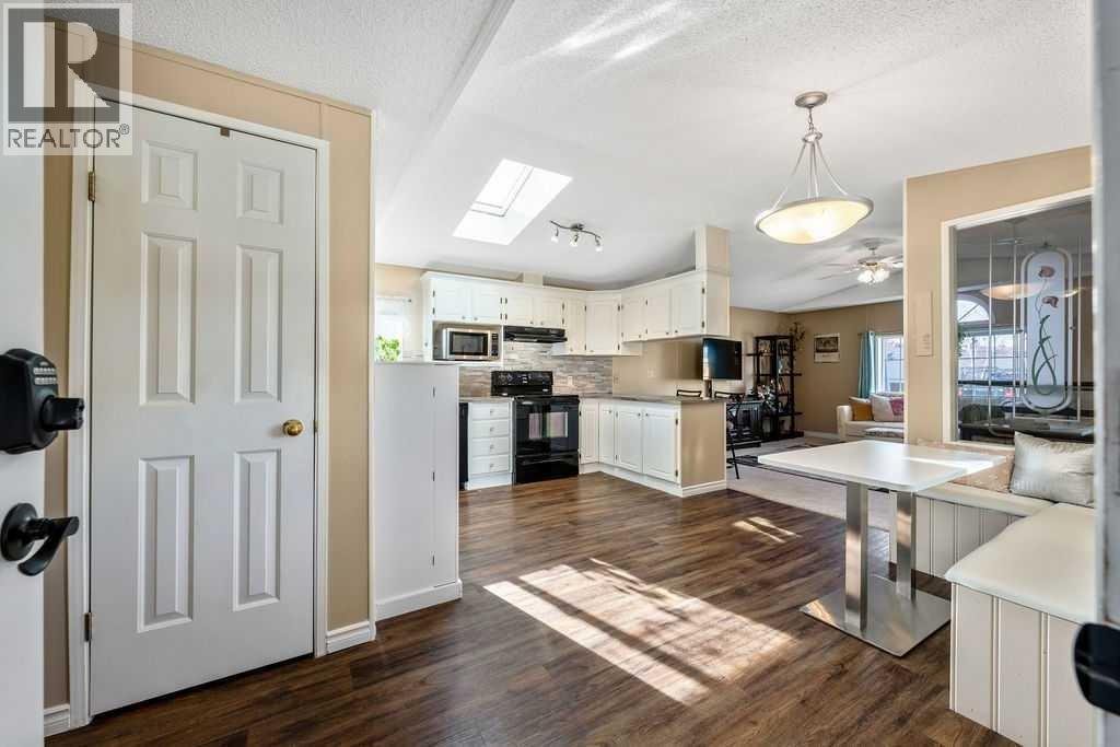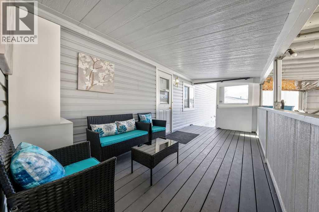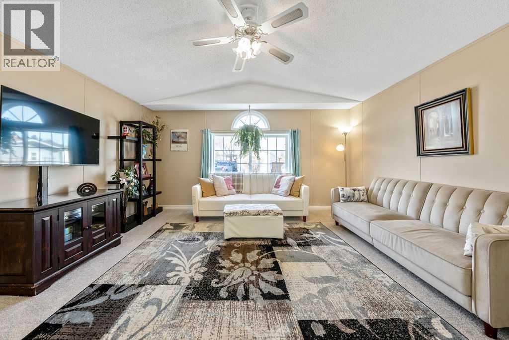 Unique opportunity to own a beautifully situated 1,034 sq. ft. single-wide mobile home set on a generously sized lot. The property offers outstanding outdoor functionality, including two large exterior sheds—ideal for storing motorcycles, snowmobiles, 4-wheelers, and other outdoor toys or seasonal equipment. There’s also a large paved driveway accommodating two vehicles, plus the bonus of an attached 2 vehicle carport. The cozy interior features vaulted ceilings and a skylight that floods the main living area with natural light, creating a bright, open, and welcoming atmosphere. You’ll also appreciate the abundance of cabinetry and generous counter space—perfect for everyday living.The thoughtful layout includes 2 bedrooms and 2 bathrooms, both generously sized with a huge covered deck attached. Enjoy living right in the heart of Okotoks, just steps from parks, pathways, historic downtown, the recreation centre, and shopping. Lot fees of $1,270/month include water, sewer, garbage, compost, recycling, and snow removal. Buyer approval is required by Cove Communities (see member remarks for additional details).Don’t miss this rare opportunity to enjoy tons of outdoor space, open concept living, storage, natural light , and the quaint lifestyle of Okotoks. (id:6769)