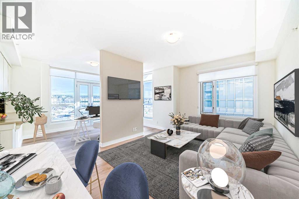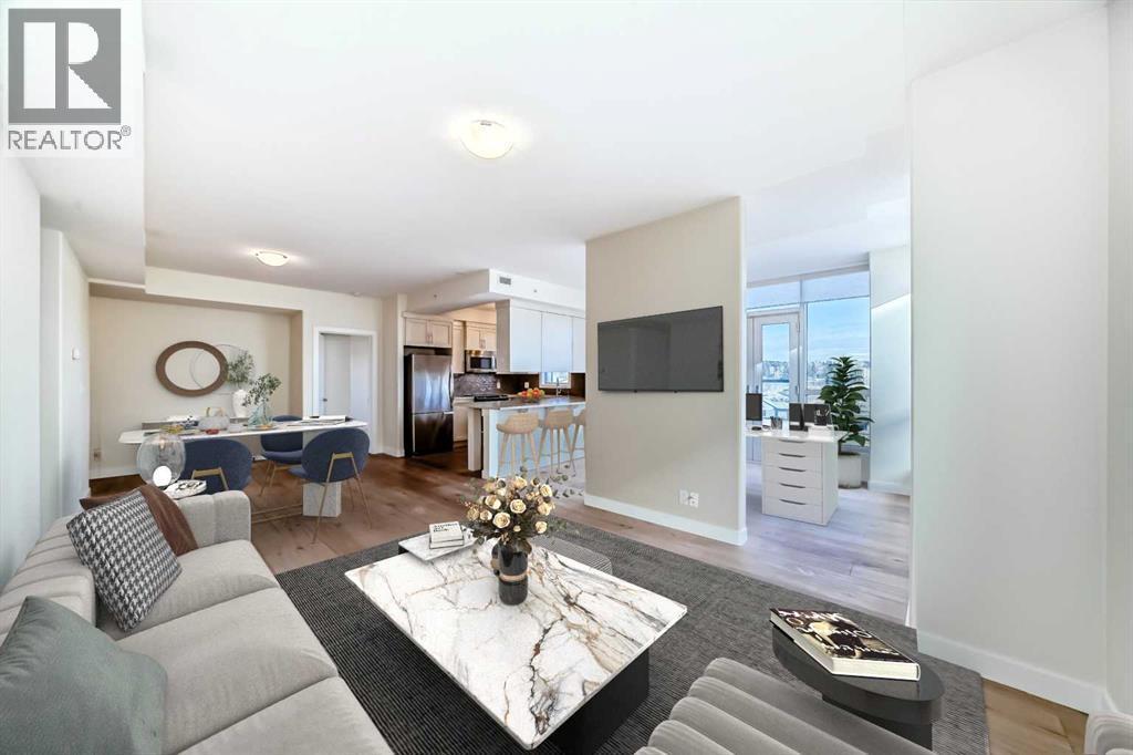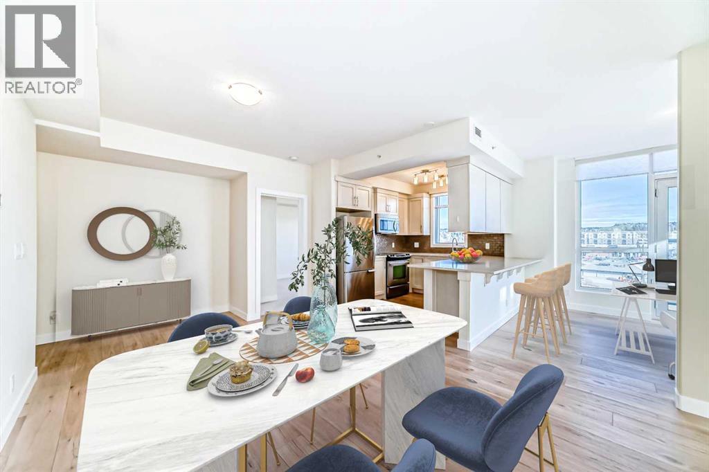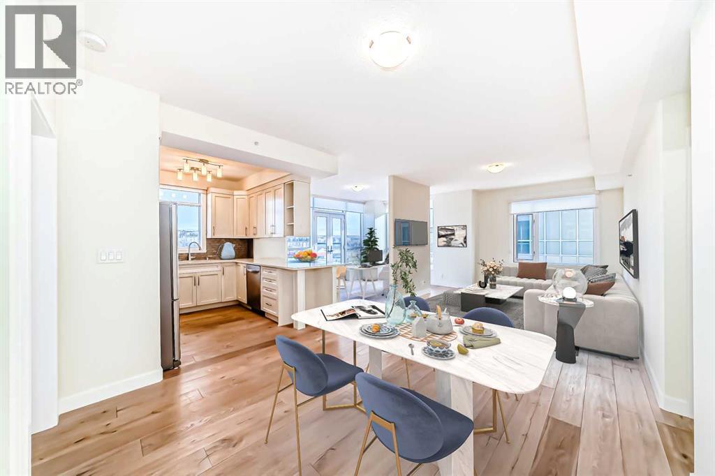 Experience elevated urban living in this gorgeous, light-filled corner residence. Located on the 8th floor of the prestigious Monterey One Tower, this 1,286 sq. ft. concrete-and-steel sanctuary offers a sophisticated blend of space and style. Upon entry, the well-appointed building lobby sets an upscale tone. Inside the suite, high ceilings and large windows bathe the open-concept layout in natural light. The versatile floor plan features a spacious living and dining area, complemented by a semi-enclosed, sunlit office/flex space - perfect for the remote professional. Bedrooms on either side of the suite ensure maximum privacy. The primary bedroom serves as a retreat, featuring a walkthrough closet leading to a 5-piece ensuite with quartz double vanities. Finished with engineered hardwood, light-toned paint, PLUS central air conditioning, every inch of this unit feels fresh and modern. The Groves was designed for a wellness-focused lifestyle, with a comprehensive fitness centre, steam rooms, a professional meeting room, and a wrap-around rooftop patio with panoramic views of the city skyline and the Rockies. Extra storage can be found in a separate assigned storage locker in the secure parkade. Love your Varsity lifestyle — just steps from the Dalhousie LRT and Dalhousie Station shopping, professional medical services, a pharmacy, and a delightful local coffee shop, plus convenient access to Market Mall, the U of C, and the Foothills Hospital. Make this special unit your new home in one of Calgary’s greenest communities. (id:6769)
