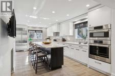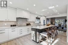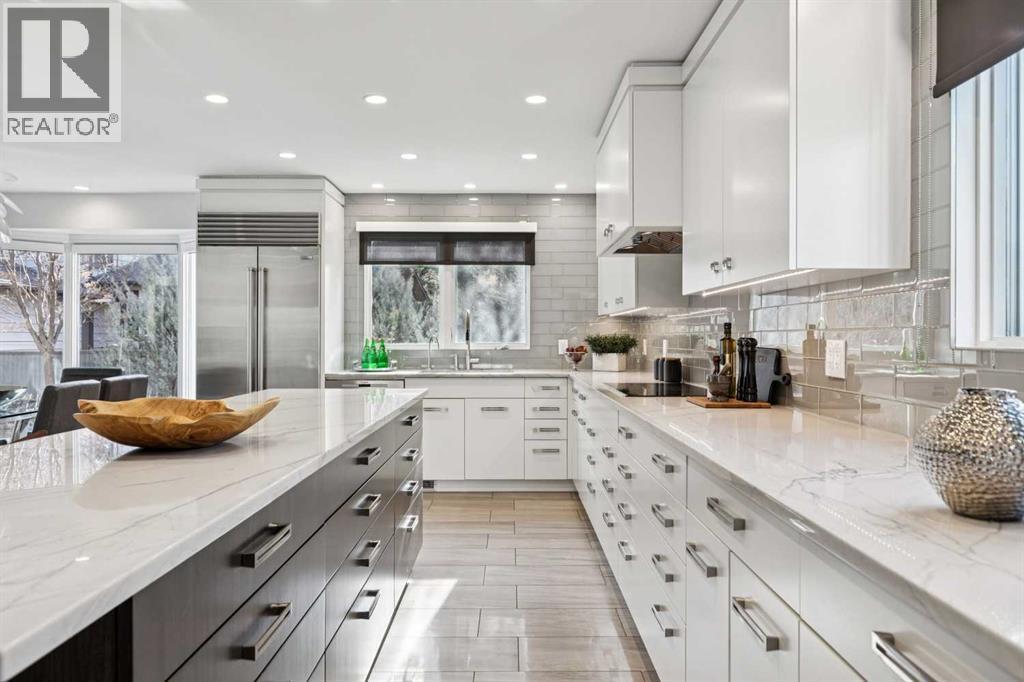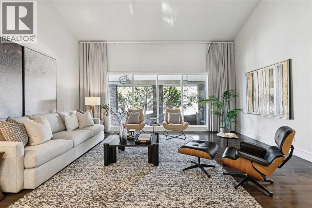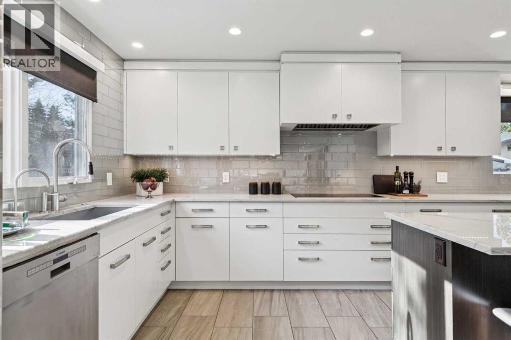 Bright + beautifully renovated executive family home with pleasing curb appeal, highlighted by a large covered front patio complete with heater — perfect for enjoying the outdoors year-round. This home shows beautifully + offers a warm, welcoming entrance that opens to a spacious living room with soaring ceilings + a huge picture window that fills the space with natural light. The chef’s kitchen is designed for both everyday living + entertaining, featuring abundant cabinetry + counter space, professional stainless steel appliances, a large island with seating + a generous informal dining area. Just steps down is the comfortable family room with a striking stone feature wall, gas fireplace, built-in shelving + wall-mounted TV. Oversized patio doors lead directly to the landscaped backyard. Upstairs you’ll find three well-sized bedrooms, convenient laundry + a family bath, along with a fantastic primary retreat. The primary bedroom is exceptionally spacious, offering extensive ample closing space, a spa-inspired ensuite + a huge private deck. The fully developed lower level adds even more living space with a large recreation room, bathroom with full steam room, guest bedroom + excellent storage. The big backyard is ideal for play + entertaining, complete with a fire pit. Additional highlights include fresh neutral paint, hardwood flooring, stylish light fixtures, lush carpeting + a double attached garage. Ideally located close to off-leash areas, parks, schools, Rockyview hospital + all amenities. (id:6769)