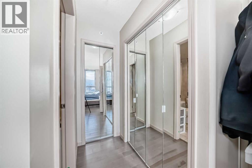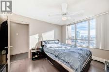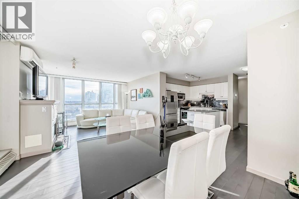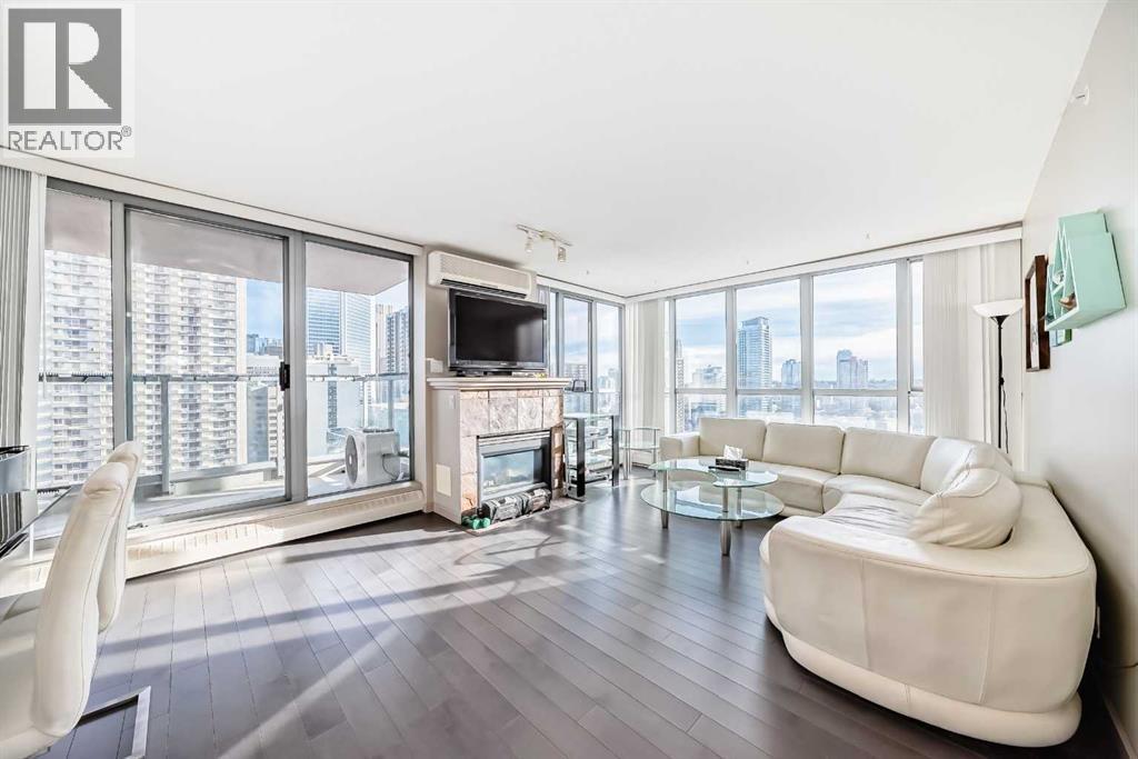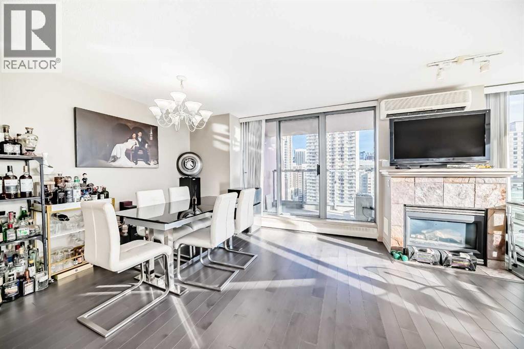 Discover elevated urban living in this beautifully appointed two-bedroom corner condo in the sought-after Axxis building, ideally located on the west side of downtown. Situated on the 18th floor, this bright and spacious unit is filled with natural light from oversized windows. The contemporary kitchen features stainless steel appliances and a functional island, perfect for everyday living and entertaining. Engineered hardwood flooring flows throughout the main living area, adding warmth and sophistication, while a wall-mounted A/C unit and cozy gas fireplace create a comfortable and inviting atmosphere. Step out onto the private balcony and enjoy the vibrant downtown setting. The thoughtfully designed layout includes two generously sized bedrooms, with the primary suite offering a full ensuite bathroom complete with a jetted tub. An open dining area provides ample space for hosting, and in-suite laundry adds everyday convenience. Residents enjoy excellent building amenities, including a fitness centre, a party room with a full kitchen for larger gatherings, a landscaped courtyard, bike storage, storage lockers, and gated visitor parking. Ideally located within walking distance to the C-Train station, restaurants, shopping, daycare, and the Bow River pathway system, this location truly can’t be beat. One heated, secure underground parking stall is included. Pet-friendly and exceptionally well located, this condo is an outstanding opportunity for downtown living. (id:6769)