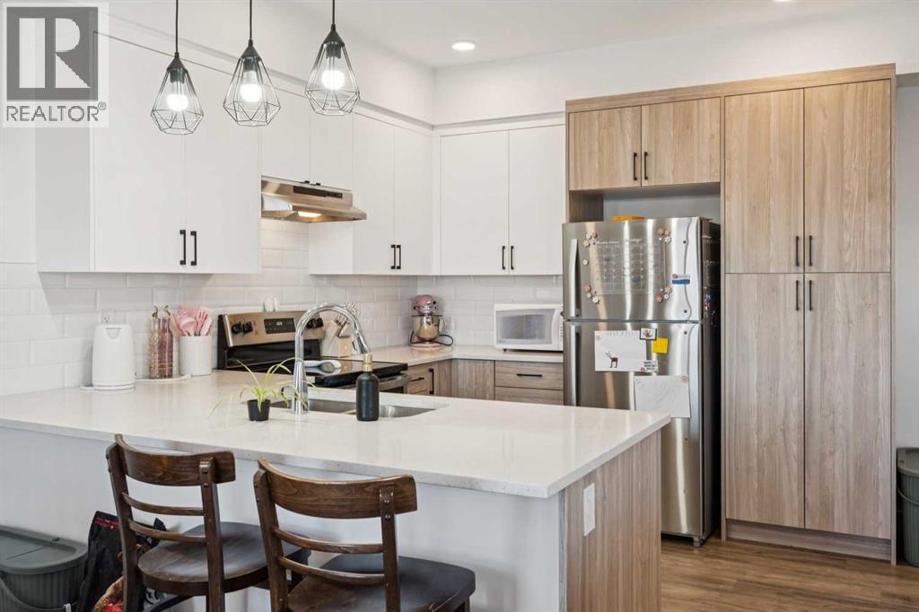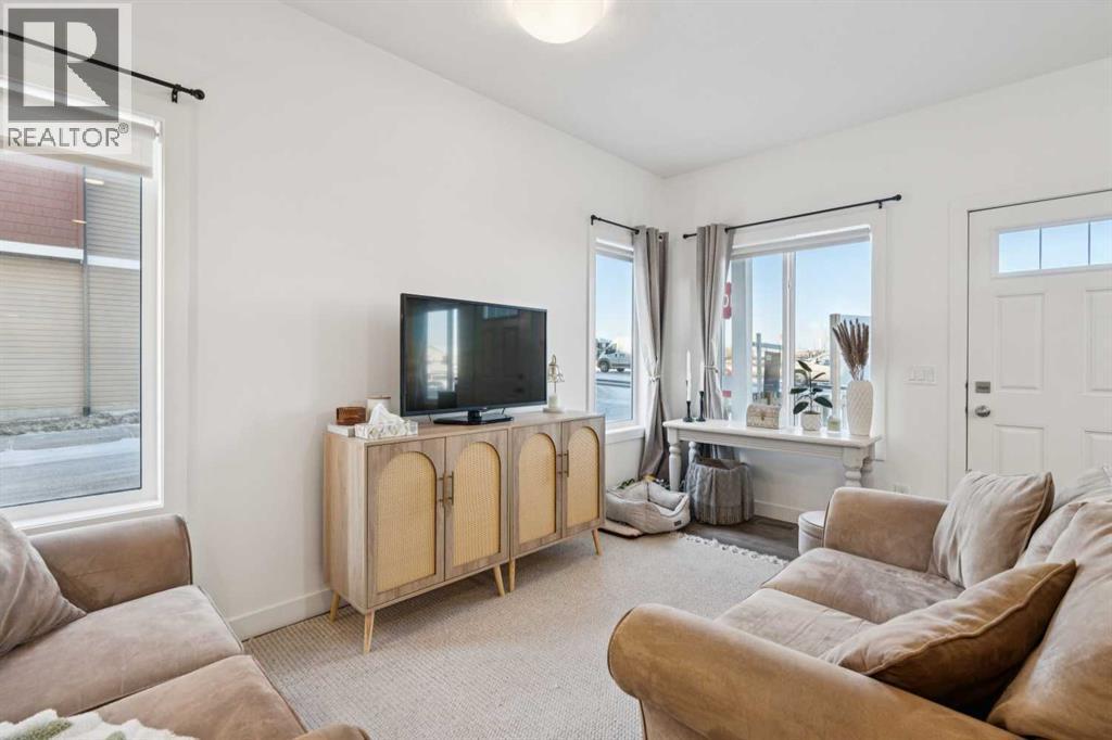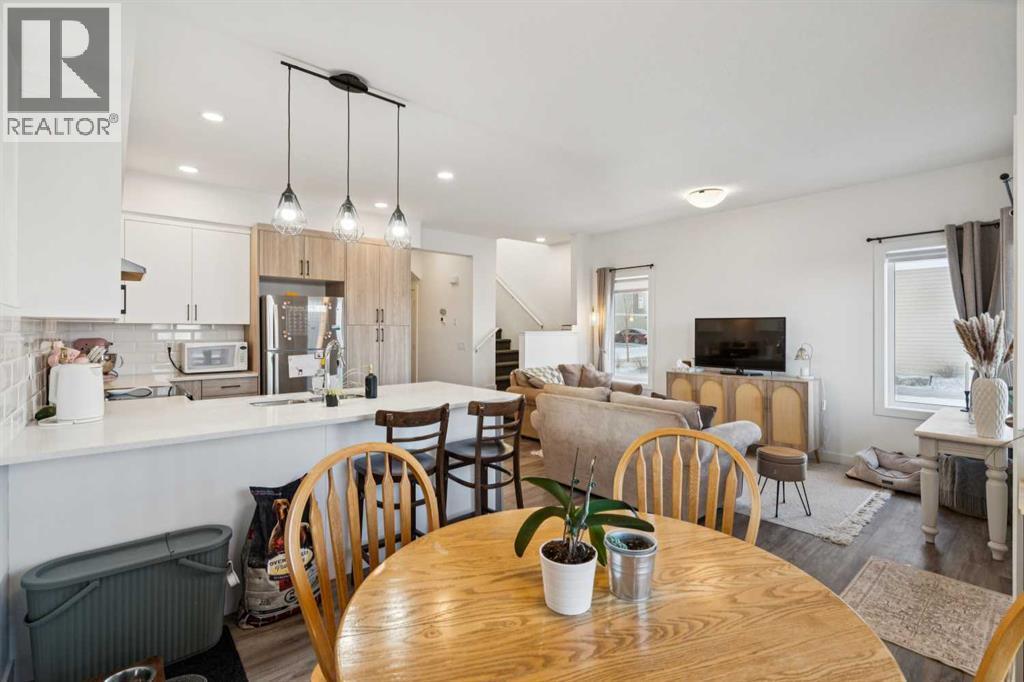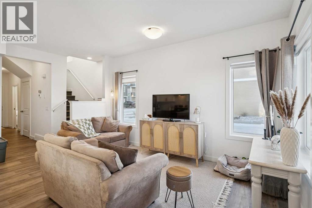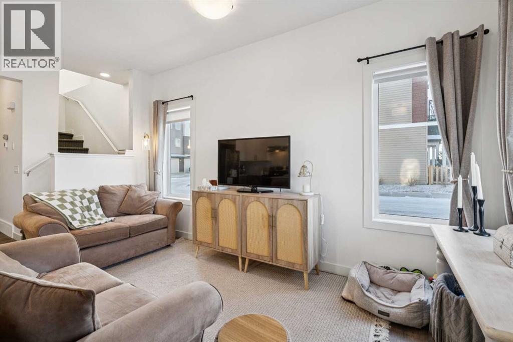 Discover the charm of contemporary living in this thoughtfully designed townhome. Filled with natural light from ample windows, the open-concept layout spans three inviting levels and offers beautiful mountain views. The stylish kitchen includes sophisticated cabinetry, quartz counters, a generous island, and stainless steel appliances. Offering 3 bedrooms, 2.5 baths. This home provides flexible living spaces. The primary bedroom boasts ample storage and direct access to the ensuite bath featuring a luxurious deep soaker tub/shower combo. A convenient half bath on the main level enhances functionality. Features include vinyl plank floors, main-level laundry, complete blinds, a single garage, and driveway plus street parking. Enjoy nearby pathways, local shopping, and convenient access to both Calgary and mountain adventures. (id:6769)