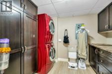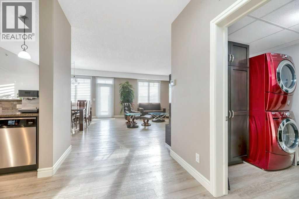 Enjoy quiet living with no unit above and a spectacular two-storey, south-facing balcony designed to capture warm sunshine, making it perfect for entertaining and summer barbecues. Ideally situated along the edge of Fish Creek Provincial Park, this award-winning complex offers direct access to miles of scenic walking, hiking, and cycling pathways, creating a true nature-lover’s retreat. This immaculate two-bedroom plus den, two-bathroom home features soaring 9-foot ceilings and a thoughtfully designed open-concept layout enhanced by upgraded laminate flooring and new plush carpeting throughout. The spacious foyer leads into a beautifully appointed gourmet kitchen complete with granite countertops, abundant espresso cabinetry, deep drawers, a corner pantry, and premium stainless-steel appliances including a Miele induction range, Miele dishwasher, and a French-door refrigerator with water and ice maker. The expansive living and dining areas are flooded with natural light from the sunny south exposure and seamlessly extend to the oversized balcony, creating an exceptional indoor-outdoor living experience. The primary suite offers a peaceful retreat with a walk-in closet and a four-piece ensuite featuring double sinks. A generously sized second bedroom is conveniently located beside the main four-piece bath. Both bedrooms showcase new top-grade carpeting and custom organizers. The dedicated den provides excellent built-in cabinetry, making it ideal for a home office or hobby space. In-suite laundry with a Maytag washer and dryer, central air conditioning, and condo fees that include all utilities add everyday comfort and convenience. This unit includes two titled, adjacent heated underground parking stalls and two secure storage lockers just steps from the elevator. Thoughtfully updated and meticulously maintained, recent improvements include ceiling fans in both bedrooms, custom cabinetry and high-end closet organizers, a retractable screen door, updated lighting in t he den and kitchen, a new shower door in the main bath, makeup mirrors in both bathrooms, and a programmable thermostat. Sanderson Ridge is renowned for its exceptional resort-style amenities, including a swimming pool, hot tub, steam room, fitness centre, bowling alley, movie theatre, woodworking shop, craft room, wine cellar, billiards room, and two car wash bays. Bright, spacious, and move-in ready, this home offers an unparalleled lifestyle in one of Calgary’s most sought-after adult communities. Welcome home! (id:6769)