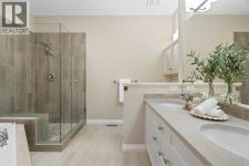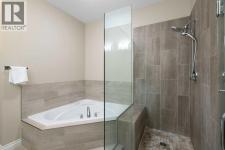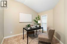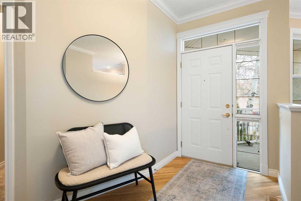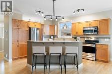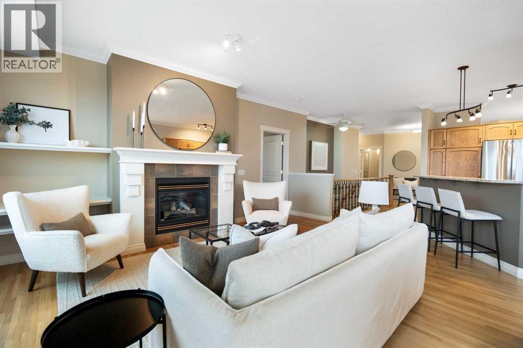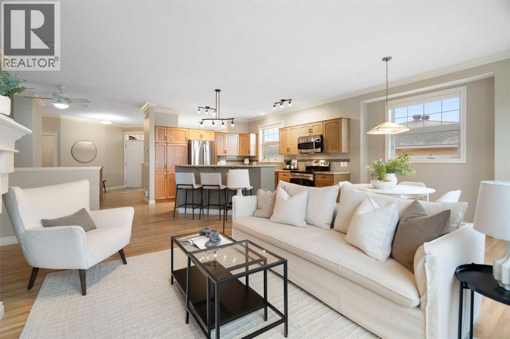 Hello, Gorgeous! Located in the desirable community of GlenEagles in Cochrane, this well-maintained walkout bungalow offers 1,408 sq. ft. above grade plus a fully developed lower level. The main floor features a bright living room with fireplace and valley views, a kitchen with granite countertops and raised island, a breakfast nook with access to the south-facing deck, and a formal dining area. A dedicated main-floor office/den provides flexibility for working from home. The primary bedroom includes a walk-in closet and 5-piece ensuite with in-floor heating and updated glass shower. Main-floor laundry and a powder room add convenience. The fully developed walkout basement offers two additional bedrooms, a 3-piece bathroom, a spacious recreation room with second fireplace, and access to the lower patio. Additional features include refinished hardwood floors, updated appliances, newer roof and hot water tank, upgraded attic insulation, central vacuum, and no Poly B plumbing. The double attached garage is insulated and drywalled with hot and cold water taps. Condo fees include landscaping, snow removal, exterior maintenance, and building insurance. Close to Highway 1A, pathways, and golf, this home offers comfortable living in a scenic setting. (id:6769)