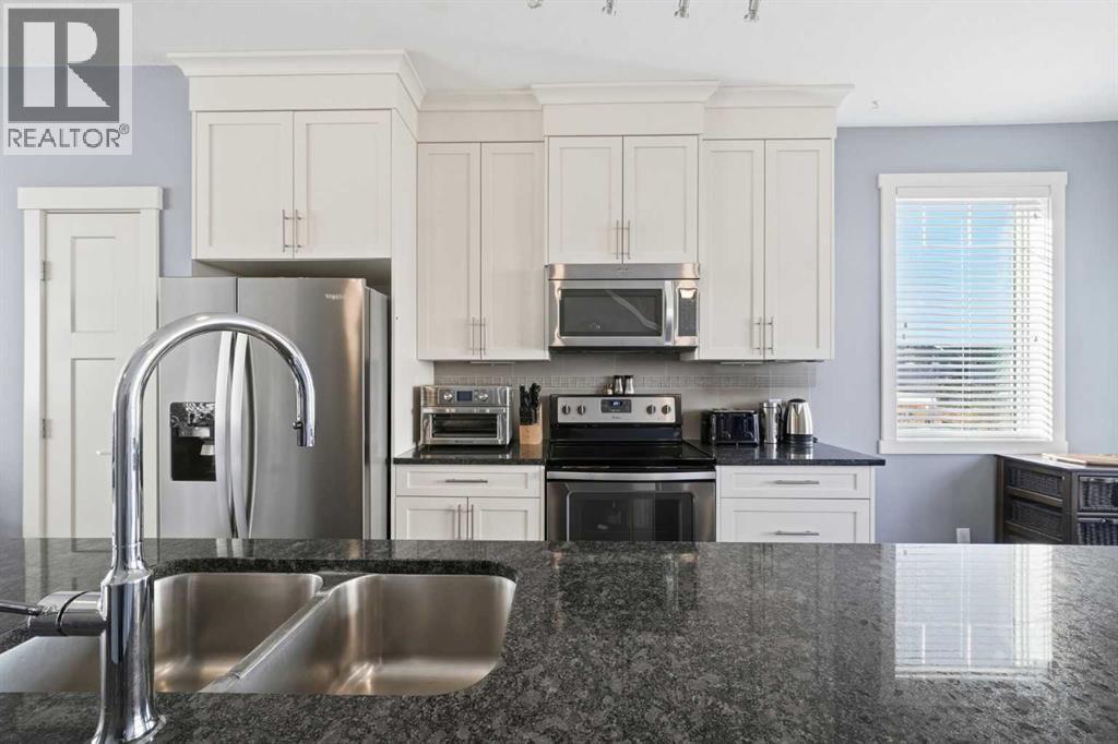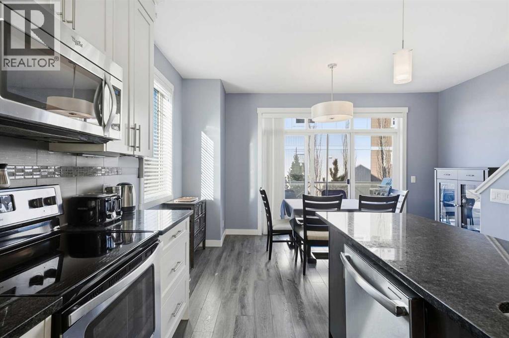 Welcome to this beautifully upgraded corner-unit townhome offering 2 primary bedrooms + den and 2.5 BATHS in a fantastic Calgary location. The bright living room features a stunning REAL STONE FEATURE WALL, custom built-ins, and an elegant electric FIREPLACE. The kitchen boasts granite countertops, a large island with eating bar, and flows into the formal dining area with access to a private balcony complete gas BBQ hookup.Upstairs you’ll love the VAULTED ceilings, convenient upper-floor laundry, and two spacious bedrooms including a generous master suite with room for a king-sized bed, walk-in closet, and a 3-piece ensuite featuring HEATED TILE flooring and an upgraded quartz vanity. The single attached garage includes CUSTOM SHELVING. Ideally located near visitor parking, schools, and shopping.A must-see corner unit with excellent upgrades and unbeatable convenience! (id:6769)