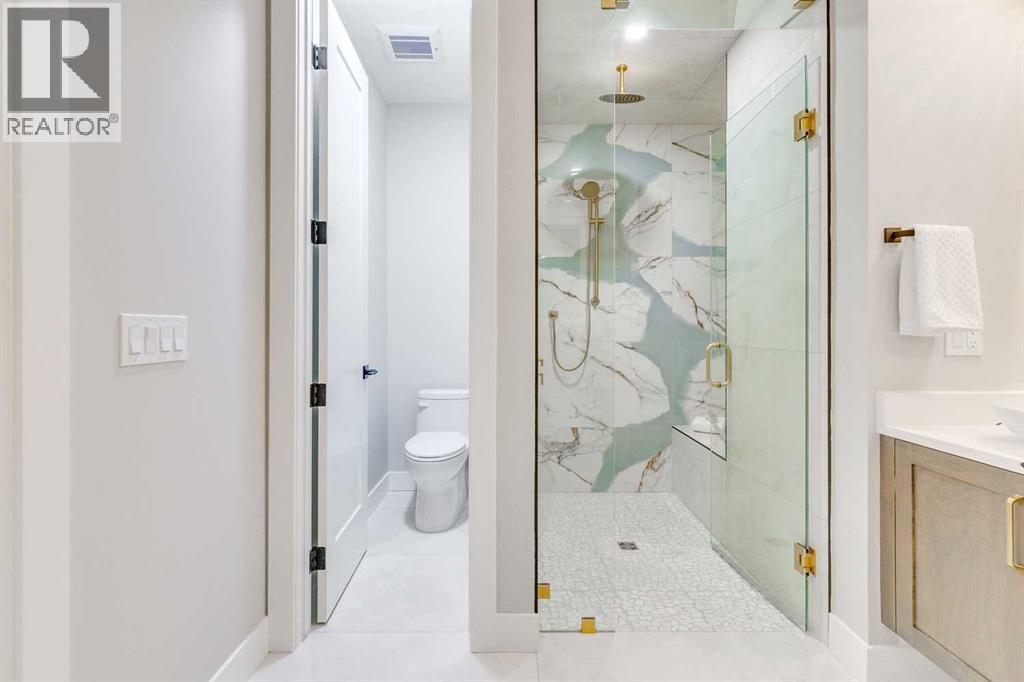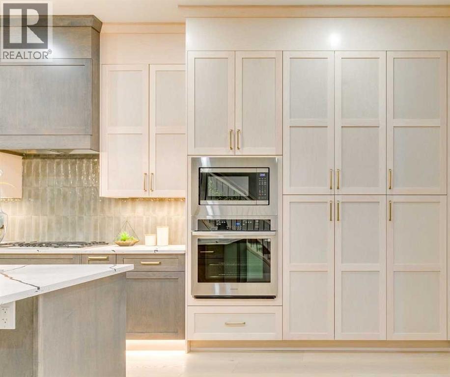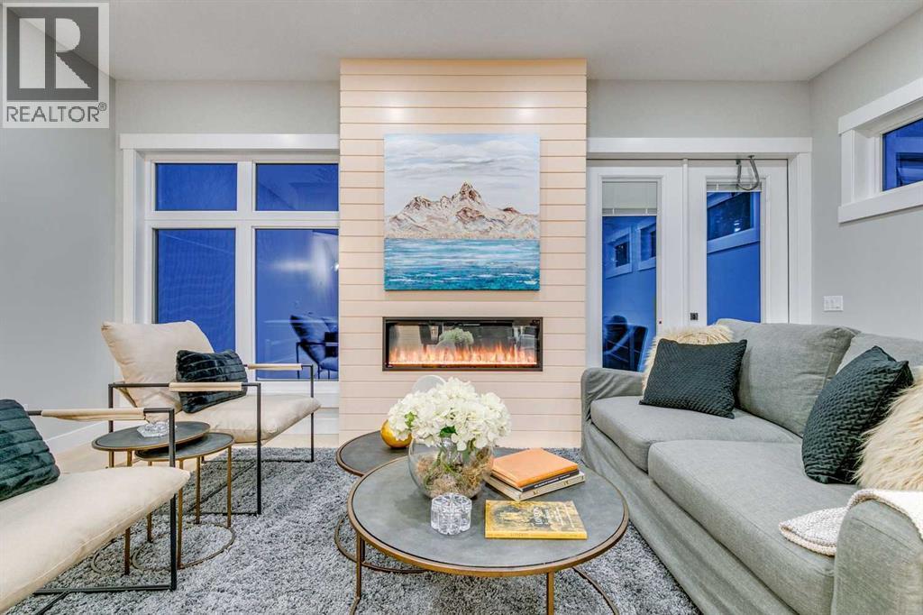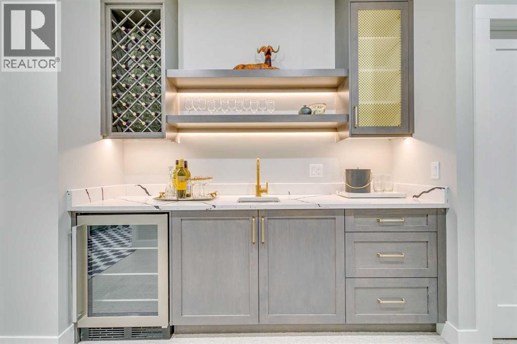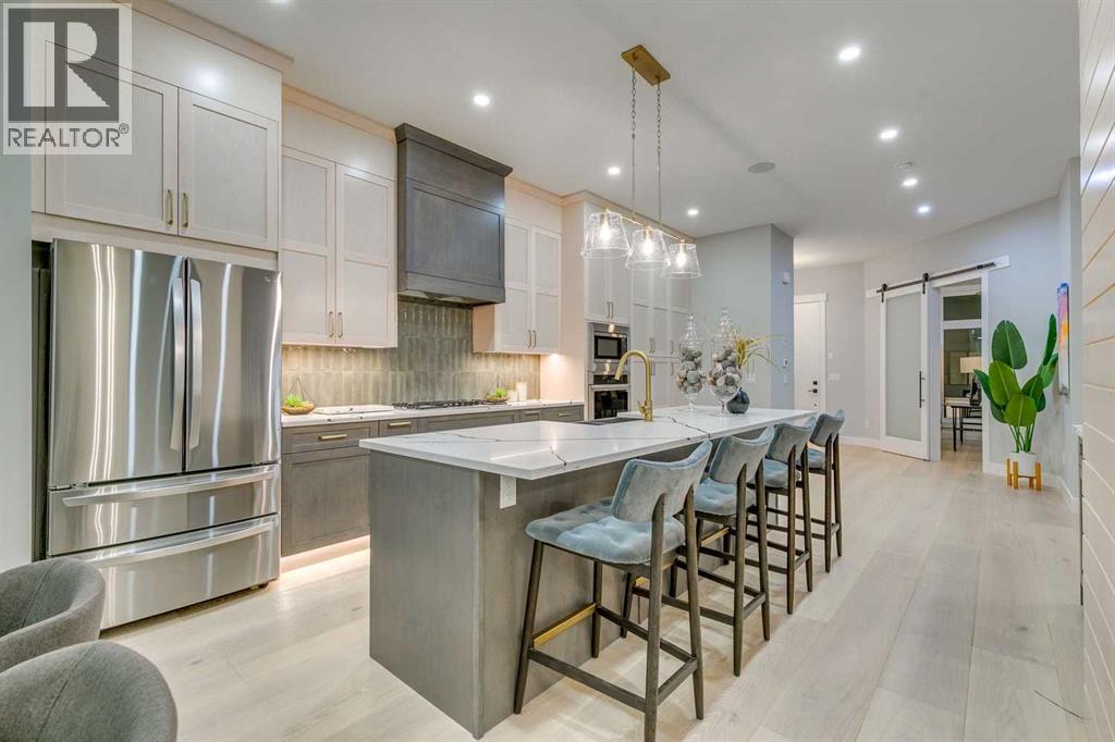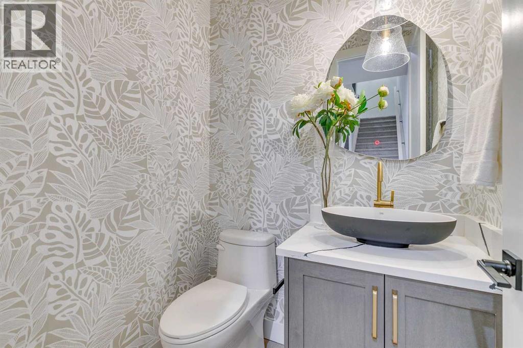 Experience refined inner-city living at 1413 27 Street SW. This meticulously crafted, never-lived-in modern residence offers over 3,000 sq ft of thoughtfully designed living space, blending high-end finishes, rare upgrades, and everyday functionality — all just minutes to Downtown, 17th Avenue, and Shaganappi Golf Course. Immediate possession available. The main floor impresses with soaring 10-foot ceilings, rich hardwood flooring, and expansive floor-to-ceiling windows that flood the space with natural light. A bright front den with oversized picture windows provides the perfect home office, study, or reading retreat. At the heart of the home, the gourmet kitchen is both striking and functional, featuring: Quartz countertops Shaker-style cabinetry with under-cabinet lighting Fireclay farmhouse sink Built-in spice racks Oversized island with concealed electrical outlets Premium built-in gas range and appliance package A rare and highly practical dumbwaiter elevator connects the garage and lower level directly to the kitchen — an exceptional feature seldom found in Calgary infills. The powder room is a true design statement, showcasing custom wallpaper accents, a gold-leaf ceiling, floating vanity, and backlit mirror — an unforgettable touch of luxury. Upstairs, the primary retreat offers a spa-inspired escape with floating dual vanities, ambient shelf lighting, oval mirrors, designer fixtures, a custom-tiled oversized shower, and a freestanding soaker tub. Two additional bedrooms, a versatile bonus lounge, and a full laundry room complete the upper level. The professionally finished basement is designed for entertaining, featuring a striking custom bar with black-and-gold detailing, a wine display wall, spacious recreation room, full bathroom, and additional storage. Outside, enjoy a private, low-maintenance yard and large patio — perfect for relaxing evenings or hosting guests. This is modern luxury without compromise — crafted for t hose who appreciate elevated design, thoughtful details, and unbeatable inner-city convenience. (id:6769)