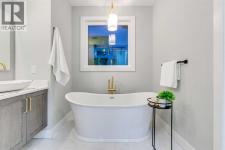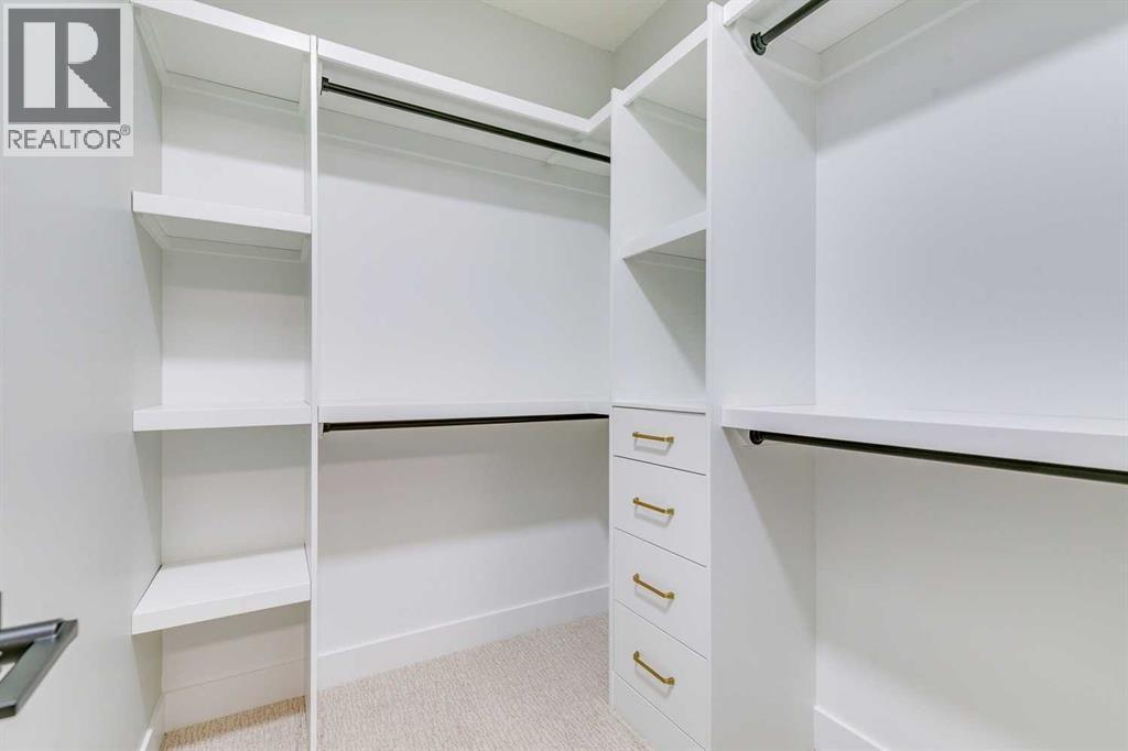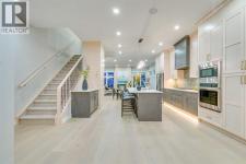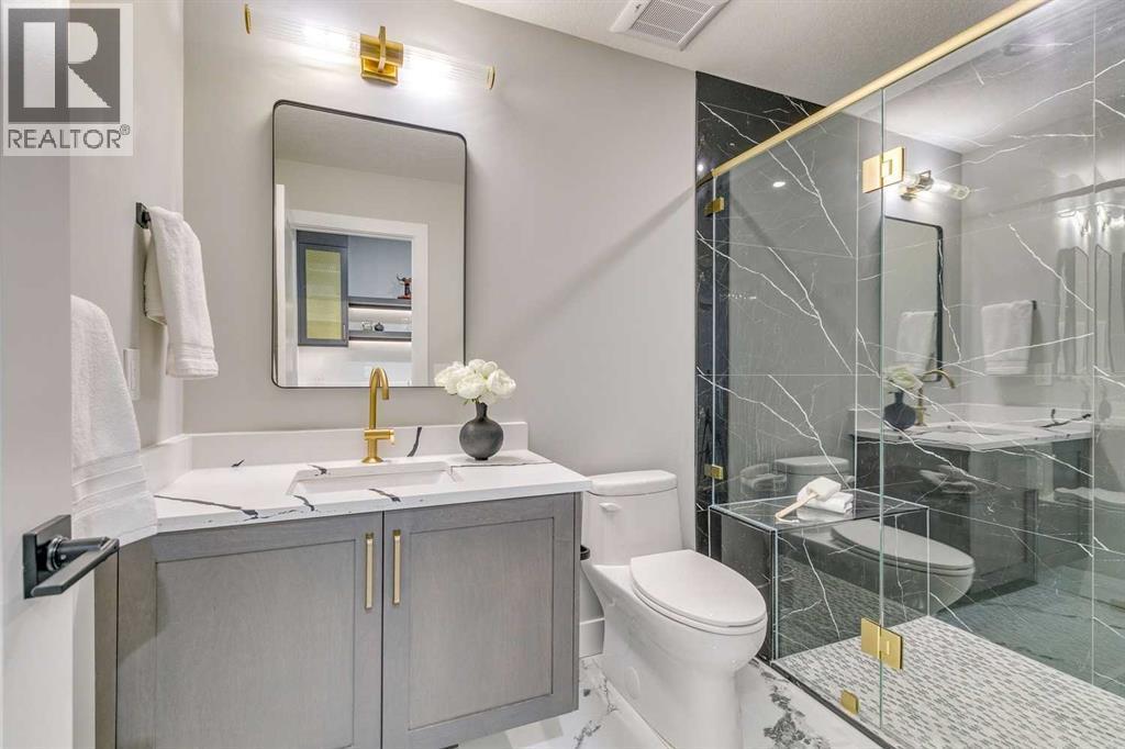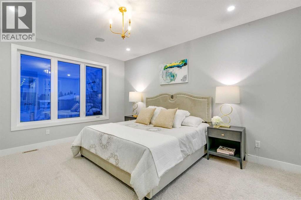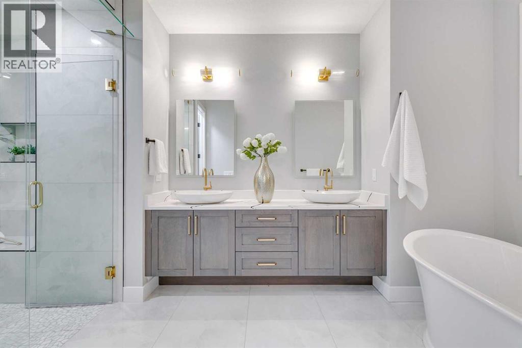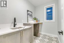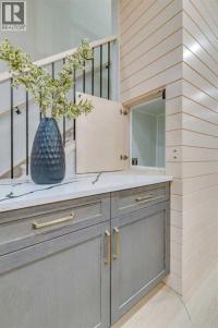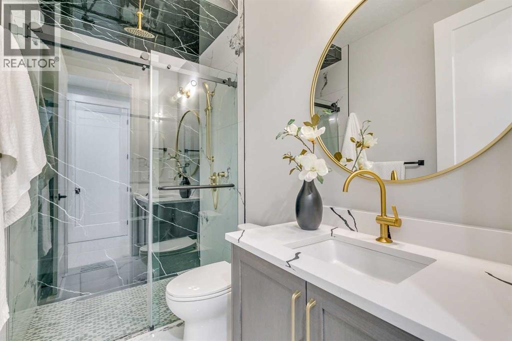 Experience refined inner-city living at 1413 27 Street SW. This meticulously crafted, never-lived-in modern residence offers over 3,000 sq ft of thoughtfully designed living space, blending high-end finishes, rare upgrades, and everyday functionality — all just minutes to Downtown, 17th Avenue, and Shaganappi Golf Course. Immediate possession available. The main floor impresses with soaring 10-foot ceilings, rich hardwood flooring, and expansive floor-to-ceiling windows that flood the space with natural light. A bright front den with oversized picture windows provides the perfect home office, study, or reading retreat. At the heart of the home, the gourmet kitchen is both striking and functional, featuring: Quartz countertops Shaker-style cabinetry with under-cabinet lighting Fireclay farmhouse sink Built-in spice racks Oversized island with concealed electrical outlets Premium built-in gas range and appliance package A rare and highly practical dumbwaiter elevator connects the garage and lower level directly to the kitchen — an exceptional feature seldom found in Calgary infills. The powder room is a true design statement, showcasing custom wallpaper accents, a gold-leaf ceiling, floating vanity, and backlit mirror — an unforgettable touch of luxury. Upstairs, the primary retreat offers a spa-inspired escape with floating dual vanities, ambient shelf lighting, oval mirrors, designer fixtures, a custom-tiled oversized shower, and a freestanding soaker tub. Two additional bedrooms, a versatile bonus lounge, and a full laundry room complete the upper level. The professionally finished basement is designed for entertaining, featuring a striking custom bar with black-and-gold detailing, a wine display wall, spacious recreation room, full bathroom, and additional storage. Outside, enjoy a private, low-maintenance yard and large patio — perfect for relaxing evenings or hosting guests. This is modern luxury without compromise — crafted for t hose who appreciate elevated design, thoughtful details, and unbeatable inner-city convenience. (id:6769)