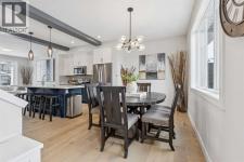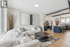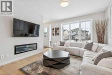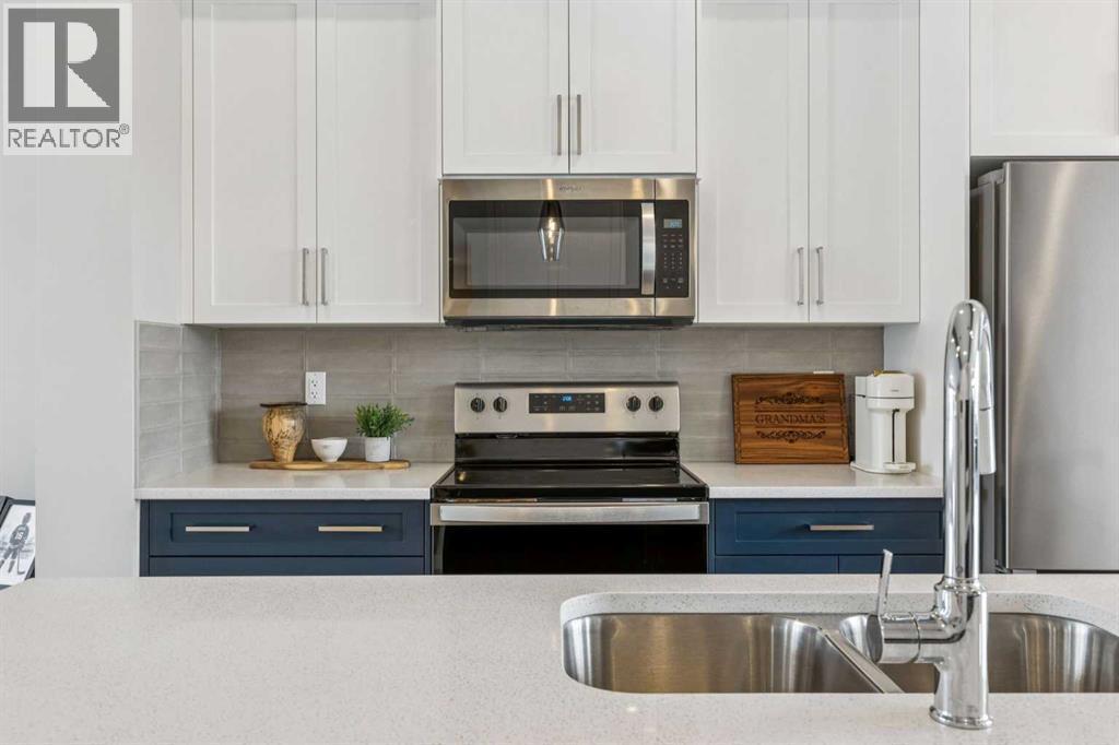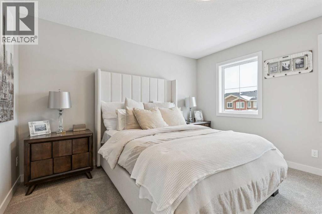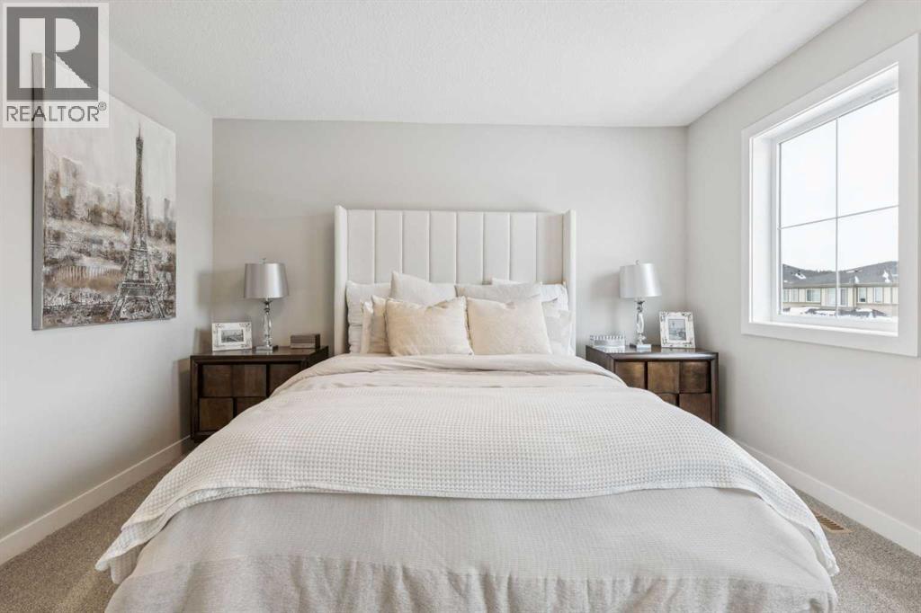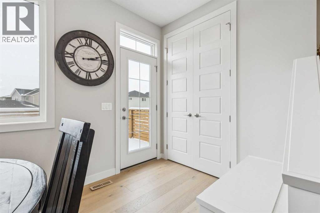 Located in the heart of Greystone in Cochrane, this home is just a short walk to parks, the Bow River, major shopping, and the extensive pathway system that runs along the river. Situated on a quiet street, you’ll love the east facing sun in the morning out back.Offering over 1,300 sq. ft. of thoughtfully designed living space, this beautifully upgraded 3-bedroom, 2.5-bath home blends style and function throughout.The open-concept main floor welcomes you with an impressive 8’ glazed front door, 9’ ceilings, and oversized windows making it feel so bright. Light Vinyl plank flooring flows seamlessly through the foyer, hallway, great room, kitchen, and nook, creating warmth and continuity.The kitchen is designed for both everyday living and entertaining. A 9’ single-level island with breakfast bar anchors the space, complemented by quartz countertops, dual banks of upper and lower cabinetry, a quad-door over-height pantry, 42” upper cabinets with painted bulkhead, pots and pans drawers, and soft-close doors and drawers throughout. The stainless steel appliance package includes a smooth-top electric range, microwave/hood fan combo, refrigerator, and built-in dishwasher.Exposed dropped beams add architectural character, while the bright great room and dining nook feature over-height windows and a full French rear door that leads to the backyard. A Napoleon “Entice” fireplace creates a cozy focal point. A double-door closet with built-in bench at the back completes the main floor.Upstairs, the spacious primary retreat features a 4-piece ensuite with twin undermount sinks, a large quartz vanity with drawers, ceramic tile flooring, and an oversized 5’ x 3’ maintenance-free shower. A bright walk-in closet is conveniently accessed from the bedroom.Two additional generously sized bedrooms with double-door closets share a stylish main bathroom with quartz countertops, undermount sink, and tile flooring. Second-floor laundry with ceramic tile adds everyday convenience.Per fect for families, investors, or downsizers, this home offers bright, spacious, and elegant living in one of Cochrane’s most sought-after communities. (id:6769)