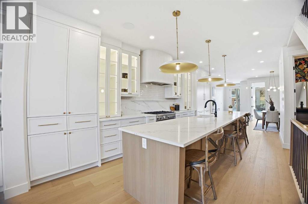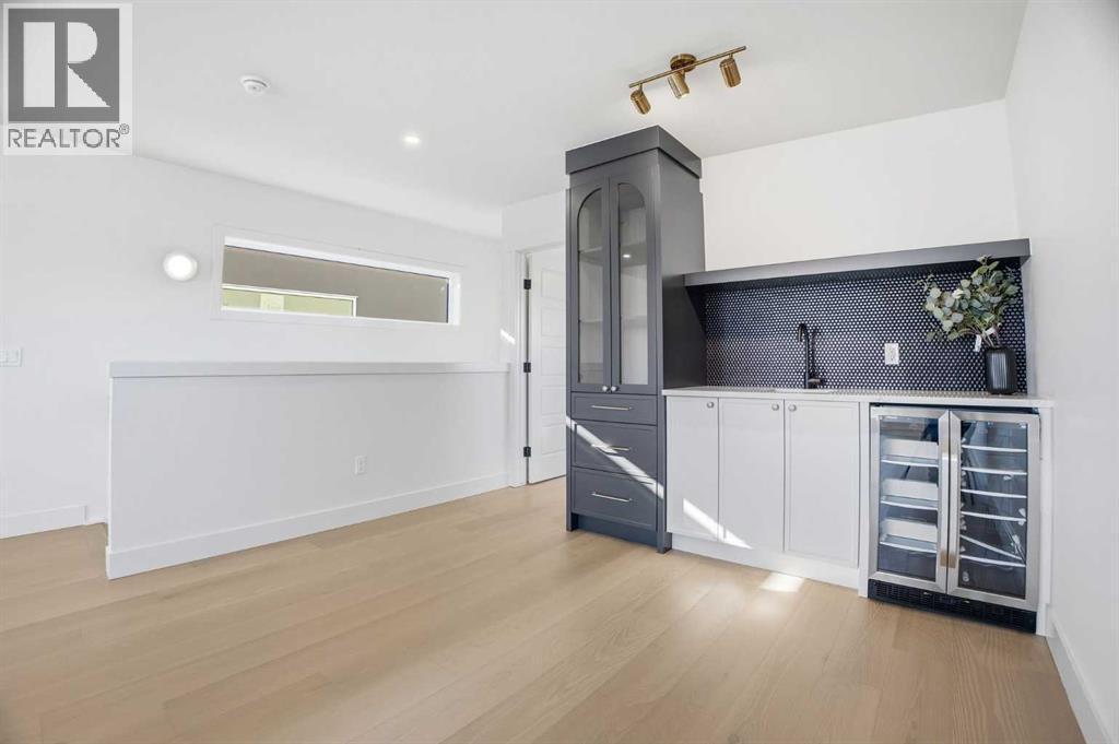 Located on a quiet street in sought after Richmond and situated on an extra deep 135’ lot allowing extra back yard space, this newly built and beautifully curated 4+1 bedroom residence offers panoramic views and over 4,200 sq ft of exceptional living space. The open, airy main level features hardwood floors, soaring ceilings, and an abundance of natural light. A stylish dining area with a designer fixture provides generous space for hosting, while the tastefully finished kitchen impresses with quartz countertops, a large island/eating bar, extensive storage, and high end appliances. The living room is anchored by a striking feature fireplace and custom built ins. A dedicated den/office is tucked just off the foyer—ideal for working from home. Completing the main level are a 2 piece powder room and a well appointed mudroom with built in bench and storage. The second level hosts three spacious bedrooms, a 5 piece Jack & Jill bath, and a laundry room with sink and ample cabinetry. The expansive primary retreat captures gorgeous views and includes a private balcony, dual walk in closets, and a luxurious 5 piece ensuite with dual sinks, a freestanding soaker tub, and a glass enclosed shower. The third level offers a versatile loft with access to a large west facing deck and a convenient wet bar—perfect for a media room, studio, or additional office space. A generous bedroom with its own 4 piece ensuite is ideal for guests. The fully developed basement is designed for entertaining, featuring a spacious family/media room with wet bar and wine storage. A fifth bedroom, 4 piece bath, and dedicated storage room complete the lower level. Additional highlights include rough in for air conditioning and built in speakers. Outside, enjoy the sunny west facing backyard with a patio and access to the double detached garage. This prime location offers close proximity to schools, shopping, vibrant Marda Loop, public transit, and effortless access to Crowchild Trail. (id:6769)