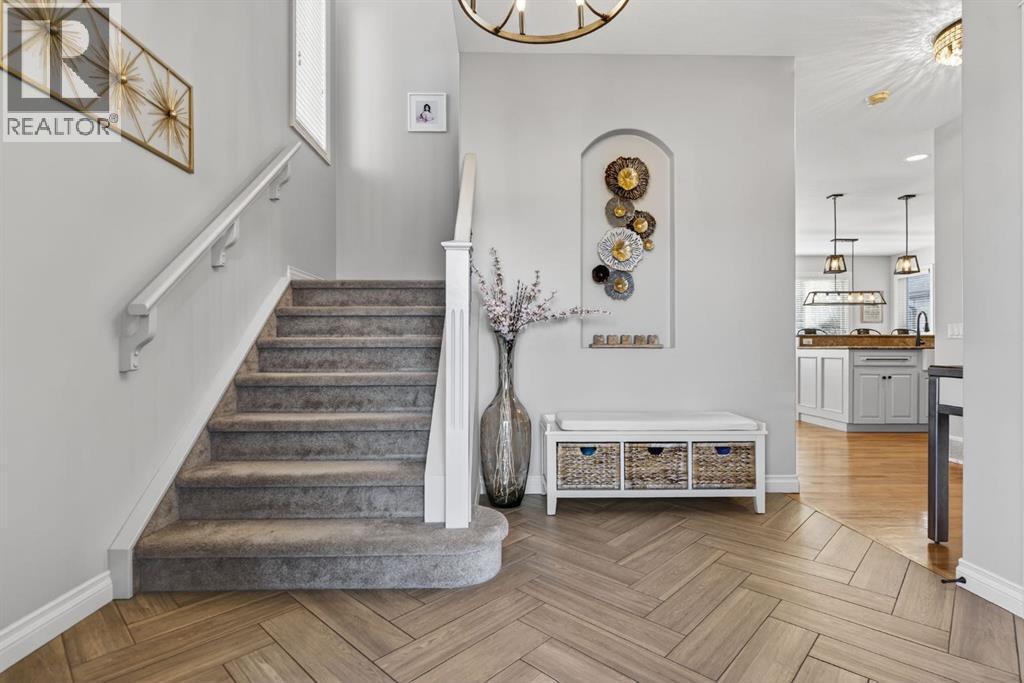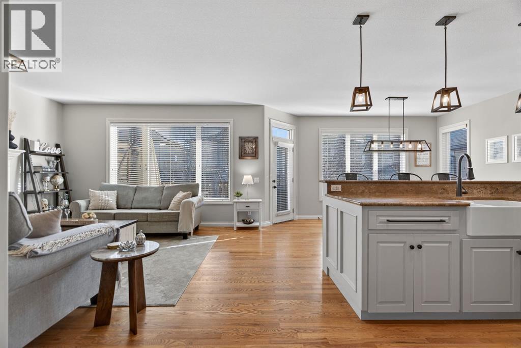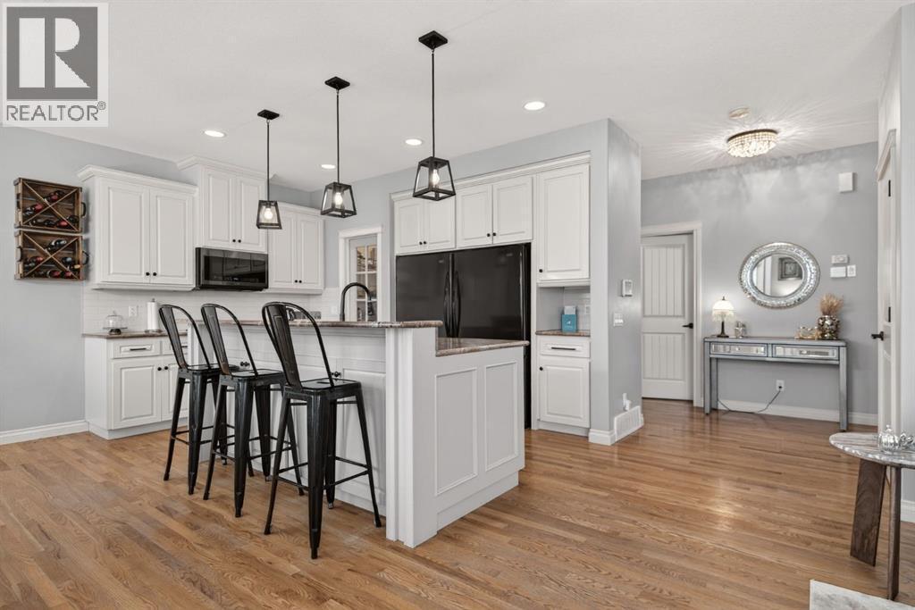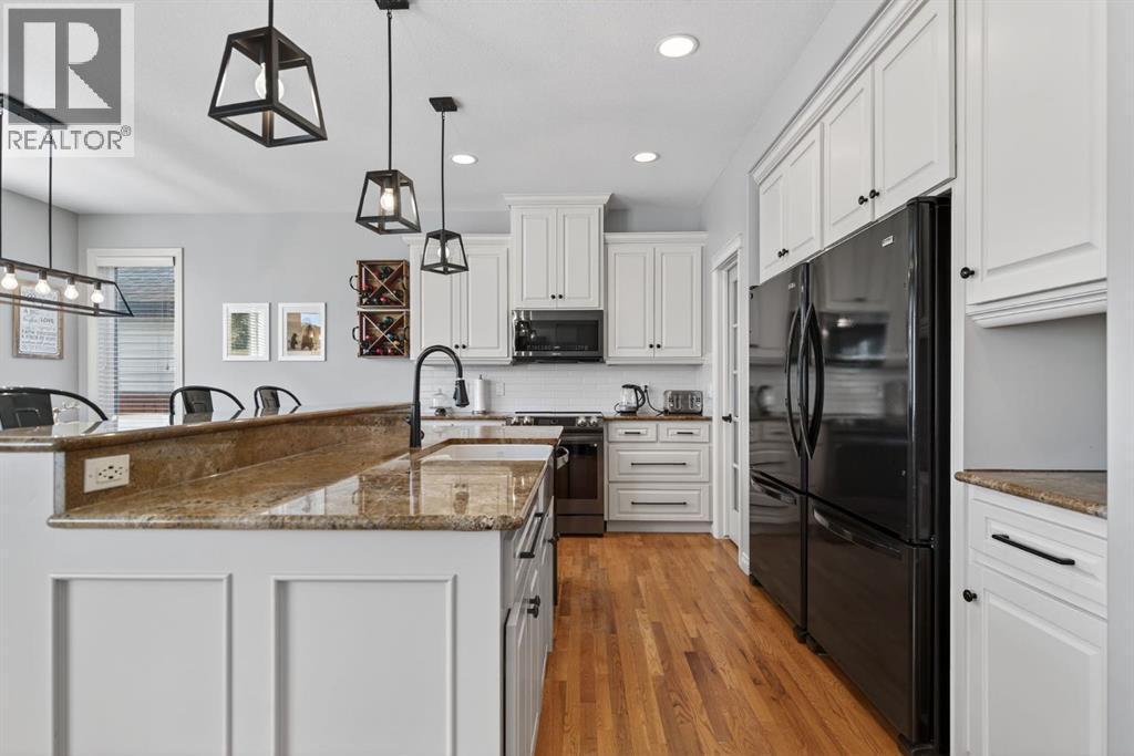 OPEN HOUSE THIS SATURDAY FEB. 21st from 230-430! Welcome to this beautifully updated, fully finished home that blends comfort, style, and everyday functionality. From the moment you arrive, you’ll notice the pride of ownership — featuring great curb appeal and an insulated, drywalled, heated garage, perfect for Alberta winters. Inside, you’re greeted by gleaming hardwood floors and a bright, open-concept layout enhanced by designer lighting, in-floor heating, central air conditioning, and a modern neutral colour palette throughout. The living room is warm and inviting, centered around a sophisticated fireplace — the perfect place to unwind while still feeling connected to the rest of the main floor. The kitchen is a true showstopper, designed for both cooking and entertaining. It features granite countertops, a massive double refrigerator, apron-front sink, timeless subway tile backsplash, raised breakfast bar island, and a convenient walk-through pantry that makes grocery days effortless. The dining area is surrounded by windows and elevated with chic lighting, creating an ideal space for family meals or hosting guests. The main level also offers a stylish powder room with trendy shiplap detailing, plus a practical laundry and mudroom just off the garage. Upstairs, the bonus room provides a great hangout space, open to below with extra windows that keep the area feeling bright and airy. The primary suite is a true retreat, with room for king-sized furniture, a large walk-in closet, and a spa-inspired ensuite complete with dual sinks, a deep soaker tub, and separate shower. Two additional bedrooms are spacious and share a well-appointed 4-piece bathroom. The fully finished basement is filled with natural light and additional pot lighting for the evenings. Whether it’s movie nights or game days, the rec room — featuring a barn wood feature wall and cozy electric fireplace — is the perfect gathering space. You’ll also find a fourth bedroom, full bathroom, and flexible space for a gym, hobby room, or guests. Step outside to the composite deck overlooking the peaceful backyard — perfect for summer BBQs or relaxing evenings, the private yard is surrounded by mature trees with plenty of room for kids and pets to play. Located in the sought-after community of Cimarron Springs, you’ll enjoy access to 20 acres of green space, a central park with playground and toboggan hill, over 8 km of pathways, and close proximity to the escarpment, Sheep River, and local schools — making this an incredibly walkable, family-friendly neighbourhood. (id:6769)
