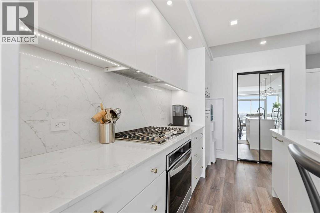 Welcome to Gateway by Truman, where striking contemporary design meets unrivalled urban convenience in Calgary’s highly sought-after West District. This exceptional and sun-drenched 2-bedroom, 2-bathroom unit combines sophisticated modern luxury with seamless everyday functionality. Featuring impressive 9-foot ceilings, expansive floor-to-ceiling windows, and rare custom luxury flooring unlike any others in the building. This residence is filled with inviting natural light and boasts an airy, open-concept layout perfect for both serene relaxation and vibrant entertaining. The gourmet, chef-inspired kitchen showcases elegant quartz countertops, premium full-height soft-close cabinetry, under-cabinet lighting, and top-of-the-line stainless-steel appliances including a gas cooktop and built-in oven. The generous primary suite includes a walk-through closet and an opulent ensuite with double vanities and a glass-enclosed shower, while the second bedroom and full bath provide flexible space for guests, roommates, or a dedicated home office setup. Step onto your oversized, sun-drenched private balcony to enjoy tranquil south exposure and spectacular evening sunsets, complete with a gas line for BBQ or outdoor heating. For all your storage needs, two additional storage lockers are included. Additional conveniences include in-suite laundry, titled underground parking, and access to exceptional on-site amenities such as the owner’s lounge, secure bike storage, and a breathtaking expansive rooftop terrace. Strategically situated just steps from charming boutique shops, cafés, Sobeys and the new West District retail corridor, this residence offers an enviable, unparalleled lifestyle. At its heart lies Radio Park, an award-winning 8-acre urban green space that serves as the community’s social centrepiece. With walking paths, an amphitheatre, a skating pond, and diverse year-round recreational programming, it’s one of Calgary’s most thoughtfully designed public parks, effortless ly blending nature, art, and community life. Experience sophisticated, elevated living in one of West Calgary’s most dynamic and highly desirable neighbourhoods, where luxury, location, and lifestyle perfectly converge. (id:6769)