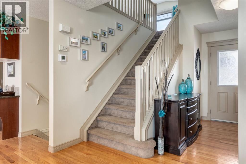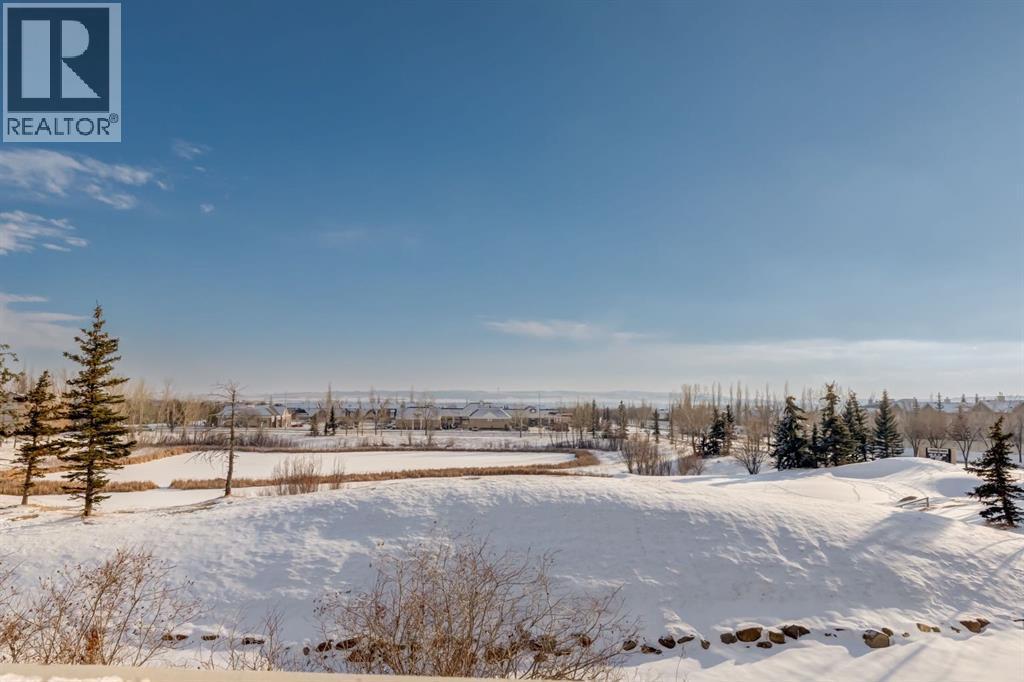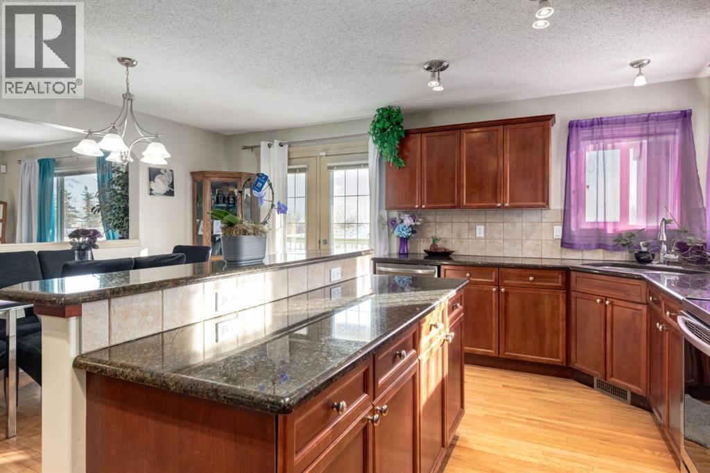 Situated on a peaceful cul-de-sac in coveted Crystal Green this beautiful walkout home is in a perfect location and provides the added privacy and tranquility of backing south onto the golf course with mountain views. This stunning home features endless upgrades including hardwood flooring, central A/C, balconies spanning the length of the house on two levels and is flooded with natural lights through expansive south facing windows. Showcasing stunning curb appeal, and a large front porch, this executive home greets you with a spacious front entryway with room for bench seating. The first thing you notice when you enter this stunning home is a cheerful and bright feel as sun shines through your huge south facing windows that showcase nature. Main floor highlights include a sprawling kitchen with granite countertops, kitchen island with bar seating, and a massive walkthrough pantry with direct access from the oversized garage (with room for trucks, 220V electrical and a heater). The spacious living room boasts a cozy fireplace with tile surround and timeless mantle to creates the perfect place to relax and unwind. Step out from the kitchen onto your massive south facing deck with nearly 400sqft of space, aproviding an incredible oasis to relax, eat dinner, or BBQ in endless sunshine. The main floor is completed by a spacious dining area with room to host large gatherings, and a 2-piece bathroom. Upstairs displays a massive bonus room with soaring vaulted ceiling, which makes the perfect place to enjoy family movie nights. Down the hall contains laundry and your private primary suite with room for king-sized furniture, a massive 5-piece ensuite bathroom with dual vanities, a make-up area, large soaker tub, standup shower, and a patio door leading out to your top-level balcony. The second, sprawling bedroom has room for multiple beds, a desk, and boasts a large 3-piece ensuite, and sunny south facing windows with access to the top floor balcony. Downstairs has been recently updated to include brand new luxury vinyl plank flooring throughout, has multiple windows allowing light to stream into your home – making it feel nothing like a basement. The basement features two large, additional bedrooms, a 3-piece bathroom, and tons of storage. The basement level allows direct access to your backyard which contains a large patio space, landscaping, a spacious dog run, and tons of greenery in the summertime. This one-of-a-kind home is in an unparalleled location at the end of a dead-end street, backs south onto the golf course, showcases mountain views, multiple outdoor spaces, and has been lovingly maintained over the years. This home is steps from a greenspace with playground, is walking distance to multiple schools, Okotoks off leash park, shopping, and the amenities of Crystal Shores Resident’s association, which includes lake access, fishing, and skating activities. Additional upgrades include an HRV, A/C (2023), newer hot water tank, and a new furnace (2023). (id:6769)