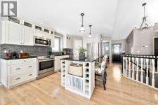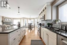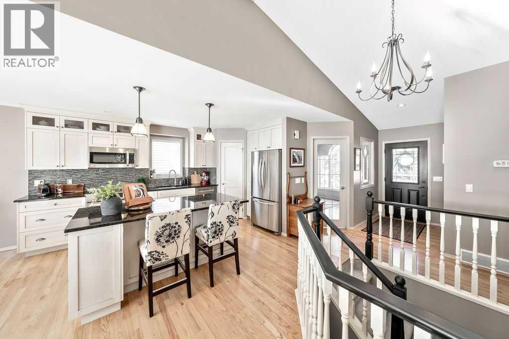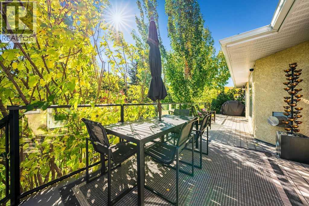 This executive bungalow is tucked away in a quiet cul-de-sac in the highly sought-after community of Bow Meadows in Cochrane — just steps to the beautiful Bow River and backing onto green space and a playground. With nearly 3,000 square feet of developed living space, homes like this rarely come to market! Proudly offered by the original owner, this home showcases warmth, care, and thoughtful updates throughout. The spacious front foyer welcomes you in, alongside a bright front office ideal for working from home. The renovated kitchen features maple cabinetry, granite countertops, and a large island perfect for entertaining and everyday living. Stainless steel appliances complete the space, including a new Bosch dishwasher (Dec 2025). The living room is centered around a cozy gas fireplace, while vaulted ceilings enhance the sense of light and openness across the main floor. The dining area flows seamlessly onto the expansive 40’ deck finished in Duradek with glass railings — an incredible outdoor space for relaxing or hosting. The generous primary bedroom also offers French door access to the deck, leading to your hot tub (2020) — the perfect retreat at the end of the day. The renovated primary ensuite includes a beautiful shower and a large soaker tub. A second bedroom completes the main level. The fully developed lower level offers exceptional flexibility with a spacious family room, flex area, two additional bedrooms, and a renovated bathroom. The large laundry room with a sink, provides plenty of space and functionality. Additional property features include: Hunter Douglas blinds, central air conditioning, newer triple-pane windows (2019), new eavestroughs and downspouts (2024) and underground sprinklers. Situated on an expansive, private lot surrounded by mature trees, this property backs onto a playground and picturesque walking paths that connect directly to the Bow River — truly an exceptional setting. This is a rare opportunity in Bow Meadows — book your s howing today! (id:6769)