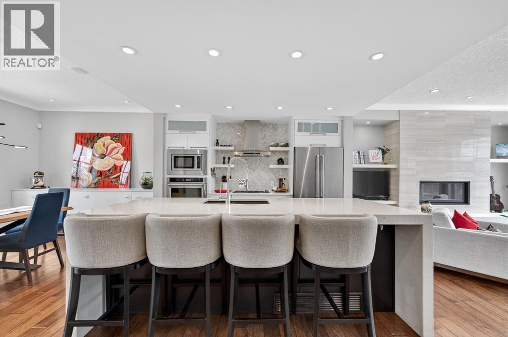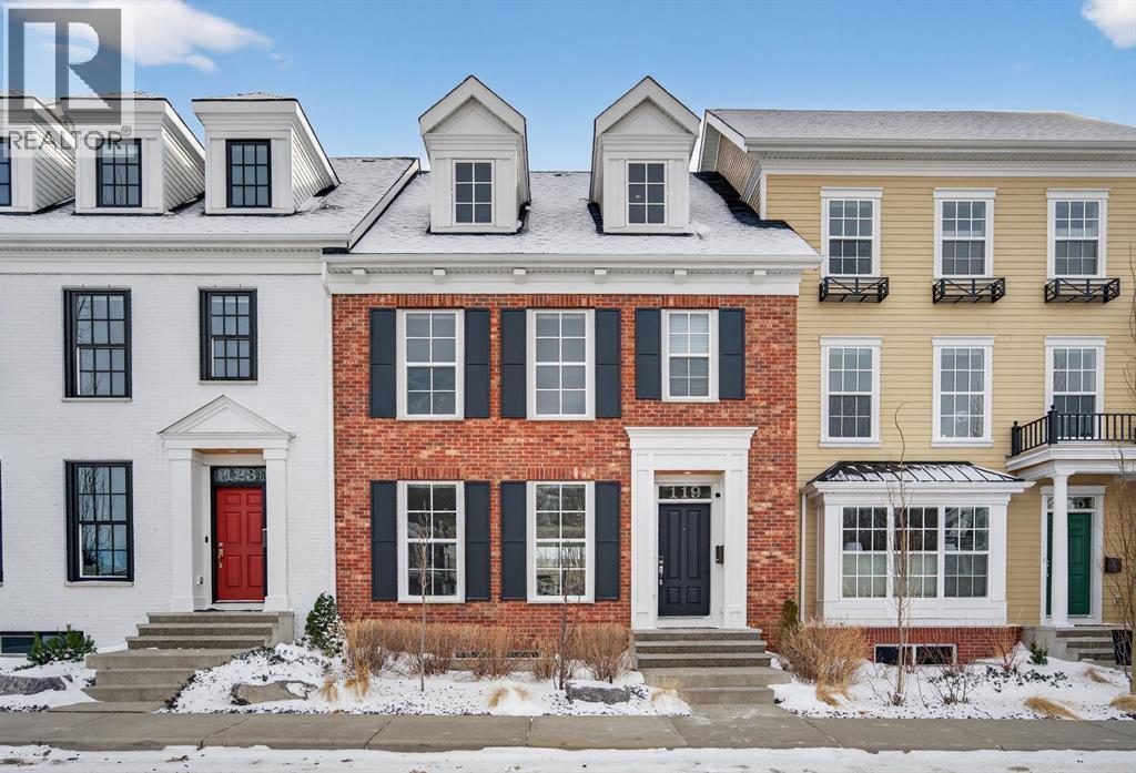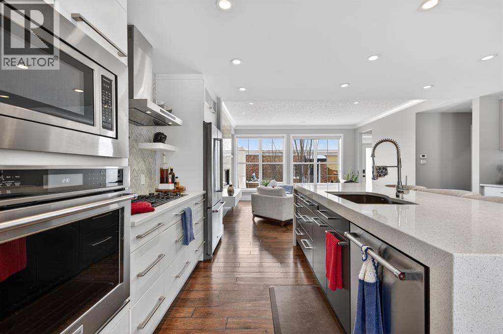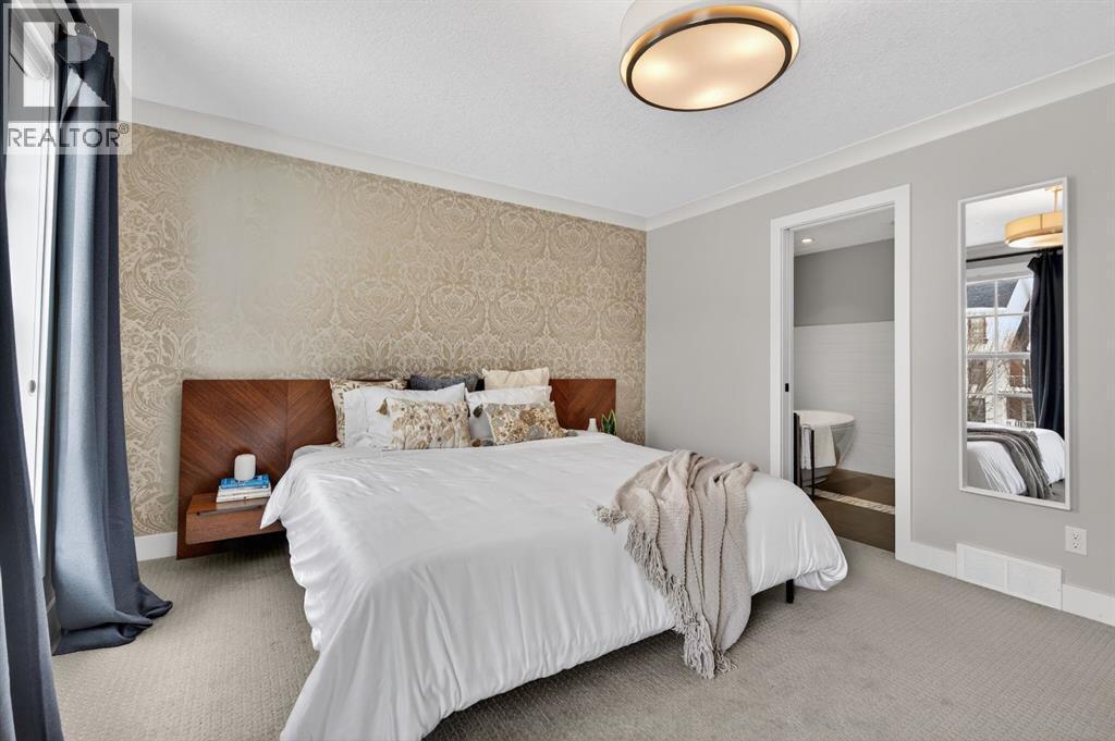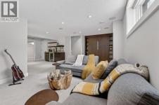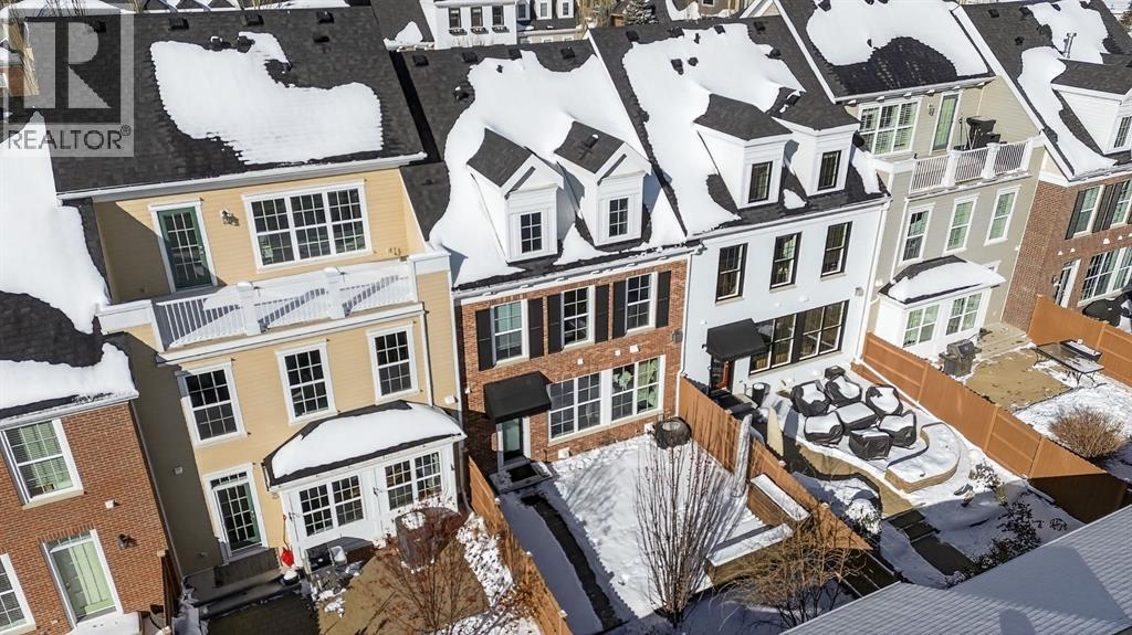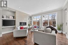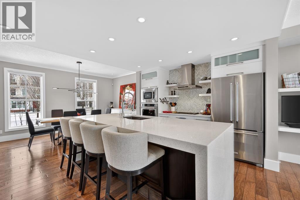 Rare opportunity to own a fully renovated townhouse in the coveted community of Currie Barracks. Flooded with natural light, the main floor showcases hardwood flooring, high ceilings, and a spacious dining area that flows seamlessly into a stunning custom kitchen featuring a quartz waterfall island, built-in stainless steel appliances, buffet with wine fridge, and extensive cabinetry. The oversized living room is anchored by a gas fireplace with a beautiful stone mantle and custom built-ins. Step outside to a thoughtfully designed backyard with a large Kayu hardwood deck and a beautifully landscaped lower garden. The insulated double detached garage is finished with epoxy flooring and custom storage. Upstairs, the primary retreat offers a massive walk-in California Closet and a spa-inspired ensuite with heated floors, soaker tub, separate shower, and dual vanities. A second bedroom with its own ensuite and walk-in closet, plus convenient upper-floor laundry, complete this level. The sprawling third level is ideal as a bedroom, home gym, or recreation room. The thoughtfully designed lower level is designed for entertaining, with a cozy media room, built-in speakers, Murphy bed with shelving, wet bar with wine fridge, and an additional full bathroom. Added highlights include a built-in sound system throughout and air conditioning for year-round comfort. Exceptionally well planned, Currie Barracks offers outstanding schools, scenic walkways, beautiful parks, and a growing collection of restaurants, cafés, and breweries, all just a short 10-minute drive to Downtown Calgary. Perfect for young professionals, this vibrant inner-city community delivers an unbeatable lifestyle. (id:6769)
