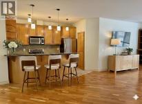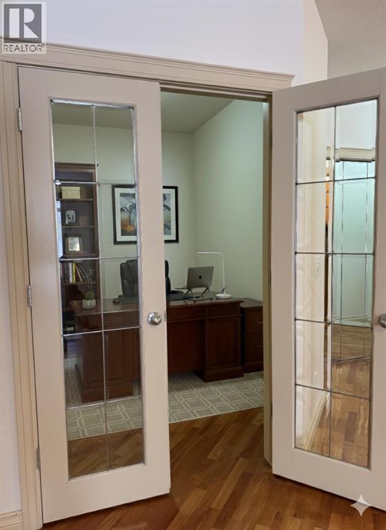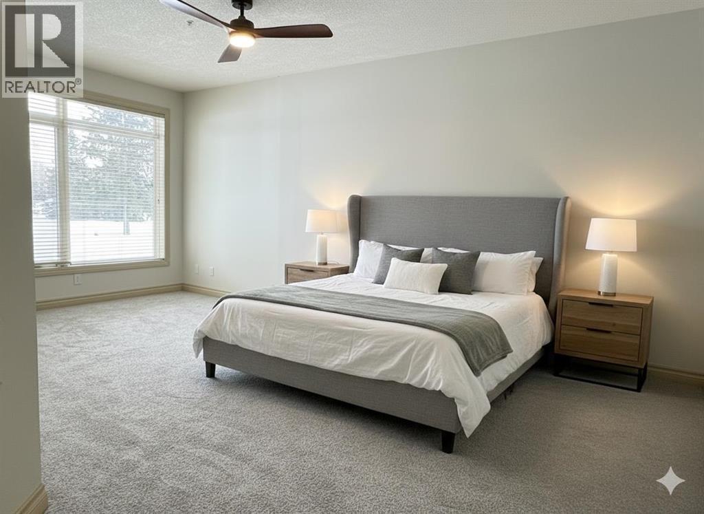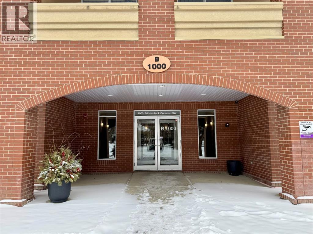 Situated within the sought-after Copperwood complex of Spruce Cliff, this main-level residence offers nearly 1,500 square feet of refined living space backing directly onto the Shaganappi Point Golf Course. The open-concept layout is defined by high ceilings and large windows that provide a bright, airy atmosphere, with hardwood flooring flowing through the great room and dining area. The living space is anchored by a gas fireplace and custom built-ins, offering a warm and inviting focal point. Just off the dining area, a private den is accessed through elegant glass French doors, providing a quiet and versatile space for a home office or library. The kitchen is designed for both style and function, featuring solid-surface countertops, stainless steel appliances, and a pantry complete with a built-in spice rack for optimized storage. The primary suite serves as a quiet retreat with ample space for a king-sized bed, a walk-in closet, and a five-piece ensuite with a soaking tub and separate shower. A generous second bedroom is complemented by a main bathroom featuring a walk-in steam shower, offering a spa-like experience at home. For added convenience, the residence includes a functional laundry room with a stacking washer and dryer and enough additional space for organized storage. This home also includes two underground parking stalls and a dedicated storage locker. Residents of Copperwood enjoy access to the Copper Club, which features a well-equipped gym, meeting room, and social lounge, along with an available guest suite for visitors. Located just minutes from downtown Calgary via Bow Trail, the property offers easy access to public transportation and the various amenities of Westbrook Mall, including Safeway and Starbucks. This home represents a refined lifestyle choice, blending the serenity of golf course views with the convenience of an established urban community. (id:6769)