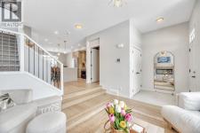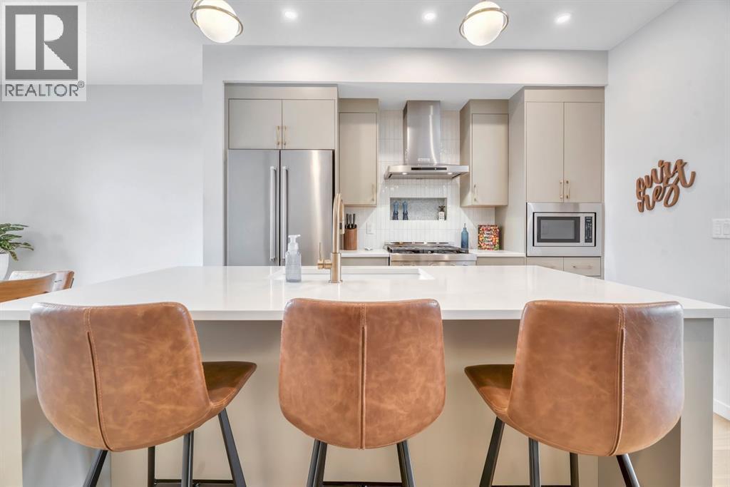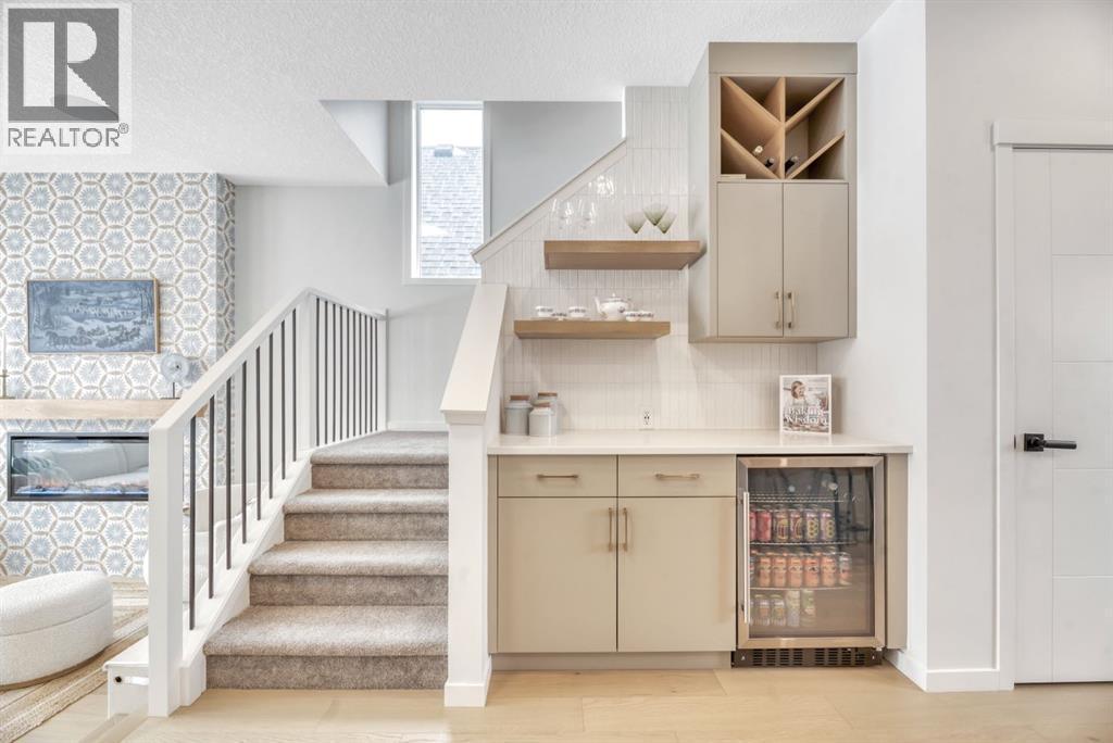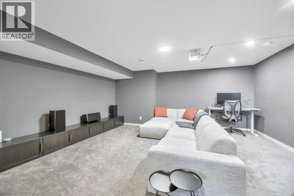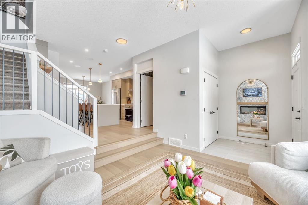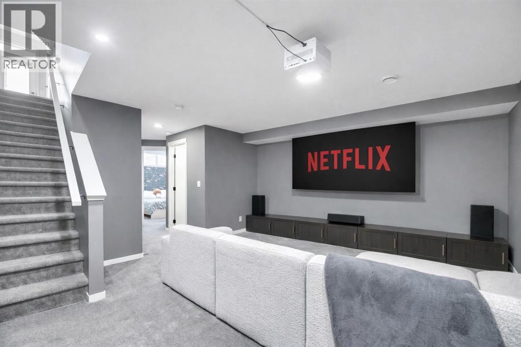 Welcome to an exceptional, fully upgraded Morrison-built residence in the community of Wolf Willow, ideally located steps from Fish Creek Park, scenic pathways, and the Woof Willow dog park. Offering over 2,200 sq. ft. of impeccably finished living space, this home delivers sophisticated design, premium finishes, and a lifestyle rarely found at this price point. Inside, a tiled front entryway sets the tone for the refined interiors, complemented by abundant natural light from numerous oversized, upgraded windows, all dressed with Hunter Douglas light-enhancing sheer shades. The main floor features 9-foot ceilings, with the living room elevated to 10 feet, anchored by a striking floor-to-ceiling tiled fireplace finished with a custom natural oak mantle. Designed with entertaining in mind, the main level includes built-in ceiling speakers throughout, a statement custom dry bar with integrated beverage fridge, oak floating shelves, and an oak wine rack. The chef’s kitchen is both elegant and functional, showcasing KitchenAid appliances, including a smart commercial-style gas range in ink-blue, paneled dishwasher, an impressive 7-foot island, and upgraded white quartz countertops throughout the entire home. White oak engineered hardwood flooring adds warmth and timeless appeal. A designer powder room with moody wallpaper, smart-home Lutron lighting controls throughout, and a generous mudroom with tile flooring, built-in shelving, and shoe storage complete the main level. Upstairs, the primary suite offers a true spa-inspired ensuite, fully tiled in wood-look porcelain with timeless sconce lighting, an oversized soaker tub, and a tiled shower featuring a bench and slide-bar hand shower. Secondary bedrooms are generously proportioned and include custom closet systems. A spacious main bathroom provides abundant storage, while the upgraded upper-level laundry includes premium washer and dryer with additional built-in shelving. The fully developed, purpose-built basement wit h projector is a private entertainment retreat, professionally wired for 15 speakers, creating an immersive home theatre experience. This level also includes a fourth bedroom with 9-foot ceilings and natural light, along with a full third bathroom, ideal for guests or multigenerational living. The south-facing, professionally landscaped backyard provides a private outdoor retreat designed for both entertaining and everyday enjoyment. Features include a modern stone patio (15ft. x 18ft.), a stone walkway (4ft. x 13ft.) leading to the double detached garage, washed rock dog run, and curated mulch garden beds. The double detached garage offers additional storage capacity without compromising functionality. Refined, turnkey, and meticulously upgraded, this Wolf Willow residence offers luxury living with immediate access to Calgary’s most iconic green spaces — a rare opportunity to own a home where design, lifestyle, and location converge. (id:6769)