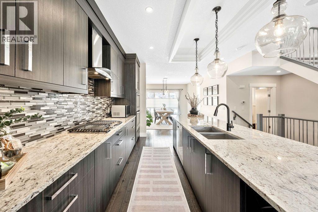 Refined Living, Inner-City! Nestled in the thriving district of Rosscarrock, this meticulously maintained, contemporary two-storey home offers over 3,000 sq. ft. of thoughtfully planned living space. Upon arrival, you’ll notice elevated design and tasteful inclusions. Oversized windows flood the home with natural light, creating a bright, uplifting atmosphere. The free-flowing floorpan transitions from the spacious front dining area to the gourmet kitchen. Here you’ll find high-end finishings including premium engineered hardwood flooring, smooth granite countertops, custom cabinetry, a gas range, double wall oven, Blomberg dishwasher (2025) and French Door refrigerator with in-door-ice + water and an exterior beverage drawer. The eatery flows effortlessly into the inviting family room, complete with custom built-ins, a linear gas fireplace and a practical flex area and 2 piece powered room. Ideal for relaxing and entertaining inside or out on the patio for summer BBQs with a gas hookup in your fully landscaped, private, fenced back yard this home is comfortable through all seasons. The upper level is well appointed with soaring vaulted ceilings that give the stunning primary bedroom a truly upscale feel, complete with a luxurious 5-piece ensuite boasting a stand alone soaker tub, dual vanity and rainfall shower. Two more sizeable bedrooms, and an additional 4-piece bathroom, a dedicated upper level laundry room featuring granite countertops, custom cabinetry and a sink complete the upper level. A highly practical, thoughtfully laid out, fully developed lower level, open to the floor above, continues to impress with 9-foot ceilings, a spacious fourth bedroom, full 4-piece bathroom, a new 50 gallon hot water tank (2025), additional built-ins, including a wet bar and a spacious entertainment room have fully finished this basement. Throughout the home, you’ll appreciate elegant inclusions and attention to detail, with:* Ceiling flush-mounted speakers;* In-floor heati ng in the primary ensuite and lower level bath;* Central Air;* Designer light fixtures,* Upgraded kitchen & bathroom taps & faucets;* Abundant storage and spacious walk-in closets;* Additional storage under the stairs;* A truly elevated primary + ensuite retreat;* Mature landscaping with a Brandon elm, cluster of columnar aspens in the front, and a red rocket maple out back;* Double detached garage and much more.This property offers exceptional value for buyers, investors, and those seeking more space with unmatched convenience. Positioned on a comfortable lot mere minutes from downtown, you’ll enjoy quick access to major routes, public transit, shopping, great schools, and pleasant parks. Nearby amenities along 17th Avenue SW, local restaurants, and green spaces make everyday living easy and enjoyable here. WELCOME HOME! **OPEN HOUSE SATURDAY, March 7th 2-4pm!** (id:6769)
