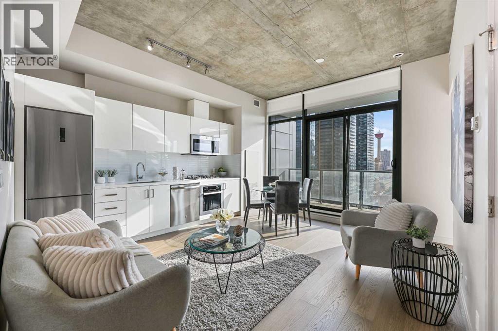 Experience elevated urban living at 6th and Tenth, perfectly positioned in the heart of Calgary’s vibrant Beltline district. This striking high-rise blends sleek contemporary architecture with an unbeatable inner-city location—offering an exceptional opportunity for savvy investors and lifestyle-driven buyers alike. This intelligently designed 415 sq. ft. one-bedroom, one-bathroom residence proves that great things come in perfectly optimized packages. The east-facing orientation frames stunning views of the iconic Calgary Tower and the glittering downtown skyline. Floor-to-ceiling windows flood the space with natural light, creating an airy, inviting ambiance from morning to night. Inside, a bold modern-industrial aesthetic sets the tone. Exposed 9-foot concrete ceilings and feature walls deliver character and edge, while the open-concept layout maximizes every square foot for both comfort and functionality. Central air conditioning ensures effortless year-round comfort—an added luxury in urban condo living. Residents enjoy access to an impressive collection of premium amenities, including a fully equipped fitness centre, a stunning outdoor terrace with a swimming pool, and a stylish entertainment lounge with shared kitchen—ideal for hosting friends or unwinding above the city buzz. Even more compelling: short-term rentals such as Airbnb and Vrbo are permitted, offering flexibility and attractive income potential for investors or part-time residents. Whether you’re seeking a chic urban retreat, a turnkey investment, or a foothold in one of Calgary’s most dynamic neighborhoods, this residence delivers exceptional value and undeniable appeal. Opportunities like this don’t last. Secure your place in Calgary’s thriving urban core today. (id:6769)