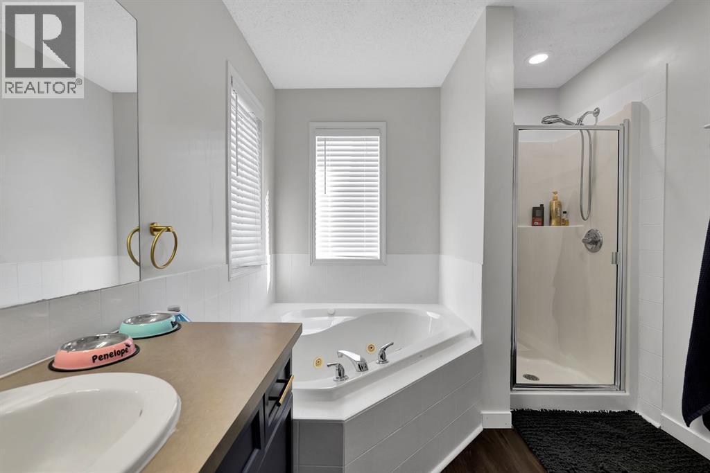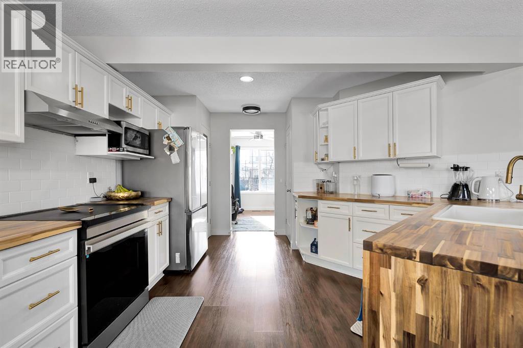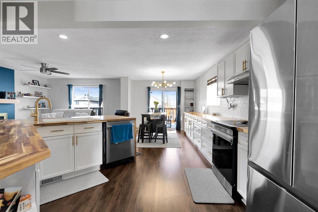 Set on a quiet street in Morningside, this walk out two storey combines a family friendly location with serious value added upgrades and standout utility. Nearly 1600 square feet above grade is paired with a walk out basement and an oversized 23x23 heated insulated garage with 220V power, making this home a strong fit for families who want space, function, and long term flexibility.The main floor is bright and functional with a versatile front flex space, a welcoming living room with gas fireplace, and a spacious kitchen and dining area ideal for everyday living and entertaining. The kitchen has been thoughtfully refreshed with upgraded countertops, a new kitchen sink and faucet, updated cabinet hardware, and all new premium appliances, creating a clean modern workspace with plenty of storage and prep space. Off the dining area, step onto the airy 250 square foot deck, perfect for summer BBQs and outdoor gatherings.Upstairs you will find three bedrooms, including a generous primary suite with walk in closet and full ensuite featuring a corner two person jetted tub and separate shower. Two additional bedrooms are connected by a Jack and Jill full bathroom, and the upper level laundry adds convenience.Recent interior upgrades include fresh paint throughout, updated lighting with LED fixtures, upgraded flooring throughout, upgraded stair finishes with quality vinyl plank, premium carpet in all bedrooms, upgraded toilets, and upgraded sinks taps and vanities in every bathroom except the primary ensuite. Additional updates include a replaced front porch window, updated front porch steps and railings, and added subfloor in the basement.Major efficiency and mechanical improvements include attic insulation topped up to slightly above R60, professional roof maintenance and inspection, a larger high efficiency natural gas hot water tank installed about three years ago, and upgraded HVAC including a high efficiency furnace with allergy filter, built in humidifier, and a hi gh efficiency air conditioning unit.A well updated home in a great location close to schools, parks, pathways, bike trails and a pond. (id:6769)