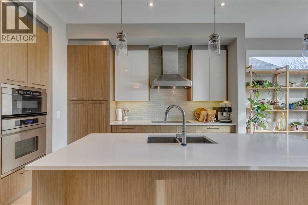 If you’ve been waiting for a home that truly captures breathtaking skyline views plus overlooking South Calgary Park from multiple private decks, patio and terraces while offering exceptional indoor and outdoor living, your search ends here. Expertly crafted, this striking three-storey residence in sought-after South Calgary is move-in ready and designed to impress at every turn.Inside, wide-plank hardwood floors flow seamlessly throughout the upper three levels and stairs, complementing the home’s sophisticated, contemporary aesthetic. The Scandinavian interior design is defined by a minimalist, functional but cozy aesthetic with emphasis on clean lines and bright, airy spaces. The main living room is anchored by a dramatic floor-to-ceiling tiled fireplace, creating a warm yet refined focal point.The chef-inspired kitchen is both functional and stunning, boasting a massive quartz island, a built-in 48” refrigerator, Dacor wall oven, microwave drawer, induction cooktop, and premium finishes throughout. The adjacent dining space easily accommodates a full-sized table, making it ideal for hosting memorable gatherings.The second level offers a serene primary retreat complete with a custom walk-in closet worthy of a boutique and a spa-like ensuite featuring a deep soaker tub, curbless glass shower, and double quartz vanity. Additional bedrooms, a full bath, and a convenient laundry room with sink complete this floor.The top level elevates the lifestyle even further with a bonus family room, an additional bedroom, a powder room, and those show-stopping views from both terraces—perfect for morning coffee, sunset cocktails, or summer entertaining.The fully developed basement extends your living space with a large family room, wet bar, fifth bedroom with generous storage, full bathroom, and additional under-stair storage.Outdoors, enjoy a fully fenced and professionally landscaped yard with a spacious deck and thoughtfully designed privacy screens. The detached double garage is insulated and drywalled, and central air conditioning keeps the home comfortable all summer long.Located just minutes to downtown, easy access to the major roads and a short stroll to the vibrant shops and dining of Marda Loop, this is elevated inner-city living at its finest. This is more than a home—it’s a statement. (id:6769)
