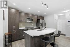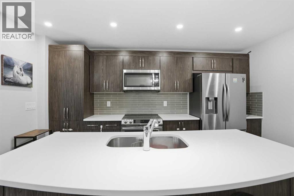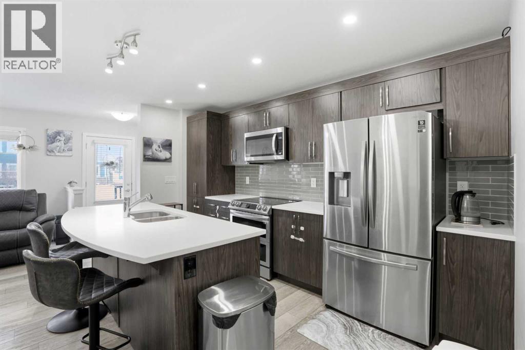 Stop scrolling. This is the one.Welcome to this 3-bedroom, 2.5-bath end-unit townhome in Yorkville SW, with NO condo fees and over 1,500 sq ft of smart, functional living space designed for real life.Let’s talk layout.The open-concept main floor was built to host. A bright kitchen with white quartz countertops, stainless steel appliances, sleek track lighting, and a statement island that says, “pull up a chair and stay awhile.” The dining area is elevated with a modern chandelier, and luxury vinyl plank flooring runs throughout, durable, stylish, and ready for whatever life throws at it.Upstairs? Exactly what buyers want.Three generously sized bedrooms. Two full baths. A bonus flex space perfect for a home office, kids’ study zone, or cozy reading nook. The primary suite delivers with a spacious walk-in closet and private ensuite. And yes, upper-floor laundry for everyday convenience.The unfinished basement offers great space of future opportunity, complete with high ceilings and rough-in plumbing. Gym? Media room? A rear mudroom connects seamlessly to your full-sized double garage, because function matters.Location? Steps to transit and parks, Minutes to Stoney Trail. Quick access to major routes. Yorkville is one of Calgary’s growing southwest communities, with future parks, playgrounds, retail, and pathways underway. Schools, groceries, restaurants, and Fish Creek Park are all within easy reach.End unit. No condo fees. Double garage. Sun-filled backyard. Future growth.Opportunities like this don’t sit around.Book your showing today! (id:6769)
